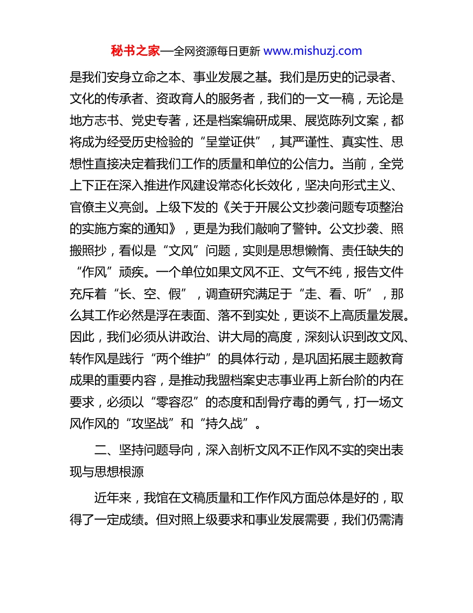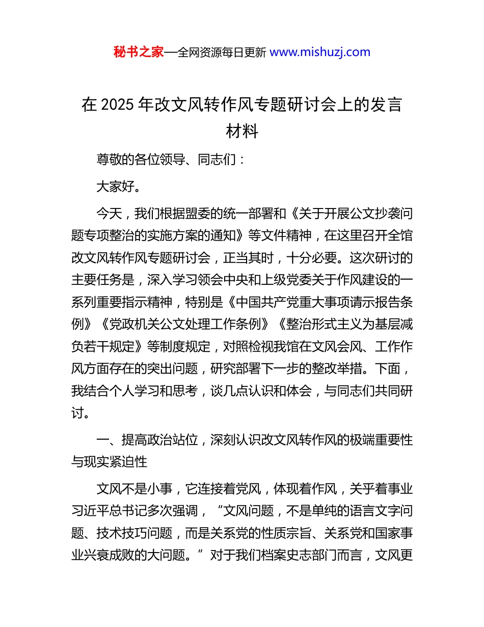 秘书之家—全网资源每日更新 www.mishuzj.com在 2025 年改文风转作风专题研讨会上的发言材料尊敬的各位领导、同志们:大家好。今天,我们根据盟委的统一部署和《关于开展公文抄袭问题专项整治的实施方案的通知》等文件精神,在这里召开全馆改文风转作风专题研讨会,正当其时,十分必要。这次研讨的主要任务是,深入学习领会中央和上级党委关于作风建设的一系列重要指示精神,特别是《中国共产党重大事项请示报告条例》《党政机关公文处理工作条例》《整治形式主义为基层减负若干规定》等制度规定,对照检视我馆在文风会风、工作作风方面存在的突出问题,研究部署下一步的整改举措。下面,我结合个人学习和思考,谈几点认识和体会,与同志们共同研讨。一、提高政治站位,深刻认识改文风转作风的极端重要性与现实紧迫性文风不是小事,它连接着党风,体现着作风,关乎着事业习近平总书记多次强调,“文风问题,不是单纯的语言文字问题、技术技巧问题,而是关系党的性质宗旨、关系党和国家事业兴衰成败的大问题。”对于我们档案史志部门而言,文风更秘书之家—全网资源每日更新 www.mishuzj.com是我们安身立命之本、事业发展之基。我们是历史的记录者、文化的传承者、资政育人的服务者,我们的一文一稿,无论是地方志书、党史专著,还是档案编研成果、展览陈列文案,都将成为经受历史检验的“呈堂证供”,其严谨性、真实性、思想性直接决定着我们工作的质量和单位的公信力。当前,全党上下正在深入推进作风建设常态化长效化,坚决向形式主义、官僚主义亮剑。上级下发的《关于开展公文抄袭问题专项整治的实施方案的通知》,更是为我们敲响了警钟。公文抄袭、照搬照抄,看似是“文风”问题,实则是思想懒惰、责任缺失的“作风”顽疾。一个单位如果文风不正、文气不纯,报告文件充斥着“长、空、假”,调查研究满足于“走、看、听”,那么其工作必然是浮在表面、落不到实处,更谈不上高质量发展。因此,我们必须从讲政治、讲大局的高度,深刻认识到改文风、转作风是践行“两个维护”的具体行动,是巩固拓展主题教育成果的重要内容,是推动我盟档案史志事业再上新台阶的内在要求,必须以“零容忍”的态度和刮骨疗毒的勇气,打一场文风作风的“攻坚战”和“持久战”。二、坚持问题导向,深入剖析文风不正作风不实的突出表现与思想根源近年来,我馆在文稿质量和工作作风方面总体是好的,取得了一定成绩。但对照上级要求和事业发展需要,我们仍需清秘书之家—全网资源每日更新 www.mishuzj.com醒地看到,一些深层次的问题依然不同程度地存在,必须敢于正视、深入剖析。一是“抄”的问题依然存在,创新意识不足。有的同志习惯于当“搬运工”,写材料不去深入思考,而是上网搜、向下要、左右看,把别人的东西改个标题、换个地名就当成自己的成果,导致文件“千人一面”,缺乏针对性和独创性。尤其是在一些常规性工作总结、信息简报中,套话连篇,看似面面俱到,实则毫无新意。这种“拿来主义”的背后,是思想上的“懒惰病”,是能力上的“恐慌症”。二是“长”的问题比较突出,言之无物。部分文稿追求篇幅、贪大求全,动辄数千上万字,引经据典,穿靴戴帽,看似体系庞大、逻辑严密,但真正属于自己的思考、能够解决实际问题的“干货”却寥寥无几。有的调研报告,前面大段篇幅铺陈背景、阐述意义,中间罗列现象、不作分析,最后提出一些放之四海而皆准的“万能”建议,耗费了大量精力,却对决策起不到实质性参考作用。这反映出我们抓不住重点、提炼不出观点的能力短板。三是“空”的问题尚未杜绝,脱离实际。有的文件语言晦涩、概念堆砌,习惯于用“高度重视”“切实加强”“狠抓落实”等模糊性词语,缺乏可量化、可操作的具体措施。我们在一些项目规划、工作方案中,对标对表多,立足我馆、我盟实秘书之家—全网资源每日更新 www.mishuzj.com际的分析少;宏观论述多,针对馆藏特色、地方历史文化底蕴的微观切入少。文稿与实际工作“两张皮”,文件在内部空转,没有真正转化为推动工作的强大动力。四是“假”的问题需要警惕,作风漂浮。虽然主观造假的情况极少,但研究不深、调研不透导致的...