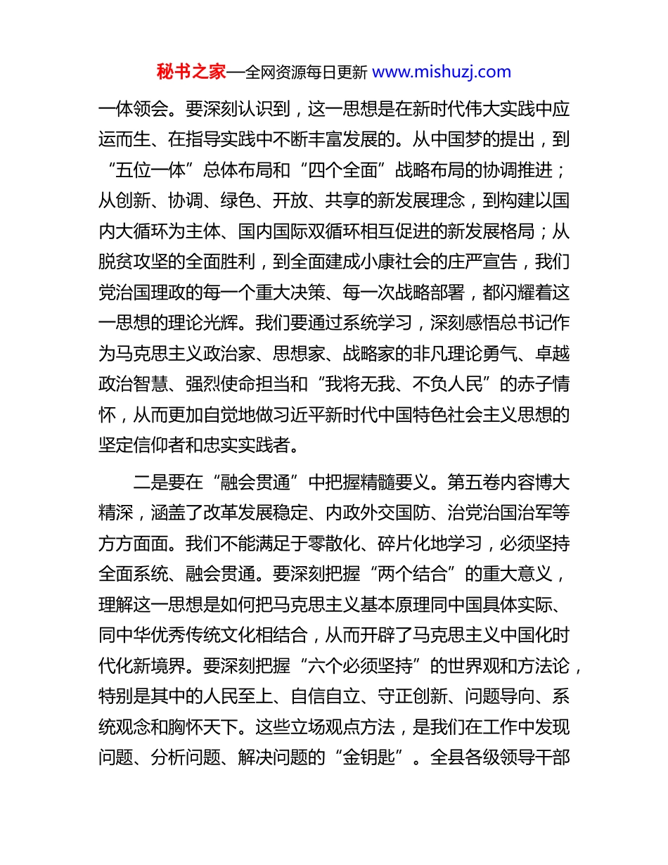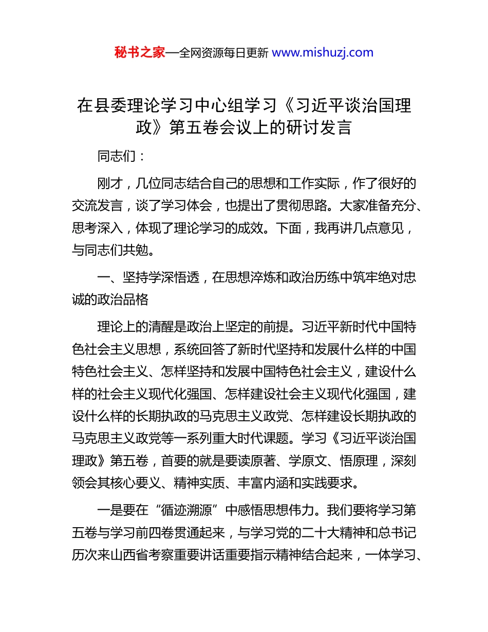 秘书之家—全网资源每日更新 www.mishuzj.com在县委理论学习中心组学习《习近平谈治国理政》第五卷会议上的研讨发言同志们:刚才,几位同志结合自己的思想和工作实际,作了很好的交流发言,谈了学习体会,也提出了贯彻思路。大家准备充分、思考深入,体现了理论学习的成效。下面,我再讲几点意见,与同志们共勉。一、坚持学深悟透,在思想淬炼和政治历练中筑牢绝对忠诚的政治品格理论上的清醒是政治上坚定的前提。习近平新时代中国特色社会主义思想,系统回答了新时代坚持和发展什么样的中国特色社会主义、怎样坚持和发展中国特色社会主义,建设什么样的社会主义现代化强国、怎样建设社会主义现代化强国,建设什么样的长期执政的马克思主义政党、怎样建设长期执政的马克思主义政党等一系列重大时代课题。学习《习近平谈治国理政》第五卷,首要的就是要读原著、学原文、悟原理,深刻领会其核心要义、精神实质、丰富内涵和实践要求。一是要在“循迹溯源”中感悟思想伟力。我们要将学习第五卷与学习前四卷贯通起来,与学习党的二十大精神和总书记历次来山西省考察重要讲话重要指示精神结合起来,一体学习、秘书之家—全网资源每日更新 www.mishuzj.com一体领会。要深刻认识到,这一思想是在新时代伟大实践中应运而生、在指导实践中不断丰富发展的。从中国梦的提出,到“五位一体”总体布局和“四个全面”战略布局的协调推进;从创新、协调、绿色、开放、共享的新发展理念,到构建以国内大循环为主体、国内国际双循环相互促进的新发展格局;从脱贫攻坚的全面胜利,到全面建成小康社会的庄严宣告,我们党治国理政的每一个重大决策、每一次战略部署,都闪耀着这一思想的理论光辉。我们要通过系统学习,深刻感悟总书记作为马克思主义政治家、思想家、战略家的非凡理论勇气、卓越政治智慧、强烈使命担当和“我将无我、不负人民”的赤子情怀,从而更加自觉地做习近平新时代中国特色社会主义思想的坚定信仰者和忠实实践者。二是要在“融会贯通”中把握精髓要义。第五卷内容博大精深,涵盖了改革发展稳定、内政外交国防、治党治国治军等方方面面。我们不能满足于零散化、碎片化地学习,必须坚持全面系统、融会贯通。要深刻把握“两个结合”的重大意义,理解这一思想是如何把马克思主义基本原理同中国具体实际、同中华优秀传统文化相结合,从而开辟了马克思主义中国化时代化新境界。要深刻把握“六个必须坚持”的世界观和方法论,特别是其中的人民至上、自信自立、守正创新、问题导向、系统观念和胸怀天下。这些立场观点方法,是我们在工作中发现问题、分析问题、解决问题的“金钥匙”。全县各级领导干部秘书之家—全网资源每日更新 www.mishuzj.com都要把自己摆进去、把职责摆进去、把工作摆进去,真正学出坚定信念、学出绝对忠诚、学出使命担当。三是要在“知行合一”中提高政治能力。理论学习的最终目的在于指导实践。衡量我们学习成效的根本标尺,是看我们是否能够不断提高政治判断力、政治领悟力、政治执行力。政治判断力,就是要善于从纷繁复杂的矛盾中把握政治逻辑,在大是大非面前保持清醒头脑,始终在政治立场、政治方向、政治原则、政治道路上同党中央保持高度一致。政治领悟力,就是要对“国之大者”了然于胸,深刻领会党中央的战略意图和决策部署,确保我们*的工作始终沿着总书记指引的正确方向前进。政治执行力,就是要把党中央的决策部署、省委常委的工作要求,不折不扣、雷厉风行地落到实处,做到令行禁止、政令畅通。通过学习,我们要更加深刻领悟“两个确立”的决定性意义,更加自觉地增强“四个意识”、坚定“四个自信”、做到“两个维护”,确保*的各项事业始终是党的事业的重要组成部分。二、聚焦发展要务,在实干担当和攻坚克难中开创高质量发展新局面学习贯彻新思想,最终要体现在推动高质量发展的实际成效上。当前,我们正处在 2025 年的最后一个季度,这也是“十四五”规划的收官之年。时间紧、任务重,我们必须切实秘书之家—全网资源每日更新 www.mishuzj.com把学习成果转化为谋划发展的正确思路、促进发展的政策举措、领导发展的实际能力,全力以赴抓好各项工...