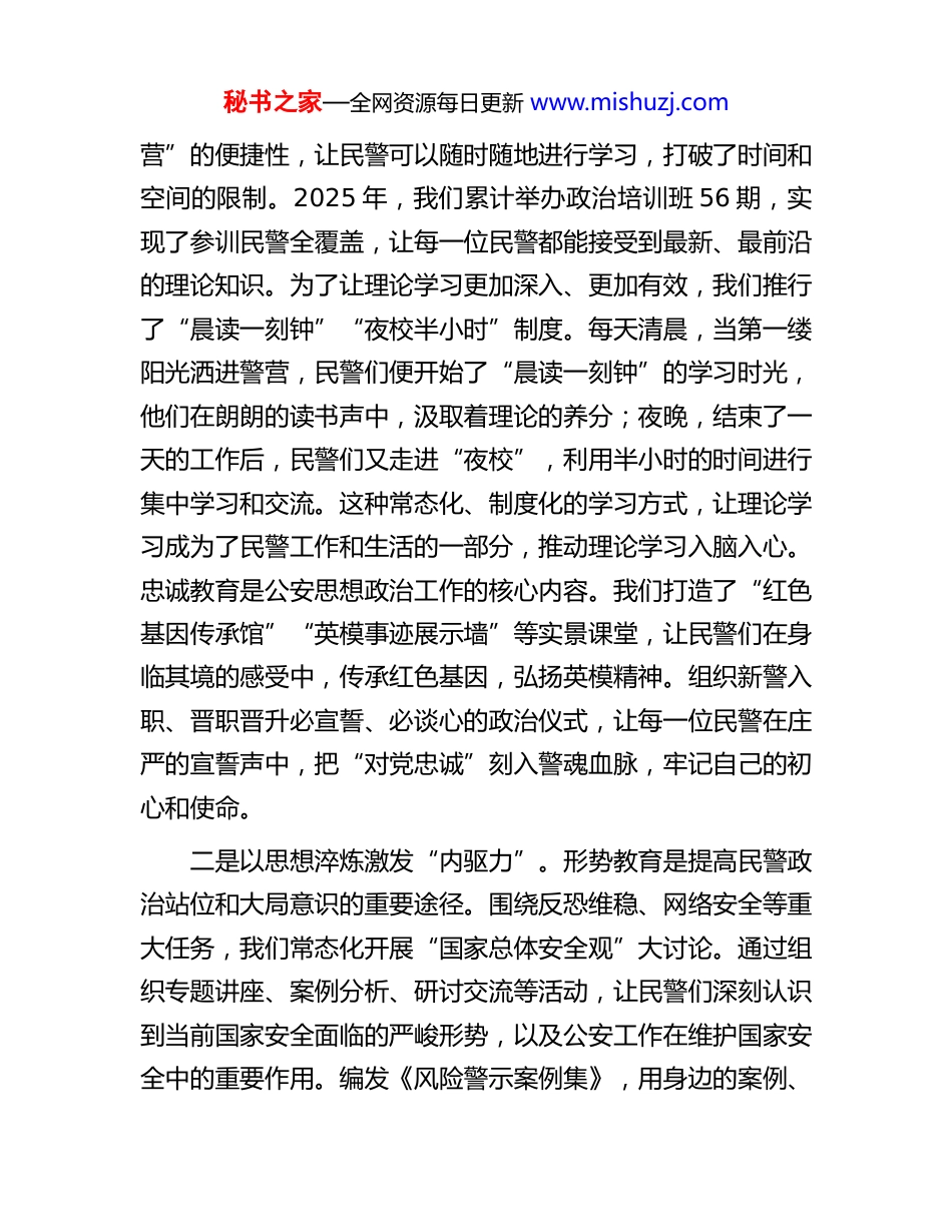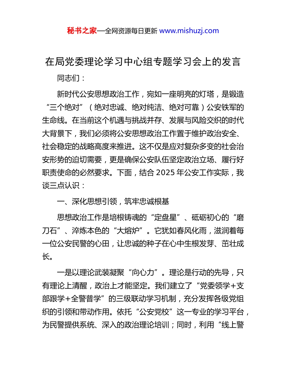 秘书之家—全网资源每日更新 www.mishuzj.com在局党委理论学习中心组专题学习会上的发言同志们:新时代公安思想政治工作,宛如一座明亮的灯塔,是锻造“三个绝对”(绝对忠诚、绝对纯洁、绝对可靠)公安铁军的生命线。在当前这个机遇与挑战并存、发展与风险交织的时代大背景下,我们必须将公安思想政治工作置于维护政治安全、社会稳定的战略高度来推进。这不仅是应对复杂多变的社会治安形势的迫切需要,更是确保公安队伍坚定政治立场、履行好职责使命的必然要求。下面,结合 2025 年公安工作实际,我谈三点认识:一、深化思想引领,筑牢忠诚根基思想政治工作是培根铸魂的“定盘星”、砥砺初心的“磨刀石”、淬炼本色的“大熔炉”。它犹如春风化雨,滋润着每一位公安民警的心田,让忠诚的种子在心中生根发芽、茁壮成长。一是以理论武装凝聚“向心力”。理论是行动的先导,只有理论上清醒,政治上才能坚定。我们建立了“党委领学+支部跟学+全警普学”的三级联动学习机制,充分发挥各级党组织的引领和带动作用。依托“公安党校”这一专业的学习平台,为民警提供系统、深入的政治理论培训;同时,利用“线上警秘书之家—全网资源每日更新 www.mishuzj.com营”的便捷性,让民警可以随时随地进行学习,打破了时间和空间的限制。2025 年,我们累计举办政治培训班 56 期,实现了参训民警全覆盖,让每一位民警都能接受到最新、最前沿的理论知识。为了让理论学习更加深入、更加有效,我们推行了“晨读一刻钟”“夜校半小时”制度。每天清晨,当第一缕阳光洒进警营,民警们便开始了“晨读一刻钟”的学习时光,他们在朗朗的读书声中,汲取着理论的养分;夜晚,结束了一天的工作后,民警们又走进“夜校”,利用半小时的时间进行集中学习和交流。这种常态化、制度化的学习方式,让理论学习成为了民警工作和生活的一部分,推动理论学习入脑入心。忠诚教育是公安思想政治工作的核心内容。我们打造了“红色基因传承馆”“英模事迹展示墙”等实景课堂,让民警们在身临其境的感受中,传承红色基因,弘扬英模精神。组织新警入职、晋职晋升必宣誓、必谈心的政治仪式,让每一位民警在庄严的宣誓声中,把“对党忠诚”刻入警魂血脉,牢记自己的初心和使命。二是以思想淬炼激发“内驱力”。形势教育是提高民警政治站位和大局意识的重要途径。围绕反恐维稳、网络安全等重大任务,我们常态化开展“国家总体安全观”大讨论。通过组织专题讲座、案例分析、研讨交流等活动,让民警们深刻认识到当前国家安全面临的严峻形势,以及公安工作在维护国家安全中的重要作用。编发《风险警示案例集》,用身边的案例、秘书之家—全网资源每日更新 www.mishuzj.com鲜活的事实,引导民警树牢底线思维,增强忧患意识,提高应对风险挑战的能力。心理疏导是稳定警心、激发民警工作积极性的重要举措。公安工作任务繁重、压力巨大,民警们长期处于高度紧张的工作状态,容易产生心理问题。为此,我们建成了市、县两级民警心理健康服务中心,组建了专业的心理服务团队。针对重大安保、应急处突等任务后,及时对民警进行心理干预和疏导。2025 年,我们成功化解重大心理危机隐患153 起,让民警们能够以更加健康、积极的心态投入到工作中。三是以风险防范构筑“防护网”。政治体检是确保民警政治忠诚、政治可靠的重要手段。我们落实民警思想动态季度分析制度,建立“一人一档”风险台账。通过定期开展谈心谈话、问卷调查、数据分析等方式,全面了解民警的思想动态和工作情况,对苗头性、倾向性问题早预警、早处置。就像医生给病人做体检一样,及时发现问题,及时进行治疗,确保民警的思想健康和政治安全。廉洁教育是防范民警违法违纪的重要防线。我们组织民警旁听职务犯罪庭审,让他们亲眼目睹违法犯罪行为带来的严重后果;观看警示教育片,用生动的画面和真实的案例,给民警们敲响警钟;汇编《公安干警违纪违法典型案例》,让民警们从中汲取教训,引以为戒。通过这些方式,以案为鉴,筑牢民警的廉洁自律防线,确保公安队伍的纯洁性和公正性。秘书之家—全网资源每日更新 www.mishuzj.com二、聚焦主责主业,抓实关键环节用好...