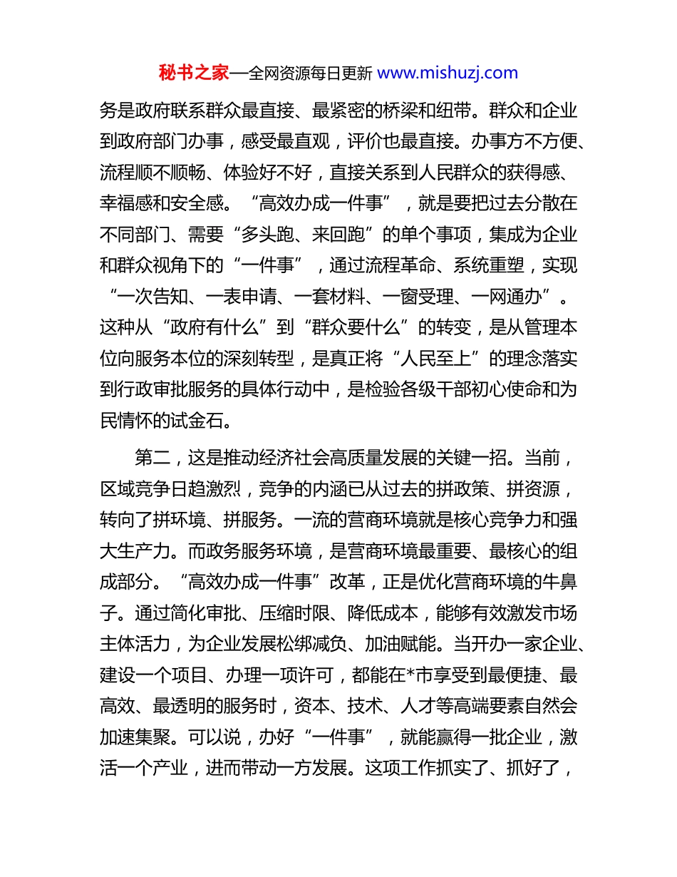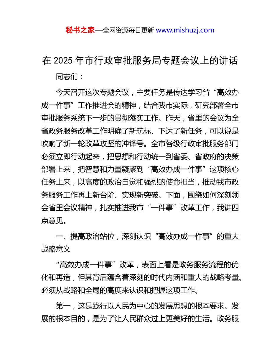 秘书之家—全网资源每日更新 www.mishuzj.com在 2025 年市行政审批服务局专题会议上的讲话同志们:今天召开这次专题会议,主要任务是传达学习省“高效办成一件事”工作推进会的精神,结合我市实际,研究部署全市审批服务系统下一步的贯彻落实工作。昨天,省里的会议为全省政务服务改革工作明确了新航标、下达了新任务,可以说是吹响了新一轮改革攻坚的冲锋号。全市各级行政审批服务部门必须立即行动起来,把思想和行动统一到省委、省政府的决策部署上来,把智慧和力量凝聚到“高效办成一件事”这项核心任务上来,以高度的政治自觉和强烈的使命担当,推动我市政务服务工作再上新台阶、实现新突破。下面,围绕如何深刻领会省里会议精神,扎实推进我市“一件事”改革工作,我讲四点意见。一、提高政治站位,深刻认识“高效办成一件事”的重大战略意义“高效办成一件事”改革,表面上看是政务服务流程的优化和再造,但其背后蕴含着深刻的时代内涵和重大的战略考量。必须从战略和全局的高度来认识和把握这项工作。第一,这是践行以人民为中心的发展思想的根本要求。发展的根本目的,是为了让人民群众过上更美好的生活。政务服秘书之家—全网资源每日更新 www.mishuzj.com务是政府联系群众最直接、最紧密的桥梁和纽带。群众和企业到政府部门办事,感受最直观,评价也最直接。办事方不方便、流程顺不顺畅、体验好不好,直接关系到人民群众的获得感、幸福感和安全感。“高效办成一件事”,就是要把过去分散在不同部门、需要“多头跑、来回跑”的单个事项,集成为企业和群众视角下的“一件事”,通过流程革命、系统重塑,实现“一次告知、一表申请、一套材料、一窗受理、一网通办”。这种从“政府有什么”到“群众要什么”的转变,是从管理本位向服务本位的深刻转型,是真正将“人民至上”的理念落实到行政审批服务的具体行动中,是检验各级干部初心使命和为民情怀的试金石。第二,这是推动经济社会高质量发展的关键一招。当前,区域竞争日趋激烈,竞争的内涵已从过去的拼政策、拼资源,转向了拼环境、拼服务。一流的营商环境就是核心竞争力和强大生产力。而政务服务环境,是营商环境最重要、最核心的组成部分。“高效办成一件事”改革,正是优化营商环境的牛鼻子。通过简化审批、压缩时限、降低成本,能够有效激发市场主体活力,为企业发展松绑减负、加油赋能。当开办一家企业、建设一个项目、办理一项许可,都能在*市享受到最便捷、最高效、最透明的服务时,资本、技术、人才等高端要素自然会加速集聚。可以说,办好“一件事”,就能赢得一批企业,激活一个产业,进而带动一方发展。这项工作抓实了、抓好了,秘书之家—全网资源每日更新 www.mishuzj.com就是对我市稳增长、促改革、调结构、惠民生最直接、最有效的贡献。第三,这是推进国家治理体系和治理能力现代化的内在要求。“高效办成一件事”改革,绝非简单的物理整合或浅层次的修修补补,而是一场刀刃向内、触及灵魂的政府自我革命。它要求打破长期以来形成的部门壁垒、信息孤岛和利益藩篱,倒逼政府部门进行职能重构、流程再造和业务协同。这其中,涉及授权的调整、数据的共享、标准的统一、系统的对接,每一项都是对传统行政管理模式的巨大挑战,也是对政府协同治理能力的全面考验。推进这项改革,能够有效提升跨部门、跨层级、跨区域的协同办事能力,推动政府运行方式从碎片化、分割化向整体性、协同性转变,这本身就是治理能力现代化的重要标志。可以说,“一件事”改革的深度,决定了政府治理现代化的程度。全市各级审批服务干部,尤其是领导干部,务必要从这三个层面深化认识,切实把“高效办成一件事”作为当前和今后一个时期的“头号工程”来抓,以“功成不必在我”的精神境界和“功成必定有我”的历史担当,坚定不移地把这项改革推向深入。二、坚持问题导向,清醒正视当前改革工作中存在的短板与不足秘书之家—全网资源每日更新 www.mishuzj.com近年来,全市审批服务系统围绕“放管服”改革,做了大量工作,也取得了一定成效,尤其是在“一窗受理”、电子证照应用、线上线下融合等方面,有了一些积极探索,为推进“...