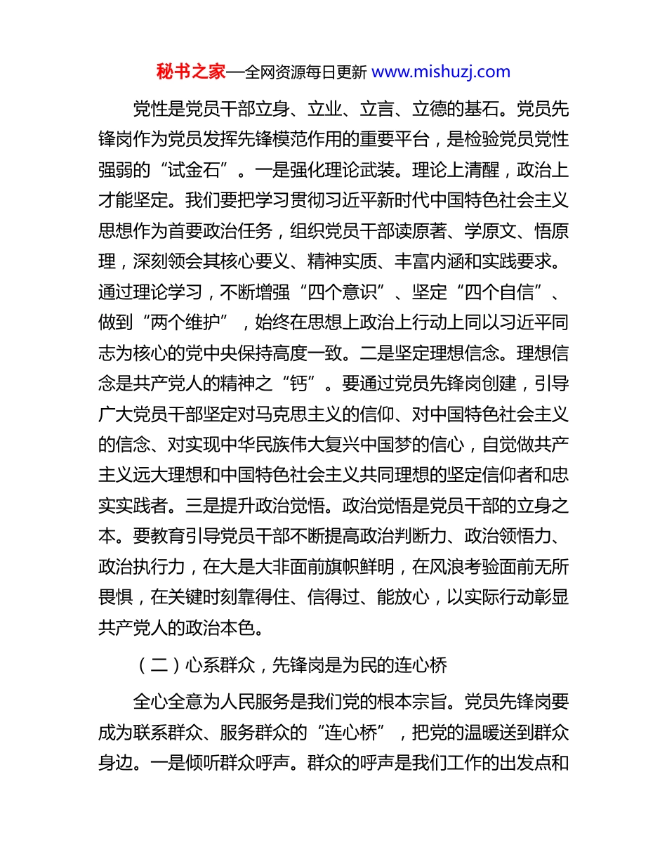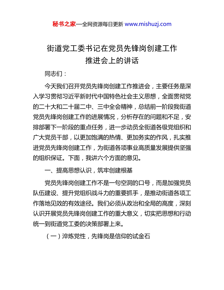 秘书之家—全网资源每日更新 www.mishuzj.com街道党工委书记在党员先锋岗创建工作推进会上的讲话同志们:今天我们召开党员先锋岗创建工作推进会,主要任务是深入学习贯彻习近平新时代中国特色社会主义思想,全面贯彻党的二十大和二十届二中、三中全会精神,总结前一阶段我街道党员先锋岗创建工作的进展情况,分析存在的问题和不足,安排部署下一阶段的重点任务,进一步动员全街道各级党组织和广大党员干部,以更加饱满的热情、更加务实的作风,扎实推进党员先锋岗创建工作,为街道各项事业高质量发展提供坚强的组织保证。下面,我讲六个方面的意见。一、提高思想认识,筑牢创建根基党员先锋岗创建工作不是一句空洞的口号,而是加强党员队伍建设、提升党组织战斗力的重要抓手,是推动街道各项工作落地见效的有效途径。我们必须从政治和全局的高度,深刻认识开展党员先锋岗创建工作的重大意义,切实把思想和行动统一到街道党工委的决策部署上来。(一)淬炼党性,先锋岗是信仰的试金石秘书之家—全网资源每日更新 www.mishuzj.com党性是党员干部立身、立业、立言、立德的基石。党员先锋岗作为党员发挥先锋模范作用的重要平台,是检验党员党性强弱的“试金石”。一是强化理论武装。理论上清醒,政治上才能坚定。我们要把学习贯彻习近平新时代中国特色社会主义思想作为首要政治任务,组织党员干部读原著、学原文、悟原理,深刻领会其核心要义、精神实质、丰富内涵和实践要求。通过理论学习,不断增强“四个意识”、坚定“四个自信”、做到“两个维护”,始终在思想上政治上行动上同以习近平同志为核心的党中央保持高度一致。二是坚定理想信念。理想信念是共产党人的精神之“钙”。要通过党员先锋岗创建,引导广大党员干部坚定对马克思主义的信仰、对中国特色社会主义的信念、对实现中华民族伟大复兴中国梦的信心,自觉做共产主义远大理想和中国特色社会主义共同理想的坚定信仰者和忠实实践者。三是提升政治觉悟。政治觉悟是党员干部的立身之本。要教育引导党员干部不断提高政治判断力、政治领悟力、政治执行力,在大是大非面前旗帜鲜明,在风浪考验面前无所畏惧,在关键时刻靠得住、信得过、能放心,以实际行动彰显共产党人的政治本色。(二)心系群众,先锋岗是为民的连心桥全心全意为人民服务是我们党的根本宗旨。党员先锋岗要成为联系群众、服务群众的“连心桥”,把党的温暖送到群众身边。一是倾听群众呼声。群众的呼声是我们工作的出发点和秘书之家—全网资源每日更新 www.mishuzj.com落脚点。要通过设立党员先锋岗,组织党员干部深入基层、深入群众,与群众面对面交流,心贴心沟通,认真倾听群众的意见建议和诉求,了解群众的所思所想所盼,把群众的“急难愁盼”记在心上、抓在手上。二是解决群众难题。解决群众的实际困难是我们工作的重要目标。要针对群众反映的突出问题,建立问题清单、责任清单、时限清单,明确解决问题的具体措施和责任人,逐一加以解决。对于能够立即解决的,要马上办理;对于一时难以解决的,要向群众说明情况,积极创造条件解决,让群众感受到实实在在的成效。三是增进群众福祉。增进群众福祉是我们工作的最终目的。要结合党员先锋岗的职责,围绕群众关心的就业、教育、医疗、养老、住房等民生问题,积极开展服务活动,为群众办实事、办好事。要通过我们的努力,不断提高群众的获得感、幸福感、安全感。(三)聚力发展,先锋岗是实干的冲锋号发展是党执政兴国的第一要务。党员先锋岗要成为推动街道发展的“冲锋号”,激励广大党员干部在发展一线担当作为、建功立业。一是聚焦中心工作。要把党员先锋岗创建与街道的中心工作紧密结合起来,围绕招商引资、项目建设、城市管理、乡村振兴等重点工作,设立相应的先锋岗,组织党员干部在各自岗位上攻坚克难、奋勇争先,为推动街道经济社会高质量发展贡献力量。二是勇于攻坚克难。发展过程中难免会遇到各种困难和挑战。要通过党员先锋岗创建,引导广大党员干部发扬秘书之家—全网资源每日更新 www.mishuzj.com斗争精神,增强斗争本领,敢于直面困难、勇于担当责任,在矛盾面前不回避,在问题面前不退缩,以“...
