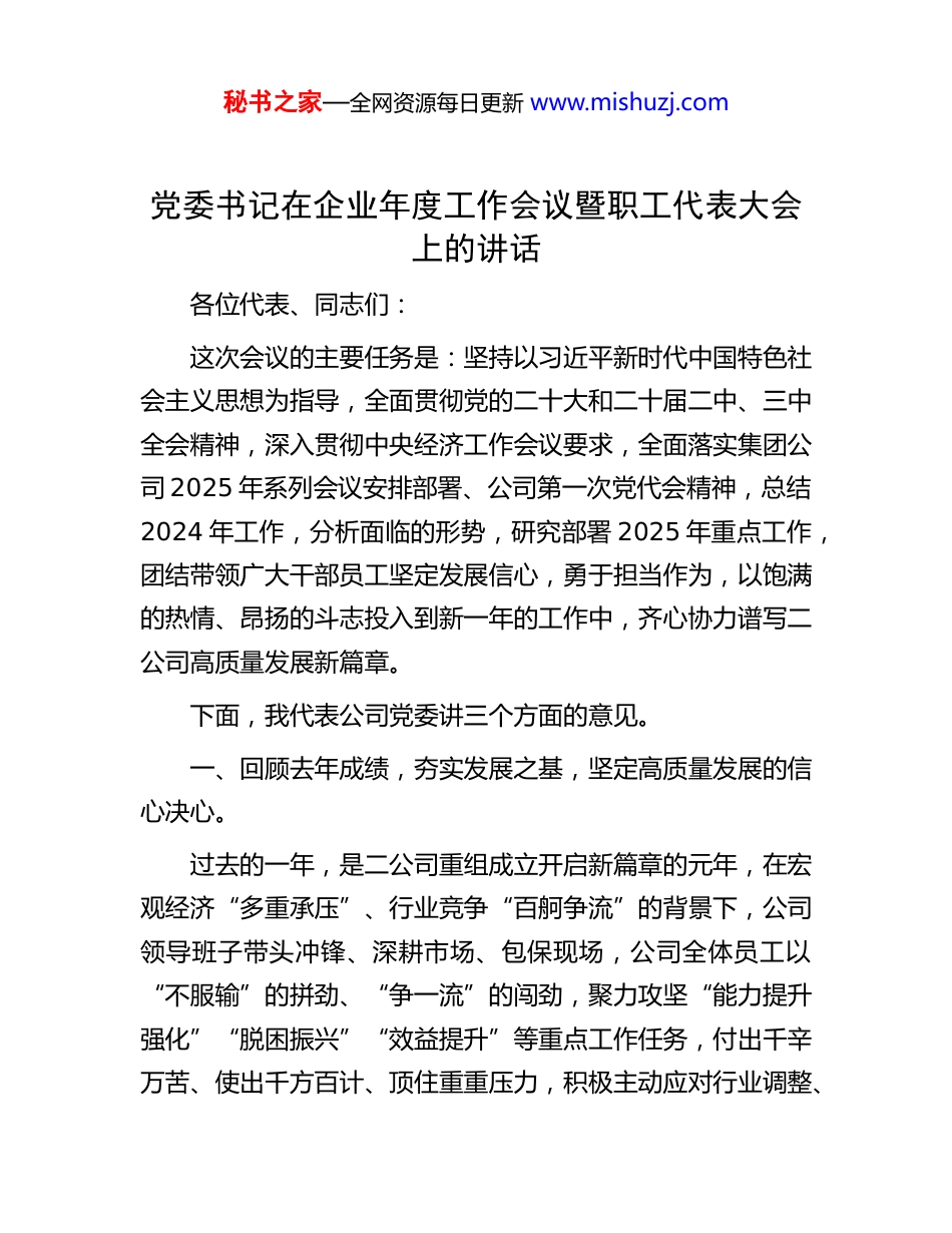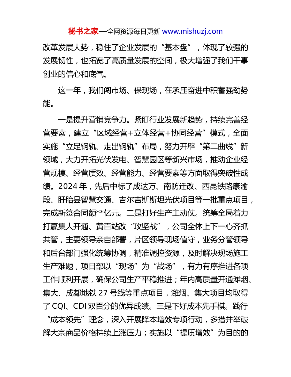 秘书之家—全网资源每日更新 www.mishuzj.com党委书记在企业年度工作会议暨职工代表大会上的讲话各位代表、同志们:这次会议的主要任务是:坚持以习近平新时代中国特色社会主义思想为指导,全面贯彻党的二十大和二十届二中、三中全会精神,深入贯彻中央经济工作会议要求,全面落实集团公司 2025 年系列会议安排部署、公司第一次党代会精神,总结2024 年工作,分析面临的形势,研究部署 2025 年重点工作,团结带领广大干部员工坚定发展信心,勇于担当作为,以饱满的热情、昂扬的斗志投入到新一年的工作中,齐心协力谱写二公司高质量发展新篇章。下面,我代表公司党委讲三个方面的意见。一、回顾去年成绩,夯实发展之基,坚定高质量发展的信心决心。过去的一年,是二公司重组成立开启新篇章的元年,在宏观经济“多重承压”、行业竞争“百舸争流”的背景下,公司领导班子带头冲锋、深耕市场、包保现场,公司全体员工以“不服输”的拼劲、“争一流”的闯劲,聚力攻坚“能力提升强化”“脱困振兴”“效益提升”等重点工作任务,付出千辛万苦、使出千方百计、顶住重重压力,积极主动应对行业调整、秘书之家—全网资源每日更新 www.mishuzj.com改革发展大势,稳住了企业发展的“基本盘”,体现了较强的发展韧性,也拓宽了高质量发展的空间,极大增强了我们干事创业的信心和底气。这一年,我们闯市场、保现场,在承压奋进中积蓄强劲势能。一是提升营销竞争力。紧盯行业发展新趋势,持续完善经营要素,建立“区域经营+立体经营+协同经营”模式,全面实施“立足钢轨、走出钢轨”布局,努力开辟“第二曲线”新领域,大力开拓光伏发电、智慧园区等新兴市场,推动企业经营规模、经营质效、经营能力、经营要素等方面取得突破性成绩。2024 年,先后中标了成达万、南防迁改、西昆铁路康渝段、盱眙县智慧交通、吉尔吉斯斯坦光伏项目等一批重点项目,完成新签合同额**亿元。二是打好生产主动仗。统筹全局着力打赢集大开通、黄百站改“攻坚战”,公司全体上下一心齐抓共管,主要领导亲自部署,片区领导现场值守,业务分管领导和后台部门强化统筹协调,精准调控资源,及时解决现场施工生产难题,项目部以“现场”为“战场”,有力有序推进各项工作顺利开展,确保公司生产平稳推进;年内高质量开通潍烟、集大、成都地铁 27 号线等重点项目,潍烟、集大项目均取得了 CQI、CDI 双百分的优异成绩。三是下好成本先手棋。践行“成本领先”理念,深入开展降本增效专项行动,多措并举破解大宗商品价格持续上涨压力;实施以“提质增效”为目的的秘书之家—全网资源每日更新 www.mishuzj.com全面预算管理,加强资金集中与内部调剂,加强项目全生命周期费用核算与控制,推动项目实现现金流自平衡管理,持续提升资金使用效率;积极创收节支,加快资金周转速度,强化现金流支撑,年末经营性现金流正向流入。2024 年,实现营业收入**亿元,利润总额**亿元,本部管理费完成压降 10%的目标。这一年,我们谋创新、激活力,在深化改革中提升发展动力。一是坚持党建引领,找准改革发力点。胜利召开第一次党代会,确立了“在两年内成长为集团公司领军企业,力争在五年内成长为中国中铁主力三级公司,向行业内标杆企业不懈奋斗”的发展愿景,将“两铁四电”主责主业市场和“第二曲线”“战新”产业市场作为发展重点方向,明确了企业发展的方向路径和时间节点。二是坚持守正创新,确保改革协同性。加强系统谋划和整体设计,统筹推进国企改革深化提升、能力提升强化、脱困振兴、“三项制度”改革工作,持续巩固“四位一体”工作成效,积极探索加强和完善新形势下项目管理体系改革,一体推行项目经理与项目党组织书记“一肩挑”,强化改革任务的穿透式管理,确保改革任务自上而下,一贯到底。全年完成改革深化提升事项**项,“能力提升强化”事项**项,“六项能力”进一步提升,管理效益进一步提高。通号项目管理公司被评为集团公司 2024 年度标杆专业化分公司。三是坚秘书之家—全网资源每日更新 www.mishuzj.com持动真碰硬,突出改革效能性。公司重组成立后,本部管理人员均以公开竞聘方式选聘,确保选优配...