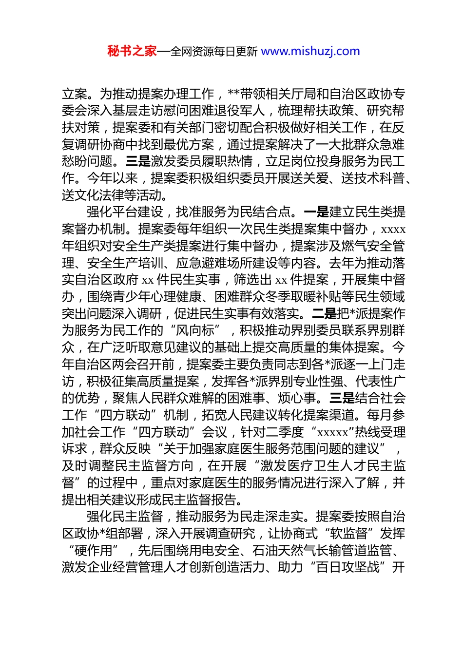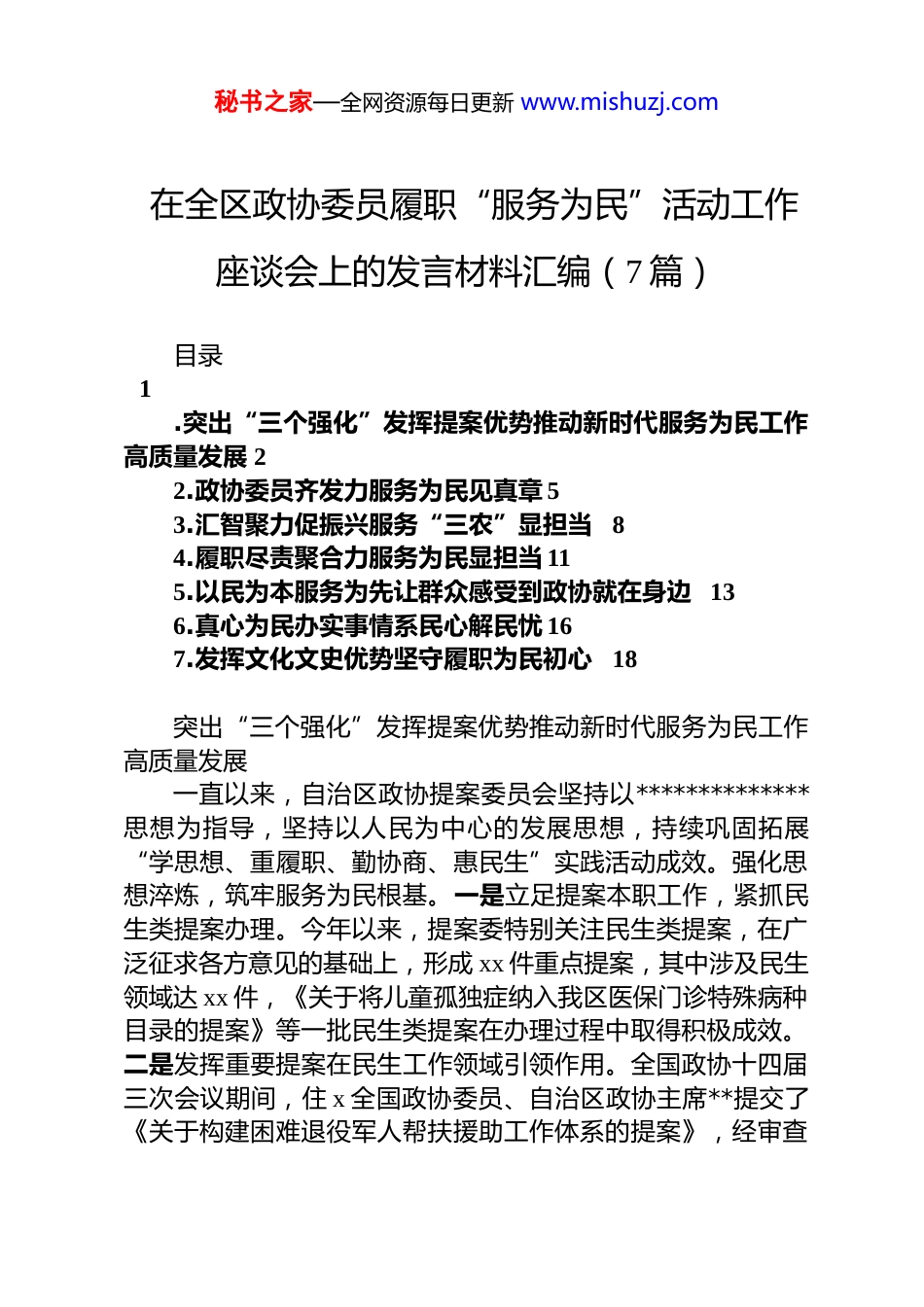 秘书之家—全网资源每日更新 www.mishuzj.com在全区政协委员履职“服务为民”活动工作座谈会上的发言材料汇编(7 篇)目录1.突出“三个强化”发挥提案优势推动新时代服务为民工作高质量发展 22.政协委员齐发力服务为民见真章 53.汇智聚力促振兴服务“三农”显担当84.履职尽责聚合力服务为民显担当 115.以民为本服务为先让群众感受到政协就在身边 136.真心为民办实事情系民心解民忧 167.发挥文化文史优势坚守履职为民初心18突出“三个强化”发挥提案优势推动新时代服务为民工作高质量发展一直以来,自治区政协提案委员会坚持以**************思想为指导,坚持以人民为中心的发展思想,持续巩固拓展“学思想、重履职、勤协商、惠民生”实践活动成效。强化思想淬炼,筑牢服务为民根基。一是立足提案本职工作,紧抓民生类提案办理。今年以来,提案委特别关注民生类提案,在广泛征求各方意见的基础上,形成 xx 件重点提案,其中涉及民生领域达 xx 件,《关于将儿童孤独症纳入我区医保门诊特殊病种目录的提案》等一批民生类提案在办理过程中取得积极成效。二是发挥重要提案在民生工作领域引领作用。全国政协十四届三次会议期间,住 x 全国政协委员、自治区政协主席**提交了《关于构建困难退役军人帮扶援助工作体系的提案》,经审查秘书之家—全网资源每日更新 www.mishuzj.com立案。为推动提案办理工作,**带领相关厅局和自治区政协专委会深入基层走访慰问困难退役军人,梳理帮扶政策、研究帮扶对策,提案委和有关部门密切配合积极做好相关工作,在反复调研协商中找到最优方案,通过提案解决了一大批群众急难愁盼问题。三是激发委员履职热情,立足岗位投身服务为民工作。今年以来,提案委积极组织委员开展送关爱、送技术科普、送文化法律等活动。强化平台建设,找准服务为民结合点。一是建立民生类提案督办机制。提案委每年组织一次民生类提案集中督办,xxxx年组织对安全生产类提案进行集中督办,提案涉及燃气安全管理、安全生产培训、应急避难场所建设等内容。去年为推动落实自治区政府 xx 件民生实事,筛选出 xx 件提案,开展集中督办,围绕青少年心理健康、困难群众冬季取暖补贴等民生领域突出问题深入调研,促进民生实事有效落实。二是把*派提案作为服务为民工作的“风向标”,积极推动界别委员联系界别群众,在广泛听取意见建议的基础上提交高质量的集体提案。今年自治区两会召开前,提案委主要负责同志到各*派逐一上门走访,积极征集高质量提案,发挥各*派界别专业性强、代表性广的优势,聚焦人民群众难解的困难事、烦心事。三是结合社会工作“四方联动”机制,拓宽人民建议转化提案渠道。每月参加社会工作“四方联动”会议,针对二季度“xxxxx”热线受理诉求,群众反映“关于加强家庭医生服务范围问题的建议”,及时调整民主监督方向,在开展“激发医疗卫生人才民主监督”的过程中,重点对家庭医生的服务情况进行深入了解,并提出相关建议形成民主监督报告。强化民主监督,推动服务为民走深走实。提案委按照自治区政协*组部署,深入开展调查研究,让协商式“软监督”发挥“硬作用”,先后围绕用电安全、石油天然气长输管道监管、激发企业经营管理人才创新创造活力、助力“百日攻坚战”开秘书之家—全网资源每日更新 www.mishuzj.com展民主监督调研,围绕第三产业发展开展专题调研,实地调研xx 余家单位,召开 x 次座谈会,形成调研报告,为*委和政府决策提供参考。政协委员齐发力服务为民见真章本届政协以来,自治区政协经济委员会始终秉持人民政协为人民,引导委员扎实开展委员履职“服务为民”活动,形成了“委员带头、各界参与、精准务实、长效惠民”的良好格局。截至目前,累计开展各类活动 xxx 次,撬动帮扶资金超 xxxx 余万元,直接惠及群众超 x 万人次。扎根民生一线,用“小切口”做好“大服务”。关爱特殊群体,传递社会温情。xx 委员募集慈善基金救助大病困难群众。xx 等委员资助家庭经济困难学生,点亮寒门学子求学路。改善社会民生,回应群众期盼,xx 委员组织建设“司机之家”“爱心驿站”,为长途司机、环卫工人提供休憩服务。郝玉...