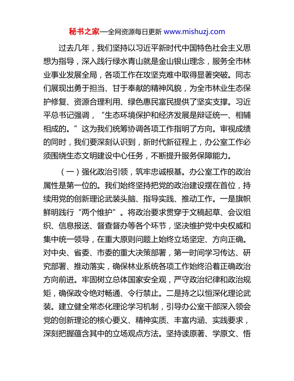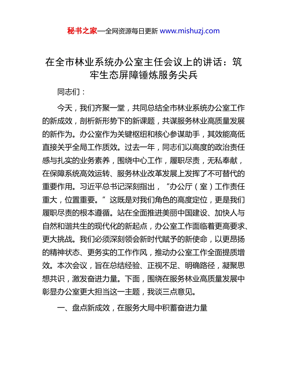 秘书之家—全网资源每日更新 www.mishuzj.com在全市林业系统办公室主任会议上的讲话:筑牢生态屏障锤炼服务尖兵同志们:今天,我们齐聚一堂,共同总结全市林业系统办公室工作的新成效,剖析新形势下的新课题,共谋服务林业高质量发展的新作为。办公室作为关键枢纽和核心参谋助手,其效能高低直接关乎全局工作质效。过去一年,同志们以高度的政治责任感与扎实的业务素养,围绕中心工作,履职尽责,无私奉献,在保障系统高效运转、服务林业改革发展上发挥了不可替代的重要作用。习近平总书记深刻指出,“办公厅(室)工作责任重大,位置重要。”这既是对我们角色的高度定位,更是我们履职尽责的根本遵循。站在全面推进美丽中国建设、加快人与自然和谐共生的现代化的新起点,办公室工作面临着更高要求、更大挑战。我们必须深刻领会新时代赋予的新使命,以更昂扬的精神状态、更务实的工作作风,推动办公室工作全面提质增效。本次会议,旨在总结经验、正视不足、明确路径,凝聚思想共识,激发奋进力量。下面,围绕在服务林业高质量发展中彰显办公室更大担当这一主题,我谈三点意见。一、盘点新成效,在服务大局中积蓄奋进力量秘书之家—全网资源每日更新 www.mishuzj.com过去几年,我们坚持以习近平新时代中国特色社会主义思想为指导,深入践行绿水青山就是金山银山理念,服务全市林业事业发展全局,各项工作在攻坚克难中取得显著突破。同志们展现出勇于担当、甘于奉献的精神风貌,为全市林业生态保护修复、资源合理利用、绿色惠民富民提供了坚实支撑。习近平总书记强调,“生态环境保护和经济发展是辩证统一、相辅相成的。”这为我们统筹协调各项工作指明了方向。审视成绩的同时,我们要深刻认识到,新时代新征程上,办公室工作必须围绕生态文明建设中心任务,不断提升服务保障能力。(一)强化政治引领,筑牢忠诚根基。办公室工作的政治属性是第一位的。我们始终坚持把党的政治建设摆在首位,持续用党的创新理论武装头脑、指导实践、推动工作。一是旗帜鲜明践行“两个维护”。将政治要求贯穿于文稿起草、会议组织、信息报送、督查督办等各个环节,坚决维护党中央权威和集中统一领导,在重大原则问题上始终立场坚定、方向正确。对中央、省委、市委的重大决策部署,第一时间学习传达、研究部署、推动落实,确保林业系统各项工作始终沿着正确政治方向前进。牢固树立总体国家安全观,严守政治纪律和政治规矩,确保政令绝对畅通、令行禁止。二是持之以恒深化理论武装。建立健全常态化理论学习机制,引导办公室干部深入领会党的创新理论的核心要义、精神实质、丰富内涵、实践要求,深刻把握蕴含其中的立场观点方法。坚持读原著、学原文、悟秘书之家—全网资源每日更新 www.mishuzj.com原理,不断提高政治判断力、政治领悟力、政治执行力,自觉运用蕴含其中的立场观点方法分析解决林业改革发展中的实际问题,将学习成果转化为谋划工作的思路、推动发展的举措。三是坚定不移恪守纪律规矩。时刻牢记办公室工作的特殊性和敏感性,严格遵守党的政治纪律、组织纪律、廉洁纪律、群众纪律、工作纪律、生活纪律。加强保密教育和监督管理,确保党和国家秘密安全。教育引导干部自觉净化社交圈、生活圈、朋友圈,知敬畏、存戒惧、守底线,以廉洁自律的实际行动维护林业部门和办公室的良好形象。(二)聚焦主责主业,提升服务效能。服务是办公室的核心价值所在。我们紧密围绕全市林业中心工作和重点任务,优化服务流程,提升保障能力。一是精准保障中心任务落实。聚焦林业资源保护管理、重大生态工程建设、林业产业发展等核心工作,前瞻性谋划,全流程跟踪,精细化服务。特别是在国土绿化提速行动、自然保护地体系建设、林业防灾减灾等急难险重任务中,强化组织协调,做好资源调配、政策对接、进度调度等保障工作,推动重点工作高效落地。牢固树立精品意识,精益求精做好公文处理、会务组织、后勤保障等常规性工作,力求“零差错、无延误”。二是充分发挥参谋助手作用。主动对接市委市政府重大战略部署和林业发展关键需求,深入开展调查研究,围绕林长制深化、林业碳汇开发、智慧林业建设、林下经济发...