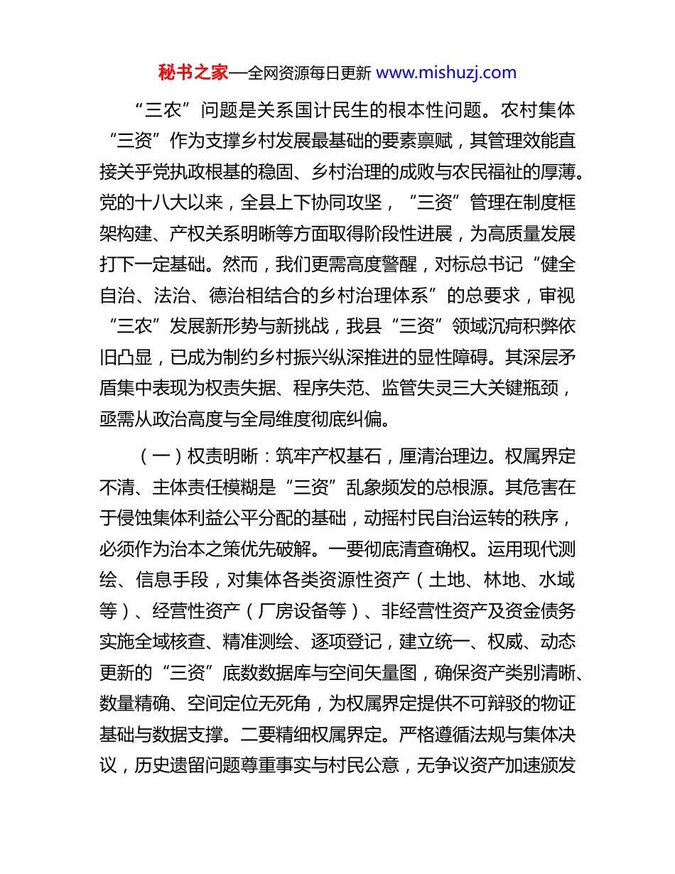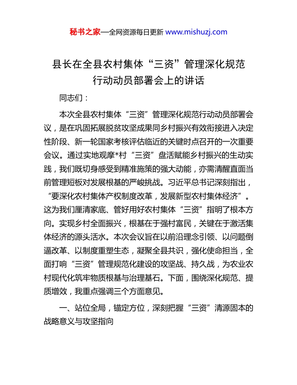 秘书之家—全网资源每日更新 www.mishuzj.com县长在全县农村集体“三资”管理深化规范行动动员部署会上的讲话同志们:本次全县农村集体“三资”管理深化规范行动动员部署会议,是在巩固拓展脱贫攻坚成果同乡村振兴有效衔接进入决定性阶段、新一轮国家考核评估临近的关键时点召开的一次重要会议。通过实地观摩*村“三资”盘活赋能乡村振兴的生动实践,我们既切身感受到精准施策的强大动能,亦需清醒直面当前管理短板对发展根基的严峻挑战。习近平总书记深刻指出,“要深化农村集体产权制度改革,发展新型农村集体经济”。这为我们厘清家底、管好用好农村集体“三资”指明了根本方向。实现乡村全面振兴,根基在于强村富民,关键在于激活集体经济的源头活水。本次会议旨在以前沿理念引领、以问题倒逼改革、以制度重塑生态,凝聚全县共识,强化使命担当,全面打响“三资”管理规范化建设的攻坚战、持久战,为农业农村现代化筑牢物质根基与治理基石。下面,围绕深化规范、提质增效,我重点强调三个方面意见。一、站位全局,锚定方位,深刻把握“三资”清源固本的战略意义与攻坚指向秘书之家—全网资源每日更新 www.mishuzj.com“三农”问题是关系国计民生的根本性问题。农村集体“三资”作为支撑乡村发展最基础的要素禀赋,其管理效能直接关乎党执政根基的稳固、乡村治理的成败与农民福祉的厚薄。党的十八大以来,全县上下协同攻坚,“三资”管理在制度框架构建、产权关系明晰等方面取得阶段性进展,为高质量发展打下一定基础。然而,我们更需高度警醒,对标总书记“健全自治、法治、德治相结合的乡村治理体系”的总要求,审视“三农”发展新形势与新挑战,我县“三资”领域沉疴积弊依旧凸显,已成为制约乡村振兴纵深推进的显性障碍。其深层矛盾集中表现为权责失据、程序失范、监管失灵三大关键瓶颈,亟需从政治高度与全局维度彻底纠偏。(一)权责明晰:筑牢产权基石,厘清治理边。权属界定不清、主体责任模糊是“三资”乱象频发的总根源。其危害在于侵蚀集体利益公平分配的基础,动摇村民自治运转的秩序,必须作为治本之策优先破解。一要彻底清查确权。运用现代测绘、信息手段,对集体各类资源性资产(土地、林地、水域等)、经营性资产(厂房设备等)、非经营性资产及资金债务实施全域核查、精准测绘、逐项登记,建立统一、权威、动态更新的“三资”底数数据库与空间矢量图,确保资产类别清晰、数量精确、空间定位无死角,为权属界定提供不可辩驳的物证基础与数据支撑。二要精细权属界定。严格遵循法规与集体决议,历史遗留问题尊重事实与村民公意,无争议资产加速颁发秘书之家—全网资源每日更新 www.mishuzj.com统一权证,争议资产依法依规妥善化解权属争端,确保资源资产在法律层面与村民认知层面实现“户有所属、权有其主”的清晰归属格局,为后续盘活运营奠定无争议的法治基石。三要压实主体权责。全面梳理村级组织、村务监督委员会及乡镇经管部门在“三资”管理全链条中的法定权责清单与履职负面清单,建立健全村级组织内部管理职责与乡镇政府监管职责的刚性约束机制,严禁职能错位、责任悬空,确保每一项资产、每一笔资金都有明确的管理主体与责任主体,实现管理责任刚性落地无死角。(二)流程再造:规范决策运行,压缩寻租空间。程序规则缺失、监督制衡虚设是滋生权力滥用与管理失控的直接土壤。必须通过再造严谨、透明、刚性的决策执行流程,堵住“微腐败”的制度漏洞。一要严密议事规程。硬性落实“四议两公开”制度在集体资产处置、资源发包、工程发包、大额支出等重大事项中的全程适用,严格界定提议主体、议事范围、表决程序及公开时效,用流程化、模板化的机制设计确保群众知情权、参与权、决策权、监督权在重大事项处置中得到实质性体现和不可剥夺的保障,彻底摒弃“一言堂”。二要统一交易规制。依托县级公共资源交易平台或乡镇分中心,将集体资源发包、资产租赁、工程采购等全部纳入平台实施标准化、电子化、阳光化交易流转,强制推行公开竞价或竞争性招标规则,统一合同要素与示范文本,实施县乡两级联审备案与电子档案留痕秘书之家—全网资源每日更新 www.mi...
