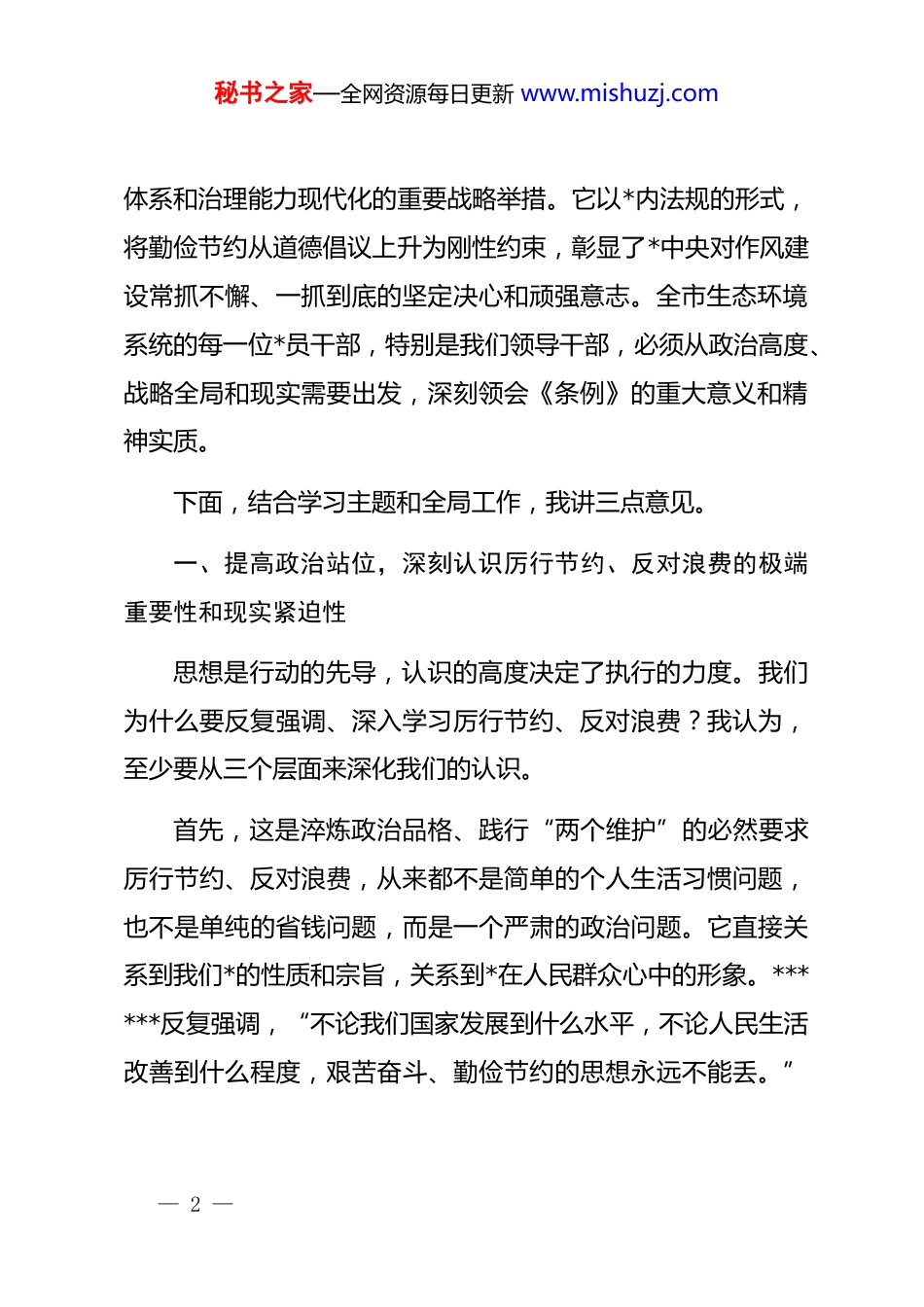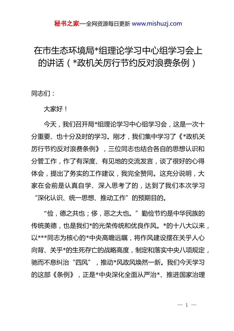 秘书之家—全网资源每日更新 www.mishuzj.com在市生态环境局*组理论学习中心组学习会上的讲话(*政机关厉行节约反对浪费条例)同志们:大家好!今天,我们召开局*组理论学习中心组学习会,这是一次十分重要、也十分及时的学习。刚才,我们集中学习了《*政机关厉行节约反对浪费条例》,三位同志也结合各自的思想认识和分管工作,作了有深度、有见地的交流发言,谈了很好的心得体会,提出了务实的工作建议,我完全赞同。这充分说明,大家在会前是认真自学、深入思考了的,达到了我们本次学习“深化认识、统一思想、推动工作”的预期目的。“俭,德之共也;侈,恶之大也。”勤俭节约是中华民族的传统美德,也是我们*的光荣传统和优良作风。*的十八大以来,以***同志为核心的*中央高瞻远瞩,将作风建设摆在关乎人心向背、关乎*的生死存亡的战略高度,制定和落实中央八项规定,驰而不息纠治“四风”,推动*风政风焕然一新。我们今天学习的这部《条例》,正是*中央深化全面从严治*、推进国家治理— 1 —秘书之家—全网资源每日更新 www.mishuzj.com体系和治理能力现代化的重要战略举措。它以*内法规的形式,将勤俭节约从道德倡议上升为刚性约束,彰显了*中央对作风建设常抓不懈、一抓到底的坚定决心和顽强意志。全市生态环境系统的每一位*员干部,特别是我们领导干部,必须从政治高度、战略全局和现实需要出发,深刻领会《条例》的重大意义和精神实质。下面,结合学习主题和全局工作,我讲三点意见。一、提高政治站位,深刻认识厉行节约、反对浪费的极端重要性和现实紧迫性思想是行动的先导,认识的高度决定了执行的力度。我们为什么要反复强调、深入学习厉行节约、反对浪费?我认为,至少要从三个层面来深化我们的认识。首先,这是淬炼政治品格、践行“两个维护”的必然要求厉行节约、反对浪费,从来都不是简单的个人生活习惯问题,也不是单纯的省钱问题,而是一个严肃的政治问题。它直接关系到我们*的性质和宗旨,关系到*在人民群众心中的形象。******反复强调,“不论我们国家发展到什么水平,不论人民生活改善到什么程度,艰苦奋斗、勤俭节约的思想永远不能丢。”— 2 —秘书之家—全网资源每日更新 www.mishuzj.com这一重要论述,深刻揭示了勤俭节约对于一个政*、一个国家、一个民族的极端重要性。我们作为*领导下的政治机关,生态环境局首先是政治机关,必须旗帜鲜明讲政治。贯彻落实《条例》,就是以实际行动增强“四个意识”、坚定“四个自信”、做到“两个维护”的直接体现。我们能不能带头过“紧日子”,能不能在每一项工作中精打细算,考验的是我们的政治判断力、政治领悟力、政治执行力。如果我们在工作中大手大脚、铺张浪费,不仅会损害公共资源,更会脱离人民群众,动摇我们*的执政根基。因此,我们必须把思想和行动统一到*中央的决策部署上来,将厉行节约作为一项重要的政治纪律来遵守,作为一种必须具备的政治品格来锤炼,确保我们的工作始终沿着正确的政治方向前进。其次,这是建设节约型社会、推动绿色发展的内在要求。我们是生态环境部门,是建设美丽中国、美丽家园的主力军,我们的职责使命天然地与“节约”二字紧密相连。生态文明的核心要义之一,就是倡导简约适度、绿色低碳的生产生活方式。我们向全社会宣传节能降耗、源头减废,如果我们自己内部却资源闲置、能源浪费,那就是言行不一,是最大的讽刺,我们的工作也就失去了说服力和公信力。因此,我们生态环境系统— 3 —秘书之家—全网资源每日更新 www.mishuzj.com在厉行节约上,必须有更高的标准、更严的要求、更实的行动。我们要带头成为节约资源的表率,让每一度电、每一滴水、每一张纸都物尽其用。我们要通过创建节约型机关的实际行动,为全社会树立一个鲜明的导向:保护生态环境,不仅要治理污染,更要从节约资源做起;建设美丽中国,需要我们每一个人、每一个单位都成为绿色发展的践行者和推动者。这种率先垂范,本身就是一种最有力的宣传和引导。第三,这是应对风险挑战、锻造过硬队伍的现实要求。当前,我们正处在实现中华民族伟大复兴的关键时期,面临的内外部环境日趋复杂,各种风险挑战前...