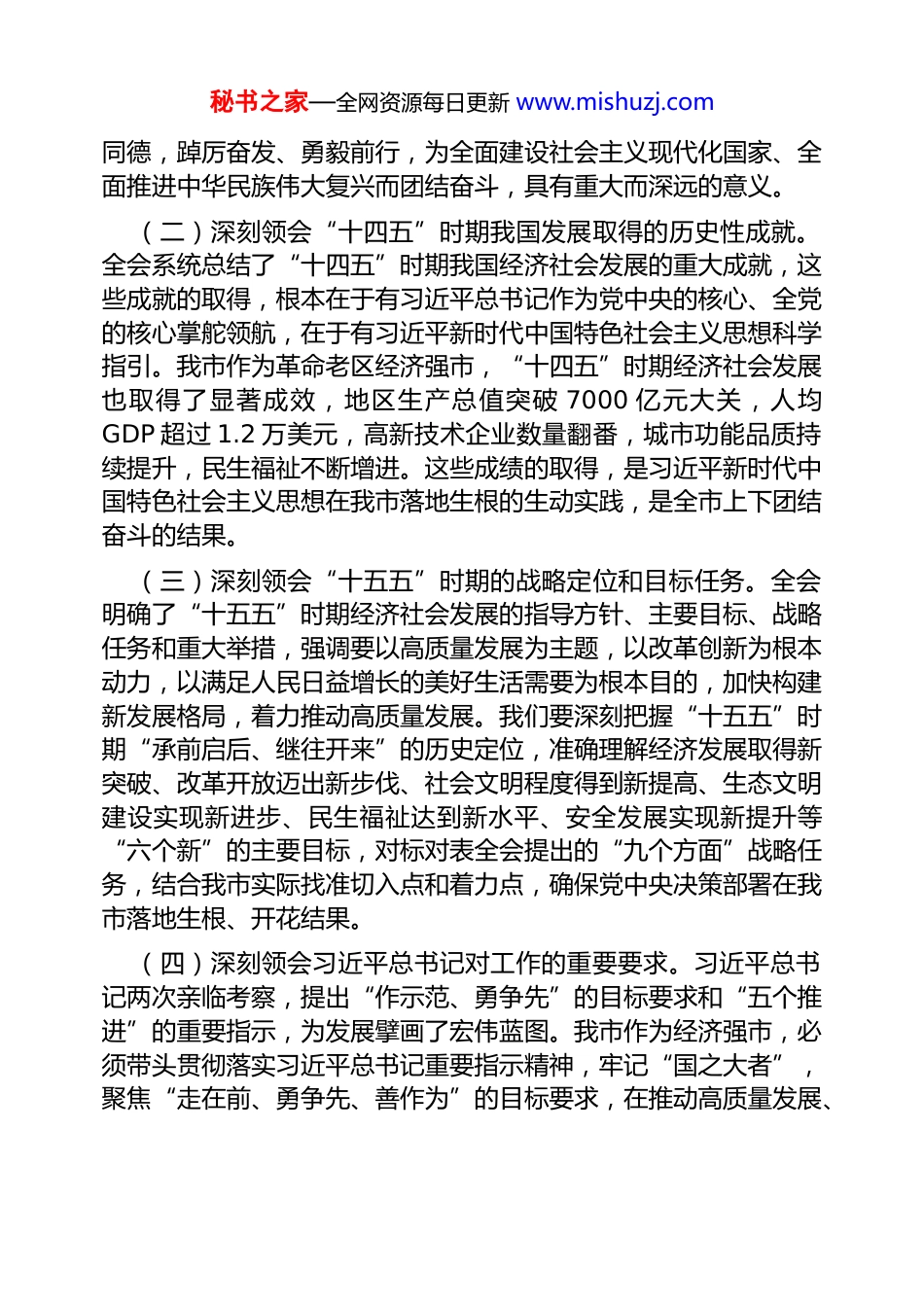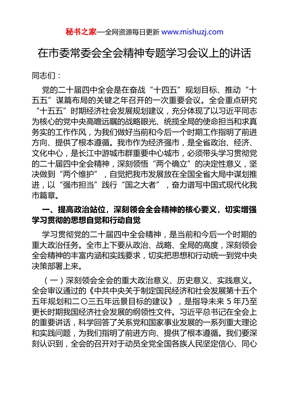 秘书之家—全网资源每日更新 www.mishuzj.com在市委常委会全会精神专题学习会议上的讲话同志们:党的二十届四中全会是在奋战“十四五”规划目标、推动“十五五”谋篇布局的关键之年召开的一次重要会议。全会重点研究“十五五”时期经济社会发展规划建议,充分体现了以习近平同志为核心的党中央高瞻远瞩的战略眼光、统揽全局的使命担当和求真务实的工作作风,为我们做好当前和今后一个时期工作指明了前进方向、提供了根本遵循。我市作为经济强市,是全省政治、经济、文化中心,是长江中游城市群重要中心城市,必须带头学习贯彻党的二十届四中全会精神,深刻领悟“两个确立”的决定性意义,坚决做到“两个维护”,自觉把我市发展放在全国全省大局中谋划推进,以“强市担当”践行“国之大者”,奋力谱写中国式现代化我市篇章。一、提高政治站位,深刻领会全会精神的核心要义,切实增强学习贯彻的思想自觉和行动自觉学习贯彻党的二十届四中全会精神,是当前和今后一个时期的重大政治任务。全市上下要从政治、战略、全局的高度,深刻领会全会精神的丰富内涵和实践要求,切实把思想和行动统一到党中央决策部署上来。(一)深刻领会全会的重大政治意义、历史意义、实践意义。全会审议通过的《中共中央关于制定国民经济和社会发展第十五个五年规划和二〇三五年远景目标的建议》,是指导未来 5 年乃至更长时期我国经济社会发展的纲领性文件。习近平总书记在全会上的重要讲话,科学回答了关系党和国家事业发展的一系列重大理论和实践问题,为我们指明了前进方向、提供了根本遵循。我们要深刻认识到,全会的召开对于动员全党全国各族人民坚定信心、同心秘书之家—全网资源每日更新 www.mishuzj.com同德,踔厉奋发、勇毅前行,为全面建设社会主义现代化国家、全面推进中华民族伟大复兴而团结奋斗,具有重大而深远的意义。(二)深刻领会“十四五”时期我国发展取得的历史性成就。全会系统总结了“十四五”时期我国经济社会发展的重大成就,这些成就的取得,根本在于有习近平总书记作为党中央的核心、全党的核心掌舵领航,在于有习近平新时代中国特色社会主义思想科学指引。我市作为革命老区经济强市,“十四五”时期经济社会发展也取得了显著成效,地区生产总值突破 7000 亿元大关,人均GDP 超过 1.2 万美元,高新技术企业数量翻番,城市功能品质持续提升,民生福祉不断增进。这些成绩的取得,是习近平新时代中国特色社会主义思想在我市落地生根的生动实践,是全市上下团结奋斗的结果。(三)深刻领会“十五五”时期的战略定位和目标任务。全会明确了“十五五”时期经济社会发展的指导方针、主要目标、战略任务和重大举措,强调要以高质量发展为主题,以改革创新为根本动力,以满足人民日益增长的美好生活需要为根本目的,加快构建新发展格局,着力推动高质量发展。我们要深刻把握“十五五”时期“承前启后、继往开来”的历史定位,准确理解经济发展取得新突破、改革开放迈出新步伐、社会文明程度得到新提高、生态文明建设实现新进步、民生福祉达到新水平、安全发展实现新提升等“六个新”的主要目标,对标对表全会提出的“九个方面”战略任务,结合我市实际找准切入点和着力点,确保党中央决策部署在我市落地生根、开花结果。(四)深刻领会习近平总书记对工作的重要要求。习近平总书记两次亲临考察,提出“作示范、勇争先”的目标要求和“五个推进”的重要指示,为发展擘画了宏伟蓝图。我市作为经济强市,必须带头贯彻落实习近平总书记重要指示精神,牢记“国之大者”,聚焦“走在前、勇争先、善作为”的目标要求,在推动高质量发展、秘书之家—全网资源每日更新 www.mishuzj.com深化改革开放、促进共同富裕、加强生态文明建设、传承红色基因等方面展现强市担当,努力在中部地区崛起中走在前列。二、锚定目标任务,结合我市实际谋深谋实“十五五”时期发展蓝图谋深谋实我市“十五五”时期经济社会发展,必须以党的二十届四中全会精神为指引,全面对标对表党中央决策部署,紧密结合我市发展实际,坚持问题导向、目标导向、结果导向,科学确定发展目标,明确重点任务,强化工作举措,...