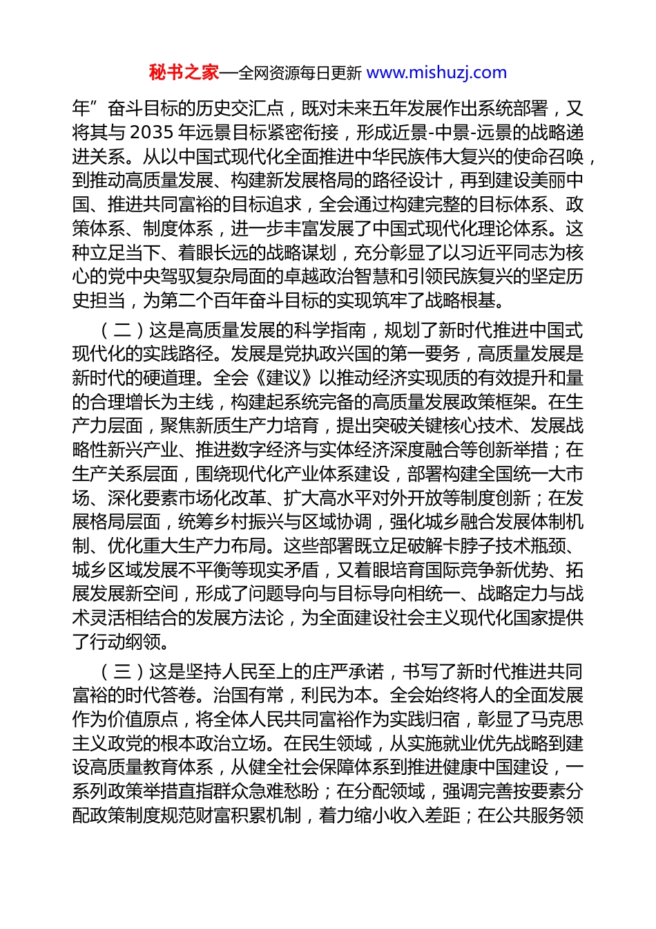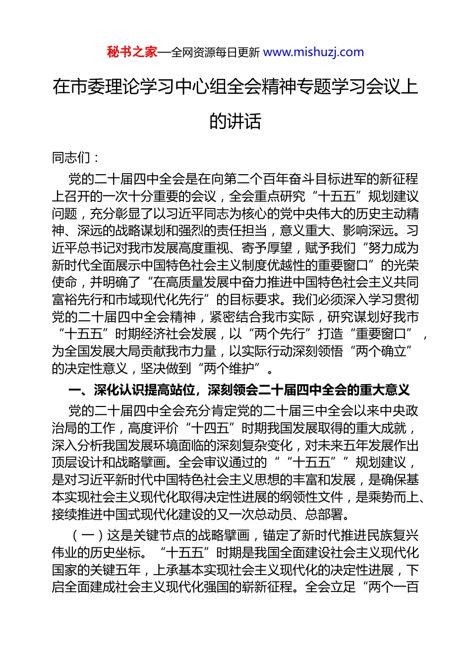 秘书之家—全网资源每日更新 www.mishuzj.com在市委理论学习中心组全会精神专题学习会议上的讲话同志们:党的二十届四中全会是在向第二个百年奋斗目标进军的新征程上召开的一次十分重要的会议,全会重点研究“十五五”规划建议问题,充分彰显了以习近平同志为核心的党中央伟大的历史主动精神、深远的战略谋划和强烈的责任担当,意义重大、影响深远。习近平总书记对我市发展高度重视、寄予厚望,赋予我们“努力成为新时代全面展示中国特色社会主义制度优越性的重要窗口”的光荣使命,并明确了“在高质量发展中奋力推进中国特色社会主义共同富裕先行和市域现代化先行”的目标要求。我们必须深入学习贯彻党的二十届四中全会精神,紧密结合我市实际,研究谋划好我市“十五五”时期经济社会发展,以“两个先行”打造“重要窗口”,为全国发展大局贡献我市力量,以实际行动深刻领悟“两个确立”的决定性意义,坚决做到“两个维护”。一、深化认识提高站位,深刻领会二十届四中全会的重大意义党的二十届四中全会充分肯定党的二十届三中全会以来中央政治局的工作,高度评价“十四五”时期我国发展取得的重大成就,深入分析我国发展环境面临的深刻复杂变化,对未来五年发展作出顶层设计和战略擘画。全会审议通过的““十五五””规划建议,是对习近平新时代中国特色社会主义思想的丰富和发展,是确保基本实现社会主义现代化取得决定性进展的纲领性文件,是乘势而上、接续推进中国式现代化建设的又一次总动员、总部署。(一)这是关键节点的战略擘画,锚定了新时代推进民族复兴伟业的历史坐标。“十五五”时期是我国全面建设社会主义现代化国家的关键五年,上承基本实现社会主义现代化的决定性进展,下启全面建成社会主义现代化强国的崭新征程。全会立足“两个一百秘书之家—全网资源每日更新 www.mishuzj.com年”奋斗目标的历史交汇点,既对未来五年发展作出系统部署,又将其与 2035 年远景目标紧密衔接,形成近景-中景-远景的战略递进关系。从以中国式现代化全面推进中华民族伟大复兴的使命召唤,到推动高质量发展、构建新发展格局的路径设计,再到建设美丽中国、推进共同富裕的目标追求,全会通过构建完整的目标体系、政策体系、制度体系,进一步丰富发展了中国式现代化理论体系。这种立足当下、着眼长远的战略谋划,充分彰显了以习近平同志为核心的党中央驾驭复杂局面的卓越政治智慧和引领民族复兴的坚定历史担当,为第二个百年奋斗目标的实现筑牢了战略根基。(二)这是高质量发展的科学指南,规划了新时代推进中国式现代化的实践路径。发展是党执政兴国的第一要务,高质量发展是新时代的硬道理。全会《建议》以推动经济实现质的有效提升和量的合理增长为主线,构建起系统完备的高质量发展政策框架。在生产力层面,聚焦新质生产力培育,提出突破关键核心技术、发展战略性新兴产业、推进数字经济与实体经济深度融合等创新举措;在生产关系层面,围绕现代化产业体系建设,部署构建全国统一大市场、深化要素市场化改革、扩大高水平对外开放等制度创新;在发展格局层面,统筹乡村振兴与区域协调,强化城乡融合发展体制机制、优化重大生产力布局。这些部署既立足破解卡脖子技术瓶颈、城乡区域发展不平衡等现实矛盾,又着眼培育国际竞争新优势、拓展发展新空间,形成了问题导向与目标导向相统一、战略定力与战术灵活相结合的发展方法论,为全面建设社会主义现代化国家提供了行动纲领。(三)这是坚持人民至上的庄严承诺,书写了新时代推进共同富裕的时代答卷。治国有常,利民为本。全会始终将人的全面发展作为价值原点,将全体人民共同富裕作为实践归宿,彰显了马克思主义政党的根本政治立场。在民生领域,从实施就业优先战略到建设高质量教育体系,从健全社会保障体系到推进健康中国建设,一系列政策举措直指群众急难愁盼;在分配领域,强调完善按要素分配政策制度规范财富积累机制,着力缩小收入差距;在公共服务领秘书之家—全网资源每日更新 www.mishuzj.com域,提出推进基本公共服务均等化完善共同富裕政策体系,让发展成果更多更公平惠及全体人民。这些部署超越了西方现代化的资本...