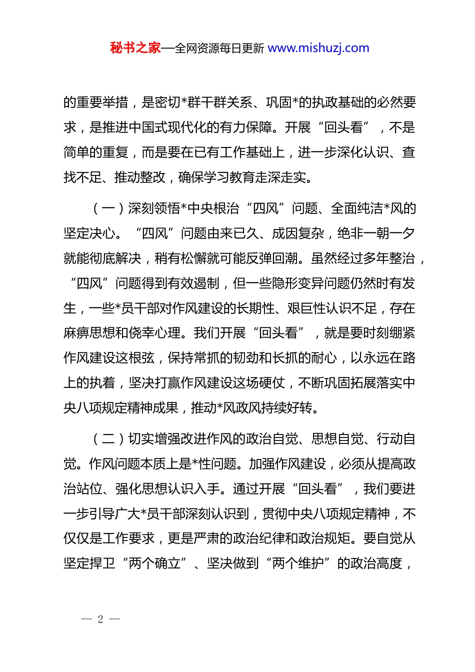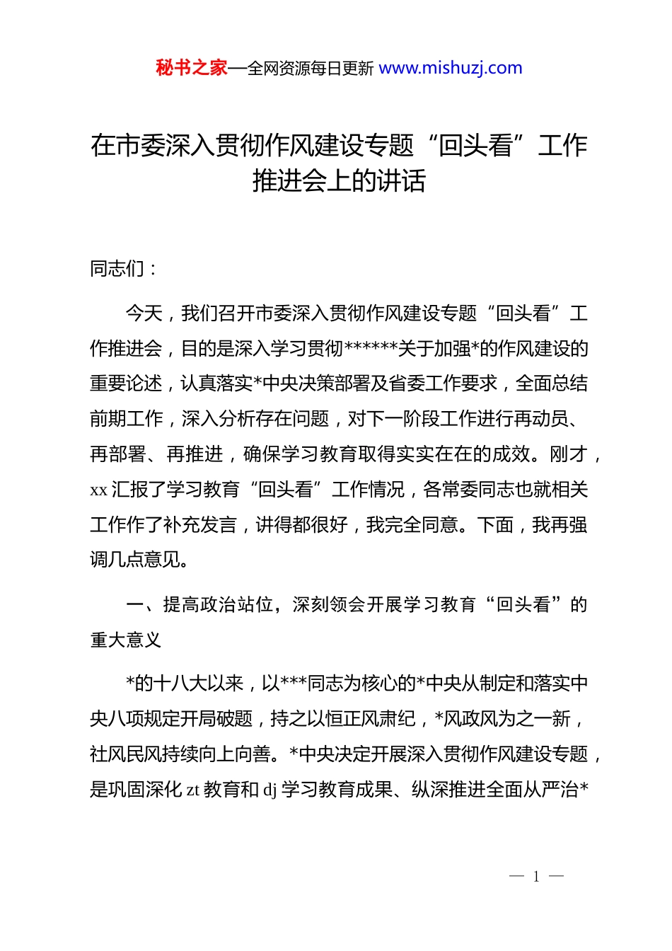 秘书之家—全网资源每日更新 www.mishuzj.com在市委深入贯彻作风建设专题“回头看”工作推进会上的讲话同志们:今天,我们召开市委深入贯彻作风建设专题“回头看”工作推进会,目的是深入学习贯彻******关于加强*的作风建设的重要论述,认真落实*中央决策部署及省委工作要求,全面总结前期工作,深入分析存在问题,对下一阶段工作进行再动员、再部署、再推进,确保学习教育取得实实在在的成效。刚才,xx 汇报了学习教育“回头看”工作情况,各常委同志也就相关工作作了补充发言,讲得都很好,我完全同意。下面,我再强调几点意见。一、提高政治站位,深刻领会开展学习教育“回头看”的重大意义*的十八大以来,以***同志为核心的*中央从制定和落实中央八项规定开局破题,持之以恒正风肃纪,*风政风为之一新,社风民风持续向上向善。*中央决定开展深入贯彻作风建设专题,是巩固深化 zt 教育和 dj 学习教育成果、纵深推进全面从严治*— 1 —秘书之家—全网资源每日更新 www.mishuzj.com的重要举措,是密切*群干群关系、巩固*的执政基础的必然要求,是推进中国式现代化的有力保障。开展“回头看”,不是简单的重复,而是要在已有工作基础上,进一步深化认识、查找不足、推动整改,确保学习教育走深走实。(一)深刻领悟*中央根治“四风”问题、全面纯洁*风的坚定决心。“四风”问题由来已久、成因复杂,绝非一朝一夕就能彻底解决,稍有松懈就可能反弹回潮。虽然经过多年整治,“四风”问题得到有效遏制,但一些隐形变异问题仍然时有发生,一些*员干部对作风建设的长期性、艰巨性认识不足,存在麻痹思想和侥幸心理。我们开展“回头看”,就是要时刻绷紧作风建设这根弦,保持常抓的韧劲和长抓的耐心,以永远在路上的执着,坚决打赢作风建设这场硬仗,不断巩固拓展落实中央八项规定精神成果,推动*风政风持续好转。(二)切实增强改进作风的政治自觉、思想自觉、行动自觉。作风问题本质上是*性问题。加强作风建设,必须从提高政治站位、强化思想认识入手。通过开展“回头看”,我们要进一步引导广大*员干部深刻认识到,贯彻中央八项规定精神,不仅仅是工作要求,更是严肃的政治纪律和政治规矩。要自觉从坚定捍卫“两个确立”、坚决做到“两个维护”的政治高度,— 2 —秘书之家—全网资源每日更新 www.mishuzj.com深刻领悟******关于加强*的作风建设的重要论述,不断增强政治判断力、政治领悟力、政治执行力,切实把思想和行动统一到*中央决策部署上来,以更高的标准、更严的要求、更实的举措,推动作风建设取得新成效。(三)充分认识开展“回头看”对推动我市高质量发展的重要作用。当前,我市正处于加快建设的关键时期,面临着诸多机遇和挑战。良好的作风是推进各项工作的重要保障。通过“回头看”,我们要着力解决*员干部在作风方面存在的突出问题,进一步激发干事创业的热情和担当精神,营造风清气正的政治生态和良好的发展环境,为我市经济社会高质量发展提供坚强有力的支撑。二、以更严的标准查摆问题,确保问题清仓见底查摆问题是解决问题的前提和基础。在“回头看”过程中我们要坚持问题导向,结合典型案例和巡视巡察整改、整治群众身边不正之风和腐败问题、整治形式主义为基层减负情况,全面深入查找贯彻中央八项规定及其实施细则精神方面存在的问题,切实把问题找准、找实、找具体。(一)对照典型案例深入剖析。近期,中央和省、市纪委— 3 —秘书之家—全网资源每日更新 www.mishuzj.com监委通报了一批违反中央八项规定精神的典型案例,这些案例具有很强的代表性和警示性。我们要组织*员干部认真学习这些案例,从中吸取深刻教训,对照自身思想和工作实际,深入查找是否存在类似问题。要坚持把自己摆进去、把职责摆进去、把工作摆进去,从思想根源、制度执行、监督管理等方面进行全面剖析,切实找准问题症结,明确整改方向。(二)结合巡视巡察整改查漏补缺。巡视巡察是对各级*组织和*员干部的“政治体检”。我们要充分利用巡视巡察成果,对照巡视巡察反馈问题,逐一进行梳理,看哪些问题已经整改到位,哪些问题还存在反弹回潮的风险,哪些问题整改还不彻底。...