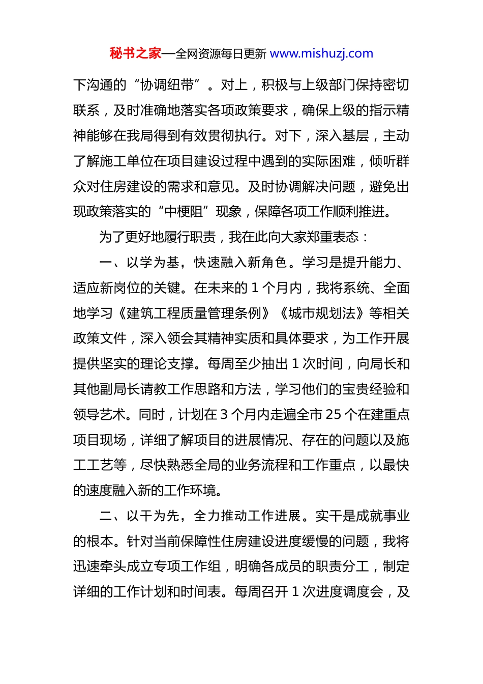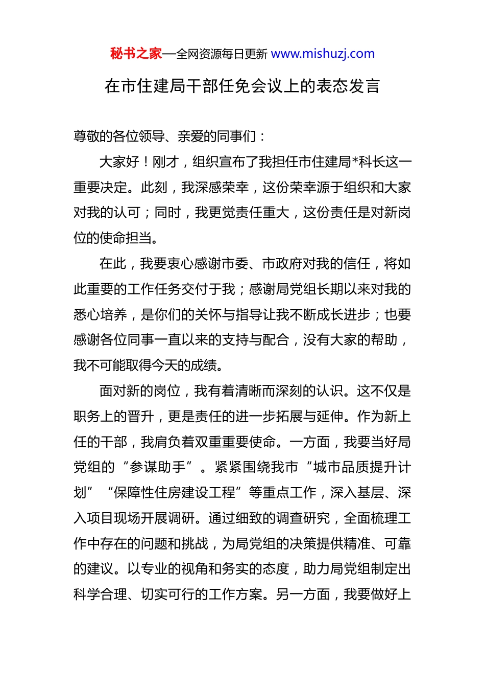 秘书之家—全网资源每日更新 www.mishuzj.com在市住建局干部任免会议上的表态发言 尊敬的各位领导、亲爱的同事们:大家好!刚才,组织宣布了我担任市住建局*科长这一重要决定。此刻,我深感荣幸,这份荣幸源于组织和大家对我的认可;同时,我更觉责任重大,这份责任是对新岗位的使命担当。在此,我要衷心感谢市委、市政府对我的信任,将如此重要的工作任务交付于我;感谢局党组长期以来对我的悉心培养,是你们的关怀与指导让我不断成长进步;也要感谢各位同事一直以来的支持与配合,没有大家的帮助,我不可能取得今天的成绩。面对新的岗位,我有着清晰而深刻的认识。这不仅是职务上的晋升,更是责任的进一步拓展与延伸。作为新上任的干部,我肩负着双重重要使命。一方面,我要当好局党组的“参谋助手”。紧紧围绕我市“城市品质提升计划”“保障性住房建设工程”等重点工作,深入基层、深入项目现场开展调研。通过细致的调查研究,全面梳理工作中存在的问题和挑战,为局党组的决策提供精准、可靠的建议。以专业的视角和务实的态度,助力局党组制定出科学合理、切实可行的工作方案。另一方面,我要做好上秘书之家—全网资源每日更新 www.mishuzj.com下沟通的“协调纽带”。对上,积极与上级部门保持密切联系,及时准确地落实各项政策要求,确保上级的指示精神能够在我局得到有效贯彻执行。对下,深入基层,主动了解施工单位在项目建设过程中遇到的实际困难,倾听群众对住房建设的需求和意见。及时协调解决问题,避免出现政策落实的“中梗阻”现象,保障各项工作顺利推进。为了更好地履行职责,我在此向大家郑重表态:一、以学为基,快速融入新角色。学习是提升能力、适应新岗位的关键。在未来的 1 个月内,我将系统、全面地学习《建筑工程质量管理条例》《城市规划法》等相关政策文件,深入领会其精神实质和具体要求,为工作开展提供坚实的理论支撑。每周至少抽出 1 次时间,向局长和其他副局长请教工作思路和方法,学习他们的宝贵经验和领导艺术。同时,计划在 3 个月内走遍全市 25 个在建重点项目现场,详细了解项目的进展情况、存在的问题以及施工工艺等,尽快熟悉全局的业务流程和工作重点,以最快的速度融入新的工作环境。二、以干为先,全力推动工作进展。实干是成就事业的根本。针对当前保障性住房建设进度缓慢的问题,我将迅速牵头成立专项工作组,明确各成员的职责分工,制定详细的工作计划和时间表。每周召开 1 次进度调度会,及秘书之家—全网资源每日更新 www.mishuzj.com时掌握项目进展情况,协调解决建材供应短缺、施工人员不足等难点问题。加强与相关部门的沟通协作,争取政策支持和资源保障,确保今年 11 月底前完成 10 个保障性住房项目的建设任务,让更多的群众能够早日住上安心房。同时,积极推动党建与业务深度融合,在重点项目中成立党员先锋队,充分发挥党员的先锋模范作用,以党建引领业务发展,为住房建设工作注入强大的精神动力。三、以廉为绳,坚守廉洁自律底线。廉洁是从政的基本准则。我将始终牢记“公生明,廉生威”的古训,严格执行廉洁自律的各项规定。在工程招标、物资采购、资金拨付等关键环节,坚决做到按制度办事、按程序操作,不搞任何特殊化。自觉接受纪检部门和同事们的监督,主动公开工作信息,确保权力在阳光下运行。坚决杜绝利用职务之便谋取私利的行为,保持清正廉洁的政治本色,树立良好的干部形象。四、以和为贵,凝聚团队强大合力。团结是做好工作的重要保障。我将尊重班子成员的意见和建议,积极配合局长做好全局的统筹协调工作。在工作中,充分发扬民主,不搞“一言堂”。对于分管科室的工作,多倾听基层干部和施工人员的想法,鼓励大家积极参与决策和管理。营造一个“心往一处想、劲往一处使”的良好工作氛围,秘书之家—全网资源每日更新 www.mishuzj.com让每一位同事都能在和谐的环境中充分发挥自己的才能,共同为市住建局的发展贡献力量。最后,我想说,今天的提拔对我而言,不是终点,而是一个全新的起点。在未来的工作中,我将以“时时放心不下”的责任感和使命感,脚踏实地、真抓实干,干干净净做人、兢...
