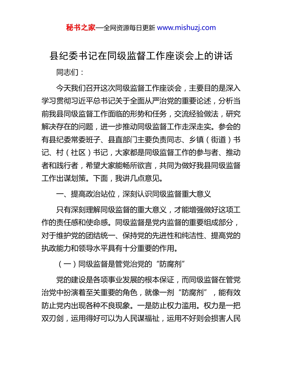 秘书之家—全网资源每日更新 www.mishuzj.com县纪委书记在同级监督工作座谈会上的讲话同志们:今天我们召开这次同级监督工作座谈会,主要目的是深入学习贯彻习近平总书记关于全面从严治党的重要论述,分析当前我县同级监督工作面临的形势和任务,交流经验做法,研究解决存在的问题,进一步推动同级监督工作走深走实。参会的有县纪委常委班子、县直部门主要负责同志、乡镇(街道)书记、村(社区)书记,大家都是同级监督工作的参与者、推动者和践行者,希望大家能畅所欲言,共同为做好我县同级监督工作出谋划策。下面,我讲几点意见。一、提高政治站位,深刻认识同级监督重大意义只有深刻理解同级监督的重大意义,才能增强做好这项工作的责任感和使命感。同级监督是党内监督的重要组成部分,对于维护党的团结统一、保持党的先进性和纯洁性、提高党的执政能力和领导水平具有十分重要的作用。(一)同级监督是管党治党的“防腐剂”党的建设是各项事业发展的根本保证,而同级监督在管党治党中扮演着至关重要的角色,就像一剂“防腐剂”,能有效防止党内出现各种不良现象。一是防止权力滥用。权力是一把双刃剑,运用得好可以为人民谋福祉,运用不好则会损害人民秘书之家—全网资源每日更新 www.mishuzj.com利益。同级之间朝夕相处,对彼此的工作职责、权力运行轨迹最为了解,能够及时发现权力运行过程中出现的偏差和问题。通过同级监督,可以对权力进行有效制约和监督,确保权力在党纪国法规定的范围内运行,避免个人或少数人独断专行、以权谋私。例如,在重大项目决策、资金使用等方面,同级监督能够及时介入,防止权力被滥用,保障决策的科学性和公正性。二是遏制腐败滋生。腐败是党执政面临的最大威胁,而有效的监督是遏制腐败的关键。同级监督能够及时发现党员干部在思想、工作、生活等方面存在的苗头性、倾向性问题,通过提醒、批评、纠正等方式,将腐败行为扼杀在萌芽状态。对于已经出现的腐败问题,同级监督也能及时上报并配合查处,防止腐败现象蔓延扩散。近年来,我县通过加强同级监督,查处了一批违纪违法案件,有效遏制了腐败滋生的势头。三是维护党的纯洁性。党的纯洁性是党的生命线,保持党的纯洁性,必须加强党内监督。同级监督能够督促党员干部严格遵守党的纪律和规矩,坚定理想信念,牢记党的宗旨,自觉抵制各种腐朽思想的侵蚀。通过开展批评与自我批评、民主生活会等形式的同级监督,能够及时清除党内的不良风气和腐败分子,保持党的队伍的纯洁性,增强党的凝聚力和战斗力。(二)同级监督是政治生态的“净化剂”良好的政治生态是党的事业发展的重要保障,同级监督就像一剂“净化剂”,能够不断净化党内政治生态,营造风清气秘书之家—全网资源每日更新 www.mishuzj.com正的良好氛围。一是营造风清气正氛围。同级监督能够促使党员干部之间相互监督、相互约束,形成正确的用人导向和工作导向。在选人用人方面,通过同级监督,可以防止任人唯亲、任人唯钱等不正之风,确保选拔出来的干部德才兼备、清正廉洁。在工作作风方面,同级监督能够督促党员干部求真务实、真抓实干,坚决反对形式主义、官僚主义,营造干事创业的良好氛围。二是化解内部矛盾。在党组织内部,由于工作思路、利益诉求等方面的差异,难免会出现一些矛盾和分歧。同级监督可以为党员干部提供一个沟通交流、坦诚相待的平台,通过开展批评与自我批评,及时化解矛盾、消除分歧,增进彼此之间的理解和信任。同时,同级监督还能够及时发现和解决党组织内部存在的问题,维护党组织的团结统一。三是促进团结协作。团结协作是做好各项工作的基础,同级监督能够增强党员干部的集体意识和团队精神,促使大家心往一处想、劲往一处使,形成工作合力。在工作中,同级之间相互支持、相互配合、相互监督,能够及时发现和纠正工作中的失误和不足,提高工作效率和质量。例如,在重大任务攻坚中,通过同级监督,能够确保各项工作任务得到有效落实,形成团结协作、攻坚克难的良好局面。(三)同级监督是事业发展的“助推器”发展是党执政兴国的第一要务,同级监督能够为各项事业发展提供有力保障,就像一个“助推器”,...