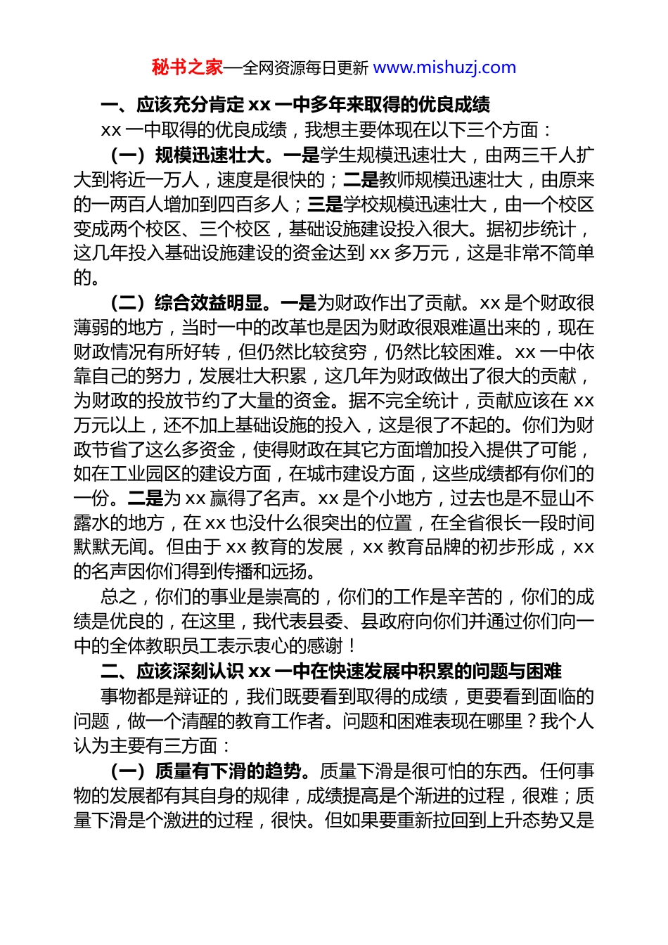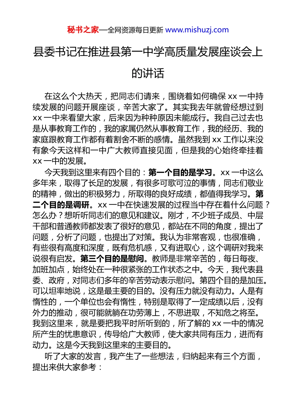 秘书之家—全网资源每日更新 www.mishuzj.com县委书记在推进县第一中学高质量发展座谈会上的讲话在这么个大热天,把同志们请来,围绕着如何确保 xx 一中持续发展的问题开展座谈,辛苦大家了。其实我去年就曾经想过到xx 一中来看望大家,后来因为种种原因未能成行。我自己过去也是从事教育工作的,我的家属仍然从事教育工作,我的经历、我的家庭跟教育工作都有着割舍不断的感情。虽然我到 xx 工作以来没有象今天这样和一中广大教师直接见面,但是我的心始终牵挂着xx 一中的发展。今天我到这里来有四个目的:第一个目的是学习。xx 一中这么多年来,取得了长足的发展,有很多可歌可泣的事情,同志们敬业的精神,做出的积极努力,所取得的良好成绩,都值得我学习。第二个目的是调研。xx 一中在快速发展的过程当中存在着什么问题?怎么办?想听听同志们的意见和建议。刚才,不少班子成员、中层干部和普通教师都发表了很好的意见,都站在不同的角度,提出了问题,分析了问题,也提出了对策。我认为非常客观,也很准确,有些很有高度和深度,既有危机感,又有进取心,这个调研对我来说很有启发。第三个目的是慰问。教师是非常辛苦的,每日每夜、加班加点,始终处在一种很紧张的工作状态之中。今天,我代表县委、政府,对同志们多年的辛苦劳动表示慰问。第四个目的是加压。可以坦率地说,这是最主要的目的。没有压力就没有动力。人是有惰性的,一个单位也会有惰性,特别是取得了一定成绩以后,没有外力的推动,很可能就躺在功劳薄上,不思进取,不知危之将至。我到这里来,就是要把我平时所听到的,所了解的 xx 一中的情况所产生的忧患意识,传导给广大教师,使大家共同有压力,进而有动力。这是今天我到这里来的主要目的。听了大家的发言,我产生了一些想法,归纳起来有三个方面,提出来供大家参考:秘书之家—全网资源每日更新 www.mishuzj.com一、应该充分肯定 xx 一中多年来取得的优良成绩xx 一中取得的优良成绩,我想主要体现在以下三个方面:(一)规模迅速壮大。一是学生规模迅速壮大,由两三千人扩大到将近一万人,速度是很快的;二是教师规模迅速壮大,由原来的一两百人增加到四百多人;三是学校规模迅速壮大,由一个校区变成两个校区、三个校区,基础设施建设投入很大。据初步统计,这几年投入基础设施建设的资金达到 xx 多万元,这是非常不简单的。(二)综合效益明显。一是为财政作出了贡献。xx 是个财政很薄弱的地方,当时一中的改革也是因为财政很艰难逼出来的,现在财政情况有所好转,但仍然比较贫穷,仍然比较困难。xx 一中依靠自己的努力,发展壮大积累,这几年为财政做出了很大的贡献,为财政的投放节约了大量的资金。据不完全统计,贡献应该在 xx万元以上,还不加上基础设施的投入,这是很了不起的。你们为财政节省了这么多资金,使得财政在其它方面增加投入提供了可能,如在工业园区的建设方面,在城市建设方面,这些成绩都有你们的一份。二是为 xx 赢得了名声。xx 是个小地方,过去也是不显山不露水的地方,在 xx 也没什么很突出的位置,在全省很长一段时间默默无闻。但由于 xx 教育的发展,xx 教育品牌的初步形成,xx的名声因你们得到传播和远扬。总之,你们的事业是崇高的,你们的工作是辛苦的,你们的成绩是优良的,在这里,我代表县委、县政府向你们并通过你们向一中的全体教职员工表示衷心的感谢!二、应该深刻认识 xx 一中在快速发展中积累的问题与困难事物都是辩证的,我们既要看到取得的成绩,更要看到面临的问题,做一个清醒的教育工作者。问题和困难表现在哪里?我个人认为主要有三方面:(一)质量有下滑的趋势。质量下滑是很可怕的东西。任何事物的发展都有其自身的规律,成绩提高是个渐进的过程,很难;质量下滑是个激进的过程,很快。但如果要重新拉回到上升态势又是秘书之家—全网资源每日更新 www.mishuzj.com非常困难的,没有几年是缓不过气来的。我过去当过老师,又曾两度分管过教育,xx 年作为副县长在 xx 分管教育,xx 年作为副书记在 xx 分管教育,对教育的内部规律我自认为还是比较了解。一叶落而知秋,...