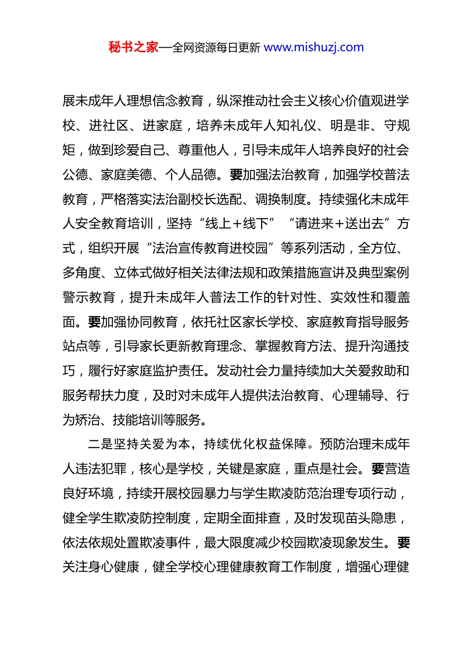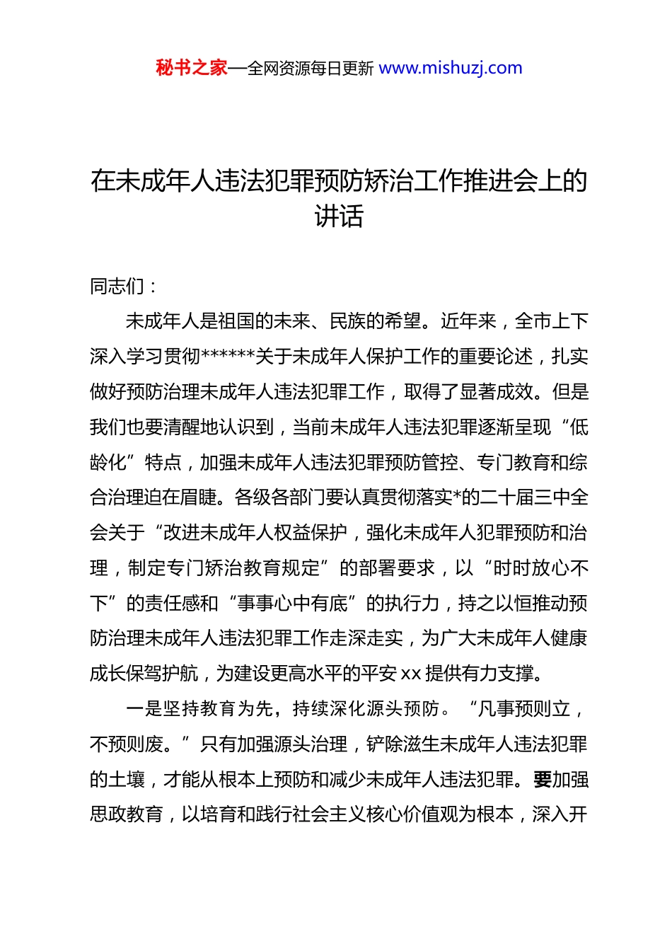 秘书之家—全网资源每日更新 www.mishuzj.com在未成年人违法犯罪预防矫治工作推进会上的讲话同志们:未成年人是祖国的未来、民族的希望。近年来,全市上下深入学习贯彻******关于未成年人保护工作的重要论述,扎实做好预防治理未成年人违法犯罪工作,取得了显著成效。但是我们也要清醒地认识到,当前未成年人违法犯罪逐渐呈现“低龄化”特点,加强未成年人违法犯罪预防管控、专门教育和综合治理迫在眉睫。各级各部门要认真贯彻落实*的二十届三中全会关于“改进未成年人权益保护,强化未成年人犯罪预防和治理,制定专门矫治教育规定”的部署要求,以“时时放心不下”的责任感和“事事心中有底”的执行力,持之以恒推动预防治理未成年人违法犯罪工作走深走实,为广大未成年人健康成长保驾护航,为建设更高水平的平安 xx 提供有力支撑。一是坚持教育为先,持续深化源头预防。“凡事预则立,不预则废。”只有加强源头治理,铲除滋生未成年人违法犯罪的土壤,才能从根本上预防和减少未成年人违法犯罪。要加强思政教育,以培育和践行社会主义核心价值观为根本,深入开秘书之家—全网资源每日更新 www.mishuzj.com展未成年人理想信念教育,纵深推动社会主义核心价值观进学校、进社区、进家庭,培养未成年人知礼仪、明是非、守规矩,做到珍爱自己、尊重他人,引导未成年人培养良好的社会公德、家庭美德、个人品德。要加强法治教育,加强学校普法教育,严格落实法治副校长选配、调换制度。持续强化未成年人安全教育培训,坚持“线上+线下”“请进来+送出去”方式,组织开展“法治宣传教育进校园”等系列活动,全方位、多角度、立体式做好相关法律法规和政策措施宣讲及典型案例警示教育,提升未成年人普法工作的针对性、实效性和覆盖面。要加强协同教育,依托社区家长学校、家庭教育指导服务站点等,引导家长更新教育理念、掌握教育方法、提升沟通技巧,履行好家庭监护责任。发动社会力量持续加大关爱救助和服务帮扶力度,及时对未成年人提供法治教育、心理辅导、行为矫治、技能培训等服务。二是坚持关爱为本,持续优化权益保障。预防治理未成年人违法犯罪,核心是学校,关键是家庭,重点是社会。要营造良好环境,持续开展校园暴力与学生欺凌防范治理专项行动,健全学生欺凌防控制度,定期全面排查,及时发现苗头隐患,依法依规处置欺凌事件,最大限度减少校园欺凌现象发生。要关注身心健康,健全学校心理健康教育工作制度,增强心理健秘书之家—全网资源每日更新 www.mishuzj.com康教育师资力量和心理教育硬件设施配备,及时开展心理健康危机干预,增强心理健康问题疏导、处置的实效性。要深化网络治理,建立健全网络巡查、过滤筛查等机制,加强未成年人触网信息安全审查,强化家庭、学校对未成年人上网用网教育引导和管理,培养未成年人正确的网络观。三是坚持干预为要,持续实化矫治帮扶。在现实生活中,每个罪错未成年人都是独立个体,罪错行为不同,罪错原因各异,必须坚持从思想、行为和心理等方面开展教育矫治,让罪错未成年人思想认识有改观、灵魂深处有触动,回归到正常的人生路上。要推进专门学校建设,学习借鉴外地经验做法,统筹研究推进具有专门教育和专门矫治功能的专门学校,建立健全专门学校教学、管理、考核等机制,切实发挥专门学校在罪错未成年人教育矫治工作中的重要作用,加大对有严重不良行为、家庭学校无力管教、限制刑事责任能力的未成年人专门教育力度,帮助他们迷途知返、尽快回归正常学习生活。要落实“分级预防、干预和矫治”要求,加强未成年人违法犯罪预防、干预治理体系建设,建好用好家庭教育指导服务站点,依托“明天你好”未成年人心理健康咨询服务等宣传栏目,常态化开展家长学堂、家教讲堂、法治课堂等主题鲜明的教育指导活动。要落实警调对接机制,将涉未成年人风险隐患信息纳入秘书之家—全网资源每日更新 www.mishuzj.com社会治安治理形势研判范围,及时掌握不良行为、严重不良行为、涉违法犯罪未成年人现实表现情况,切实做到早预警、早处理。四是坚持震慑为重,持续强化惩治效果。“刑赏之本,在乎劝善而惩恶。”依法惩处违法犯罪的极少数,...