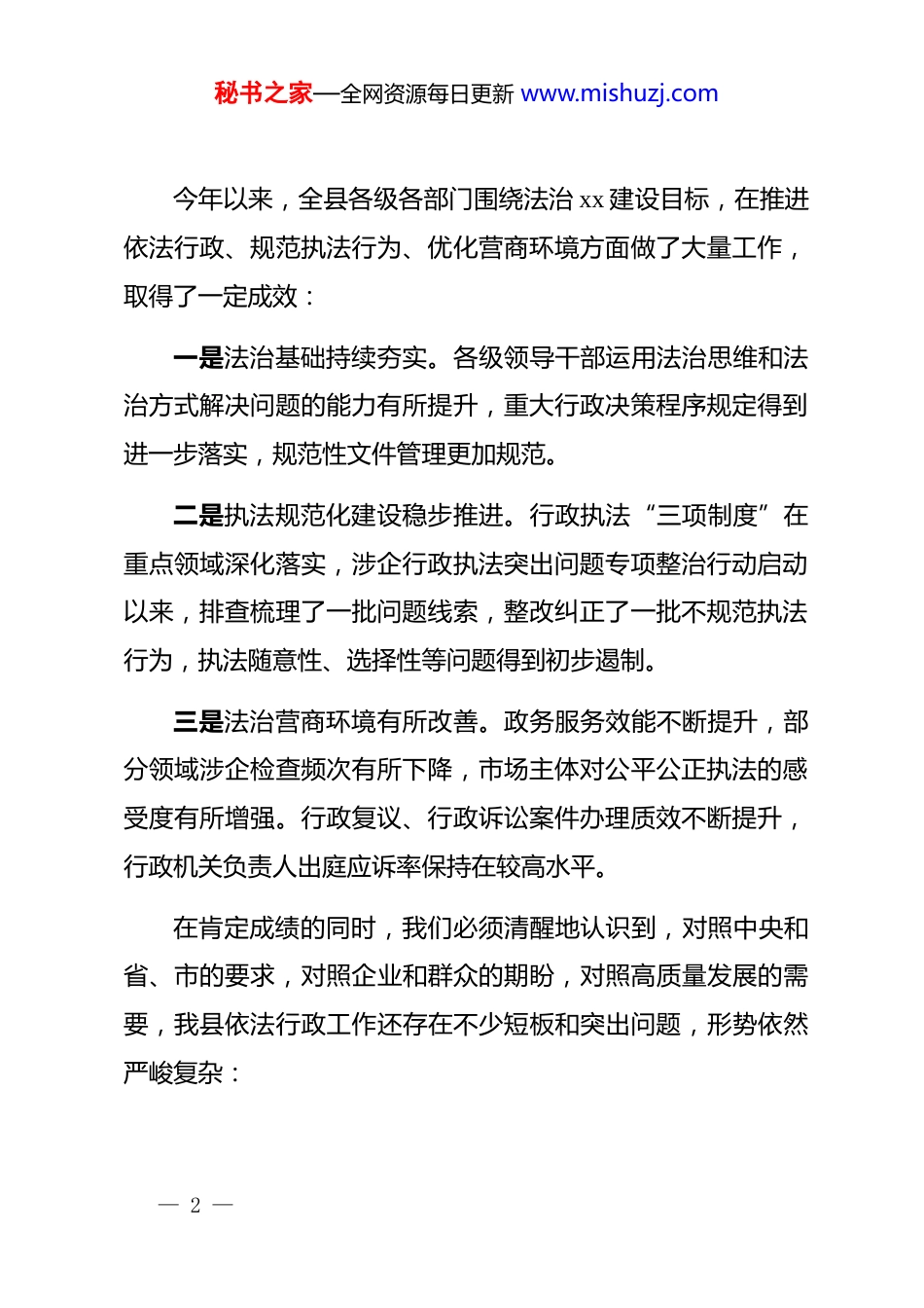 秘书之家—全网资源每日更新 www.mishuzj.com在县 2025 年依法行政暨规范涉企行政执法专项行动推进会上的讲话同志们:今天我们召开全县依法行政暨规范涉企行政执法专项行动推进会,主要任务是深入贯彻***法治思想,全面落实省委依法治省委员会第七次会议、市委依法治市委员会第四次会议精神以及《云南省严格规范涉企行政检查 16 项措施》要求,总结前一阶段工作,分析当前面临的形势和存在的问题,部署下一阶段重点任务,动员全县上下进一步统一思想、压实责任、狠抓落实,持续优化法治化营商环境,全面提升我县依法行政能力和水平,为 xx 经济社会高质量发展提供坚实的法治保障。刚才,县司法局汇报了上半年依法行政工作情况,通报了行政执法突出问题专项整治暨规范涉企行政检查专项行动开展情况,讲得比较具体、也比较实在。下面,结合大家的汇报和当前工作实际,我讲三点意见:一、肯定成绩,正视不足,切实增强推进依法行政的紧迫感和责任感— 1 —秘书之家—全网资源每日更新 www.mishuzj.com今年以来,全县各级各部门围绕法治 xx 建设目标,在推进依法行政、规范执法行为、优化营商环境方面做了大量工作,取得了一定成效:一是法治基础持续夯实。各级领导干部运用法治思维和法治方式解决问题的能力有所提升,重大行政决策程序规定得到进一步落实,规范性文件管理更加规范。二是执法规范化建设稳步推进。行政执法“三项制度”在重点领域深化落实,涉企行政执法突出问题专项整治行动启动以来,排查梳理了一批问题线索,整改纠正了一批不规范执法行为,执法随意性、选择性等问题得到初步遏制。三是法治营商环境有所改善。政务服务效能不断提升,部分领域涉企检查频次有所下降,市场主体对公平公正执法的感受度有所增强。行政复议、行政诉讼案件办理质效不断提升,行政机关负责人出庭应诉率保持在较高水平。在肯定成绩的同时,我们必须清醒地认识到,对照中央和省、市的要求,对照企业和群众的期盼,对照高质量发展的需要,我县依法行政工作还存在不少短板和突出问题,形势依然严峻复杂:— 2 —秘书之家—全网资源每日更新 www.mishuzj.com一是思想认识仍需深化。少数单位和干部对法治建设极端重要性的认识还不到位,“重发展、轻法治”“重管理、轻服务”的思想残余依然存在,运用法治思维破解发展难题的主动性、自觉性有待加强。二是执法不规范问题依然突出。从专项整治通报和日常掌握的情况看,“任性执法”“选择性执法”“一刀切执法”“运动式执法”等现象尚未根绝。个别领域检查过多过频、多头重复检查的问题依然存在,扰企扰民的情况时有发生。部分执法人员程序意识、证据意识淡薄,执法方式简单粗暴,影响了政府形象和公信力。三是涉企执法痛点难点亟待破解。企业对一些领域执法标准不统一、自由裁量权过大、处罚与教育结合不够、轻微违法行为容错纠错机制不完善等问题反映仍然比较集中。如何做到既依法监管、维护秩序,又最大限度减少对企业正常生产经营的干扰,实现“无事不扰、无处不在”,还需要拿出更精准、更有效的措施。四是依法行政能力存在短板。部分执法单位专业力量不足,人员能力素质参差不齐,对新业态、新领域的监管存在“本领恐慌”。行政复议化解行政争议的主渠道作用发挥还不够充分,— 3 —秘书之家—全网资源每日更新 www.mishuzj.com行政诉讼败诉率仍需进一步压降。少数单位对负责人出庭应诉工作重视不够,存在“出庭不出声”现象。五是法治环境优化任重道远。“法治是最好的营商环境”的理念尚未完全深入人心,个别地方和领域政策执行“中梗阻”、隐性壁垒等问题依然存在,市场主体对公平竞争、平等保护的法治环境感受度还有提升空间。这些问题,都是制约我县法治化营商环境建设和高质量发展的“绊脚石”,必须引起我们高度重视,下大力气加以解决。全县各级各部门要切实增强责任感、紧迫感和危机感,把思想和行动统一到中央和省、市的决策部署上来,统一到本次会议的要求上来,以刀刃向内的勇气和自我革命的精神,坚决打好依法行政攻坚战、持久战。二、聚焦关键,精准发力,全力推动依法行政和规范涉企执法专项行动走深走实做...