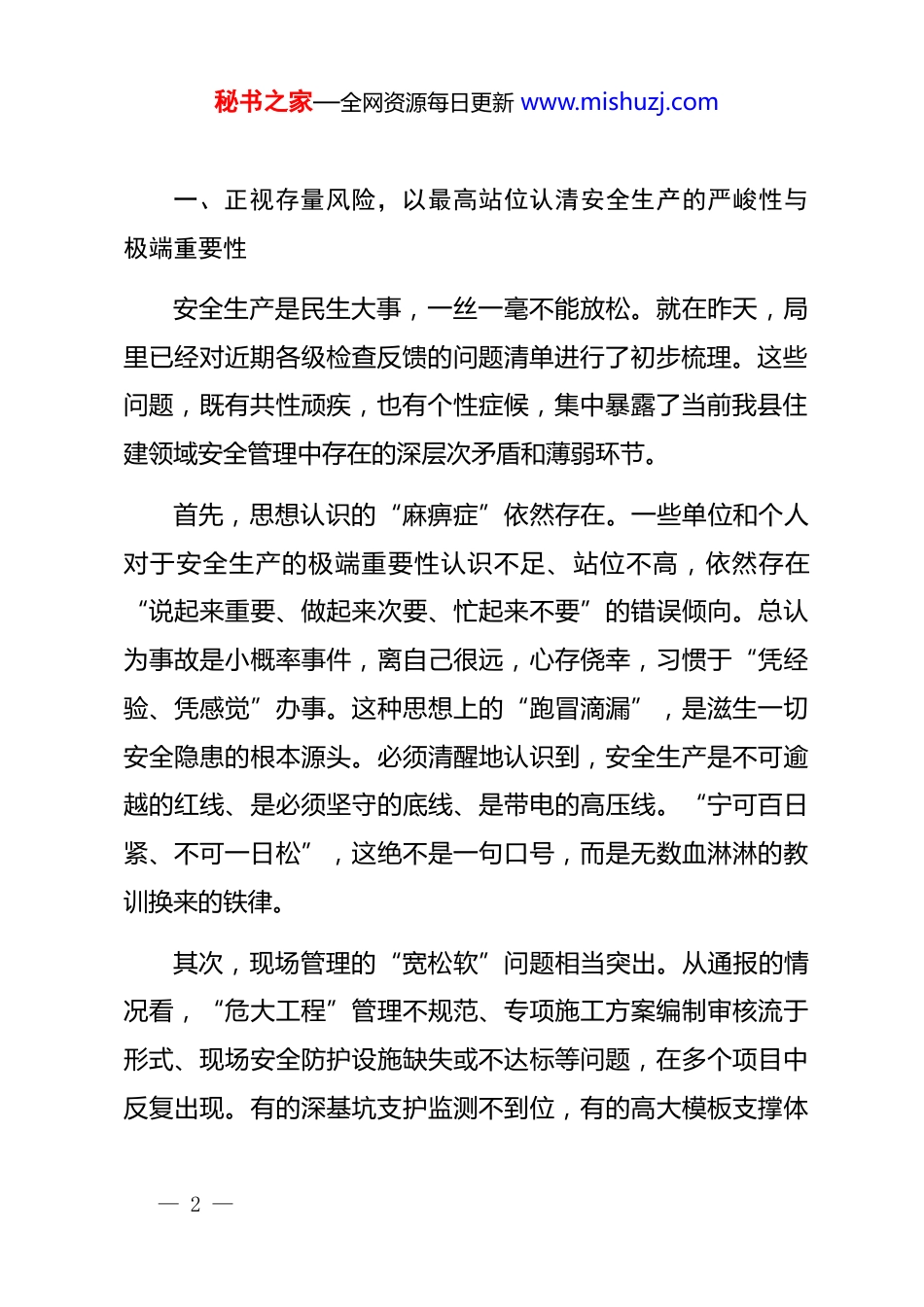 秘书之家—全网资源每日更新 www.mishuzj.com在县住建系统安全生产问题整改暨治本攻坚推进会上的讲话同志们:今天,我们在这里召开一次十分重要、也十分紧迫的会议会议的主题,就是深入学习贯彻***关于安全生产重要论述和指示批示精神,针对近期中央安全生产考核巡查以及省、市、县各级督导检查所反馈的问题,进行一次全面、深入、彻底的剖析,并对下一步的整改落实与治本攻坚工作进行再动员、再部署、再压实。刚才,相关同志通报了近期检查反馈的具体问题,问题触目惊心,形势不容乐观。参加今天会议的,有局机关的全体班子成员和股室负责人,还有全县所有在建项目的建设、施工、监理单位的主要负责同志。可以说,全县住建领域的安全生产责任主体都到齐了。召开这次会议,就是要向全系统、全行业传递一个极其鲜明的信号:在安全生产问题上,没有任何情面可讲,没有任何余地可留,必须以最坚决的态度、最迅速的行动、最严格的标准,将所有隐患彻底清零,将所有责任全部压实。下面,我讲三点意见。— 1 —秘书之家—全网资源每日更新 www.mishuzj.com一、正视存量风险,以最高站位认清安全生产的严峻性与极端重要性安全生产是民生大事,一丝一毫不能放松。就在昨天,局里已经对近期各级检查反馈的问题清单进行了初步梳理。这些问题,既有共性顽疾,也有个性症候,集中暴露了当前我县住建领域安全管理中存在的深层次矛盾和薄弱环节。首先,思想认识的“麻痹症”依然存在。一些单位和个人对于安全生产的极端重要性认识不足、站位不高,依然存在“说起来重要、做起来次要、忙起来不要”的错误倾向。总认为事故是小概率事件,离自己很远,心存侥幸,习惯于“凭经验、凭感觉”办事。这种思想上的“跑冒滴漏”,是滋生一切安全隐患的根本源头。必须清醒地认识到,安全生产是不可逾越的红线、是必须坚守的底线、是带电的高压线。“宁可百日紧、不可一日松”,这绝不是一句口号,而是无数血淋淋的教训换来的铁律。其次,现场管理的“宽松软”问题相当突出。从通报的情况看,“危大工程”管理不规范、专项施工方案编制审核流于形式、现场安全防护设施缺失或不达标等问题,在多个项目中反复出现。有的深基坑支护监测不到位,有的高大模板支撑体— 2 —秘书之家—全网资源每日更新 www.mishuzj.com系搭设不符合方案要求,有的塔吊、施工电梯等关键设备维保记录不全,有的作业人员甚至连最基本的安全帽、安全带都不按规定佩戴。这些问题看似是细节,实则是对生命的漠视,是对法规的践踏。此外,城镇燃气安全同样敲响了警钟。检查发现部分居民和商户仍在使用不合格的燃气软管、可调试减压阀,甚至是没有熄火保护装置的灶具。这些移动的“定时炸弹”一旦引爆,后果不堪设想。再者,事故发生的潜在风险正在累积。虽然我们未能获取到本年度我县建筑行业精准到个位的事故统计数据,但这绝不代表可以高枕无忧。根据国家层面的“十四五”规划目标,到2025 年底,必须有效遏制建筑施工等重点领域的重特大事故。这是一个硬性的政治任务。放眼全省乃至全国,建筑业的安全事故起数和死亡人数在各行业中仍然位居前列。可以做一个合理的推演,基于当前我县如此之多的在建项目体量和检查暴露出的普遍性问题,倘若不立即采取断然措施,发生生产安全事故的概率将急剧上升。据不完全估算,今年前三季度,我县住建领域虽未发生重大亡人事故,但各类安全隐患报告多达数百起,因整改不到位造成的小额经济损失累计已超过 50 万元。这些都是强烈的预警信号,我们已经站在了悬崖边缘,退无可退。— 3 —秘书之家—全网资源每日更新 www.mishuzj.com同志们,安全生产工作,是“一失万无”的工作,任何一次疏忽都可能造成无法挽回的损失。各单位、各企业必须立即从“要我安全”的被动应付,彻底转变为“我要安全、我懂安全、我能安全”的主动作为,真正把人民群众的生命财产安全放在第一位,把安全发展的理念贯穿于项目建设的全过程。二、聚焦问题清零,以最实举措打赢隐患整改的歼灭战与攻坚战面对问题清单,回避没有出路,拖延就是纵容。必须拿出“快、准、狠”的作风,分层级、分类别、分阶段地推进整改,...