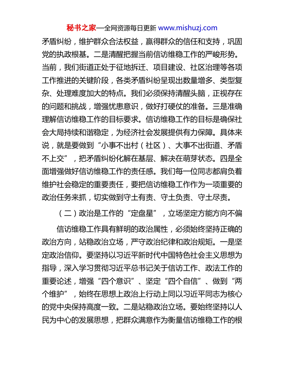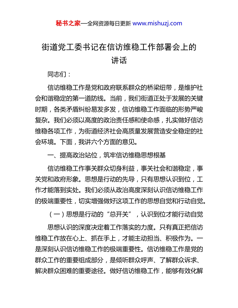 秘书之家—全网资源每日更新 www.mishuzj.com街道党工委书记在信访维稳工作部署会上的讲话同志们:信访维稳工作是党和政府联系群众的桥梁纽带,是维护社会和谐稳定的第一道防线。当前,我们街道正处于发展的关键时期,各类矛盾纠纷易发多发,信访维稳工作面临的形势严峻复杂。我们必须以高度的政治责任感和使命感,扎实做好信访维稳各项工作,为街道经济社会高质量发展营造安全稳定的社会环境。下面,我讲六个方面的意见。一、提高政治站位,筑牢信访维稳思想根基信访维稳工作事关群众切身利益,事关社会和谐稳定,事关党和政府形象。思想是行动的先导,只有思想认识到位,工作才能落到实处。我们必须从政治高度深刻认识信访维稳工作的极端重要性,切实增强做好这项工作的思想自觉和行动自觉。(一)思想是行动的“总开关”,认识到位才能行动自觉思想认识的深度决定着工作落实的力度。只有真正把信访维稳工作放在心上、抓在手上,才能主动担当、积极作为。一是深刻认识信访维稳工作的极端重要性。信访维稳工作是党的群众工作的重要组成部分,是倾听群众呼声、了解群众诉求、解决群众困难的重要途径。做好信访维稳工作,能够有效化解秘书之家—全网资源每日更新 www.mishuzj.com矛盾纠纷,维护群众合法权益,赢得群众的信任和支持,巩固党的执政根基。二是清醒把握当前信访维稳工作的严峻形势。当前,我们街道正处于征地拆迁、项目建设、社区治理等各项工作推进的关键阶段,各类矛盾纠纷呈现出数量增多、类型复杂、处理难度加大的特点。我们必须保持清醒头脑,正视存在的问题和挑战,增强忧患意识,做好打硬仗的准备。三是准确理解信访维稳工作的目标要求。信访维稳工作的目标是确保社会大局持续和谐稳定,为经济社会发展提供有力保障。具体来说,就是要做到“小事不出村(社区)、大事不出街道、矛盾不上交”,把矛盾纠纷化解在基层、解决在萌芽状态。四是全面增强做好信访维稳工作的责任感。我们每一位同志都肩负着维护社会稳定的重要责任,要把信访维稳工作作为一项重要的政治任务来抓,切实做到守土有责、守土负责、守土尽责。(二)政治是工作的“定盘星”,立场坚定方能方向不偏信访维稳工作具有鲜明的政治属性,必须始终坚持正确的政治方向,站稳政治立场,严守政治纪律和政治规矩。一是坚定政治信仰。要坚持以习近平新时代中国特色社会主义思想为指导,深入学习贯彻习近平总书记关于信访工作、政法工作的重要论述,增强“四个意识”、坚定“四个自信”、做到“两个维护”,始终在思想上政治上行动上同以习近平同志为核心的党中央保持高度一致。二是站稳政治立场。要始终坚持以人民为中心的发展思想,把群众满意作为衡量信访维稳工作的根秘书之家—全网资源每日更新 www.mishuzj.com本标准,切实解决好群众最关心、最直接、最现实的利益问题,不断增强群众的获得感、幸福感、安全感。三是严守政治纪律。要严格遵守党的政治纪律和政治规矩,在信访维稳工作中坚决贯彻执行党中央和上级党委的决策部署,不打折扣、不搞变通,确保政令畅通。四是提升政治能力。要不断提高政治判断力、政治领悟力、政治执行力,善于从政治上分析问题、解决问题,在复杂矛盾和严峻考验面前保持政治定力,牢牢掌握信访维稳工作的主动权。(三)大局是行动的“指南针”,胸怀全局才可谋划长远信访维稳工作是服务大局、保障大局的重要工作,必须放到街道经济社会发展大局中去谋划、去推进。一是围绕发展大局谋划工作。要紧紧围绕街道的中心工作和发展目标,找准信访维稳工作与经济发展、项目建设、城市管理等工作的结合点和着力点,为各项工作顺利推进保驾护航。二是服务稳定大局开展工作。要充分认识到稳定是发展的前提和基础,把维护社会稳定作为信访维稳工作的首要任务,全力化解各类矛盾纠纷,消除不稳定因素,为街道发展创造良好环境。三是立足长远大局推进工作。要树立长远眼光,既要解决当前信访维稳工作中存在的突出问题,又要建立健全长效机制,从根本上预防和减少矛盾纠纷的发生,实现信访维稳工作的常态化、规范化、长效化。四是统筹全局资源整合力量。要整合街道、村(社区)、秘书之...