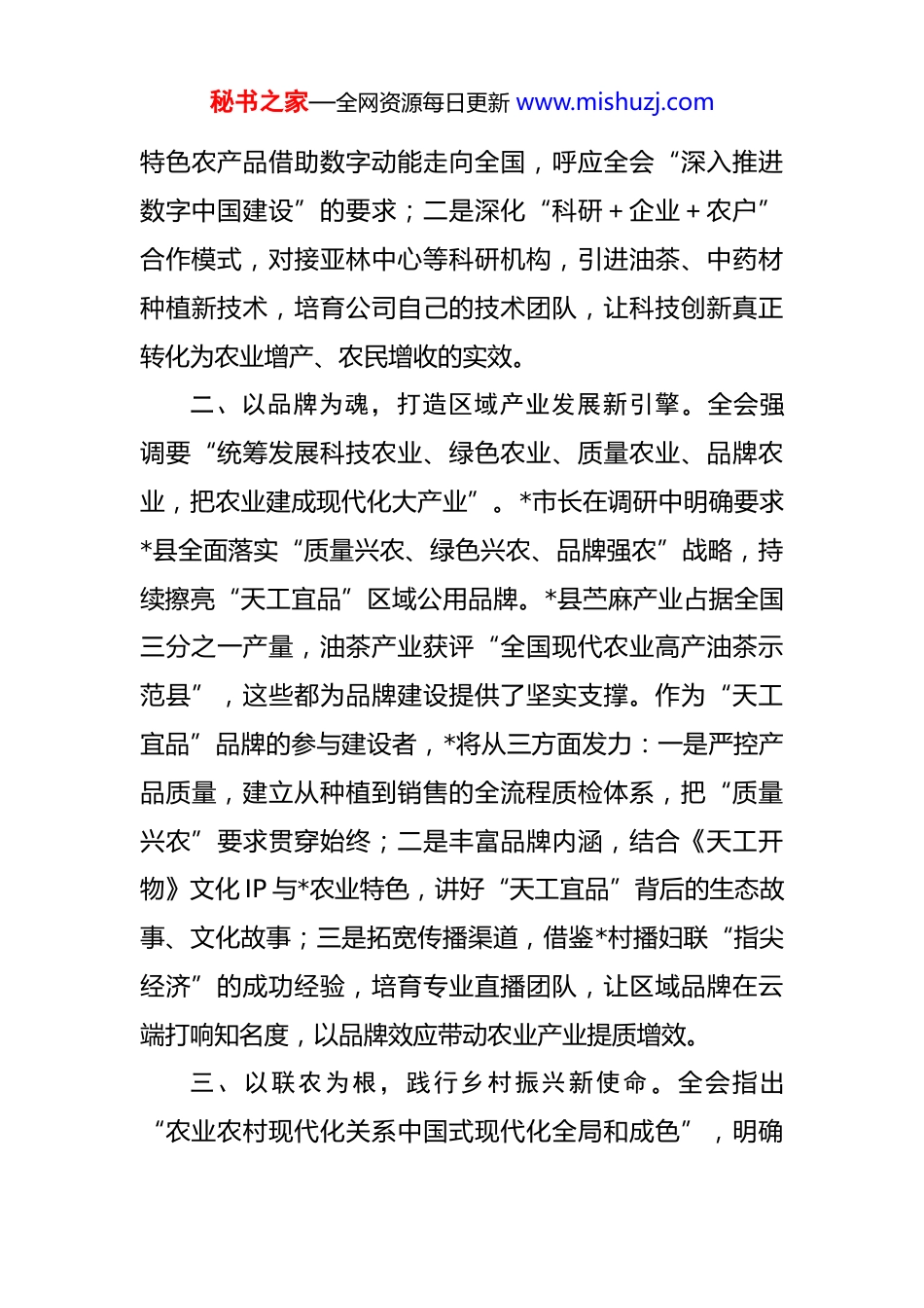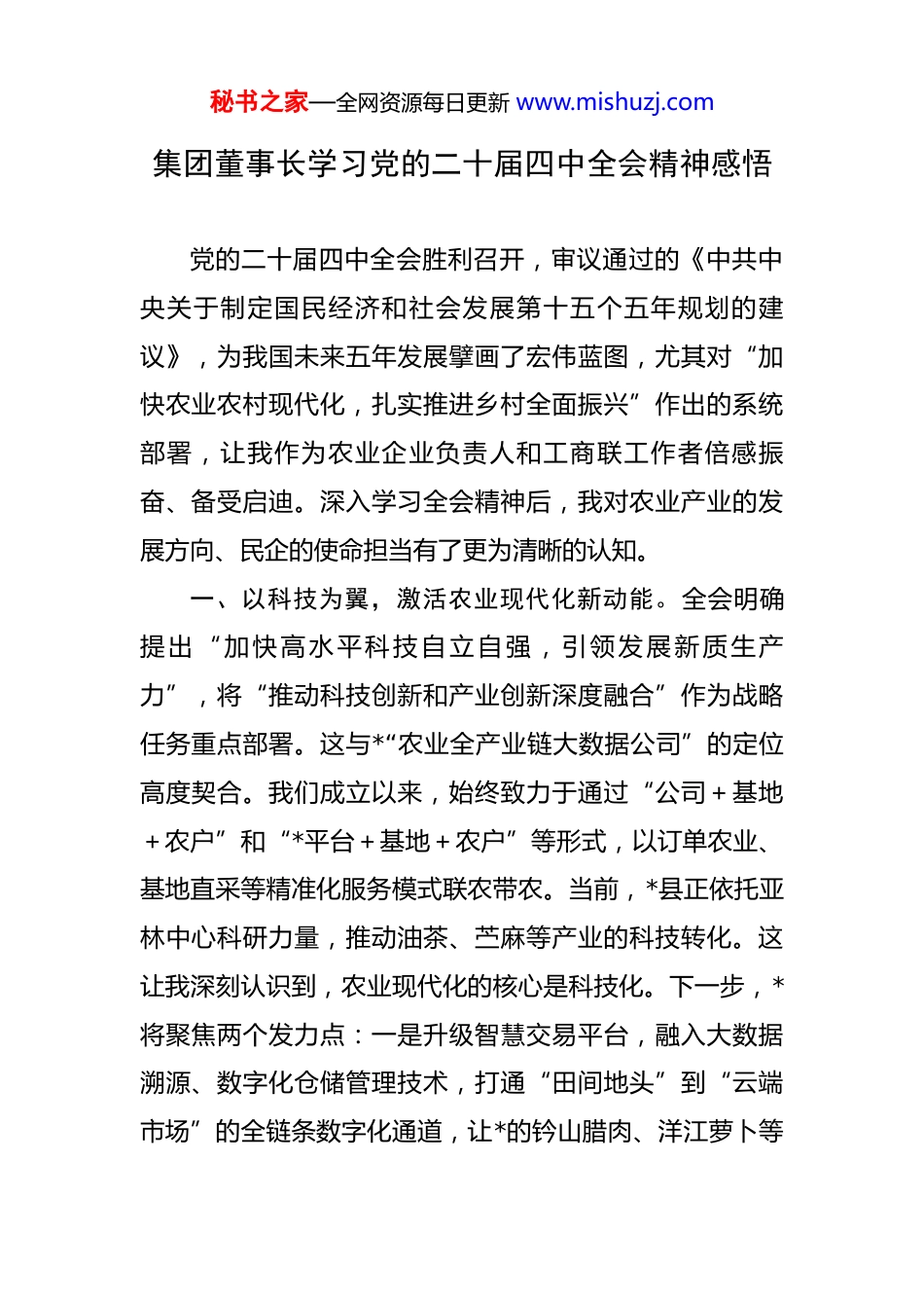 秘书之家—全网资源每日更新 www.mishuzj.com集团董事长学习党的二十届四中全会精神感悟 党的二十届四中全会胜利召开,审议通过的《中共中央关于制定国民经济和社会发展第十五个五年规划的建议》,为我国未来五年发展擘画了宏伟蓝图,尤其对“加快农业农村现代化,扎实推进乡村全面振兴”作出的系统部署,让我作为农业企业负责人和工商联工作者倍感振奋、备受启迪。深入学习全会精神后,我对农业产业的发展方向、民企的使命担当有了更为清晰的认知。一、以科技为翼,激活农业现代化新动能。全会明确提出“加快高水平科技自立自强,引领发展新质生产力”,将“推动科技创新和产业创新深度融合”作为战略任务重点部署。这与*“农业全产业链大数据公司”的定位高度契合。我们成立以来,始终致力于通过“公司+基地+农户”和“*平台+基地+农户”等形式,以订单农业、基地直采等精准化服务模式联农带农。当前,*县正依托亚林中心科研力量,推动油茶、苎麻等产业的科技转化。这让我深刻认识到,农业现代化的核心是科技化。下一步,*将聚焦两个发力点:一是升级智慧交易平台,融入大数据溯源、数字化仓储管理技术,打通“田间地头”到“云端市场”的全链条数字化通道,让*的钤山腊肉、洋江萝卜等秘书之家—全网资源每日更新 www.mishuzj.com特色农产品借助数字动能走向全国,呼应全会“深入推进数字中国建设”的要求;二是深化“科研+企业+农户”合作模式,对接亚林中心等科研机构,引进油茶、中药材种植新技术,培育公司自己的技术团队,让科技创新真正转化为农业增产、农民增收的实效。二、以品牌为魂,打造区域产业发展新引擎。全会强调要“统筹发展科技农业、绿色农业、质量农业、品牌农业,把农业建成现代化大产业”。*市长在调研中明确要求*县全面落实“质量兴农、绿色兴农、品牌强农”战略,持续擦亮“天工宜品”区域公用品牌。*县苎麻产业占据全国三分之一产量,油茶产业获评“全国现代农业高产油茶示范县”,这些都为品牌建设提供了坚实支撑。作为“天工宜品”品牌的参与建设者,*将从三方面发力:一是严控产品质量,建立从种植到销售的全流程质检体系,把“质量兴农”要求贯穿始终;二是丰富品牌内涵,结合《天工开物》文化 IP 与*农业特色,讲好“天工宜品”背后的生态故事、文化故事;三是拓宽传播渠道,借鉴*村播妇联“指尖经济”的成功经验,培育专业直播团队,让区域品牌在云端打响知名度,以品牌效应带动农业产业提质增效。三、以联农为根,践行乡村振兴新使命。全会指出“农业农村现代化关系中国式现代化全局和成色”,明确秘书之家—全网资源每日更新 www.mishuzj.com要“提高强农惠农富农政策效能”。*的发展始终扎根*这片沃土,目前已在 23 个省、自治区开展业务,全国合伙人公司 400 多家,2000 多家生鲜供应链企业采用*模式。未来,我们将深化联农带农机制:一是扩大订单农业规模,与种植户签订长期收购协议,保障农户稳定收入;二是构建利益共享体系,鼓励农户以土地经营权、劳动力等入股,让农户从“打工者”变为“合伙人”,共享产业发展红利;三是助力就业增收,依托农产品加工、智慧平台运营等环节,开发更多就业岗位,重点吸纳脱贫户、农村妇女等群体就业,呼应全会“持续巩固拓展脱贫攻坚成果”的部署。四、以履职为要,凝聚民营经济新力量。作为*县工商联副主席,全会“充分激发各类经营主体活力”“坚持有效市场和有为政府相结合”的部署,让我更加明确工商联的职责定位。*县正聚焦“打造新型工业强市重要增长极、全省县域经济强县”目标,民营经济是不可或缺的力量。我将立足工商联平台,做好三项工作:一是搭建学习桥梁,组织农业领域民营企业深入学习全会精神,帮助企业吃透政策信号、抢抓发展机遇;二是构建协作网络,推动农业企业与工业、文旅企业跨界合作,借鉴*镇“黄茶种植+文旅”的融合模式,拓展农业产业价值空间;三是强化秘书之家—全网资源每日更新 www.mishuzj.com服务对接,反映企业诉求,协助落实要素保障政策,让民营企业在高质量发展道路上轻装上阵。党的二十届四中全会为农业发展指明了方向,也为民营经济赋予了新的...