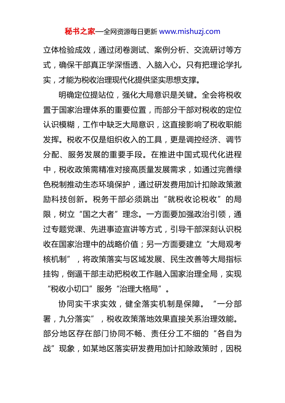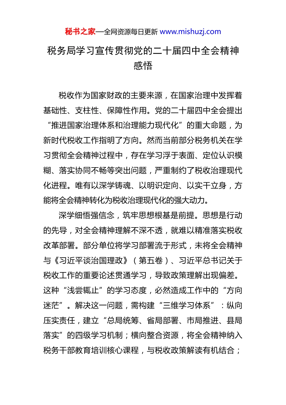 秘书之家—全网资源每日更新 www.mishuzj.com税务局学习宣传贯彻党的二十届四中全会精神感悟 税收作为国家财政的主要来源,在国家治理中发挥着基础性、支柱性、保障性作用。党的二十届四中全会提出“推进国家治理体系和治理能力现代化”的重大命题,为新时代税收工作指明了方向。然而当前部分税务机关在学习贯彻全会精神过程中,存在学习浮于表面、定位认识模糊、落实协同不畅等突出问题,严重制约了税收治理现代化进程。唯有以深学铸魂、以明识定向、以实干立身,方能将全会精神转化为税收治理现代化的强大动力。深学细悟强信念,筑牢思想根基是前提。思想是行动的先导,对全会精神理解不深不透,就难以精准落实税收改革部署。部分单位将学习部署流于形式,未将全会精神与《习近平谈治国理政》(第五卷)、习近平总书记关于税收工作的重要论述贯通学习,导致政策理解出现偏差。这种“浅尝辄止”的学习态度,必然造成工作中的“方向迷茫”。解决这一问题,需构建“三维学习体系”:纵向压实责任,建立“总局统筹、省局部署、市局推进、县局落实”的四级学习机制;横向整合资源,将全会精神纳入税务干部教育培训核心课程,与税收政策解读有机结合;秘书之家—全网资源每日更新 www.mishuzj.com立体检验成效,通过闭卷测试、案例分析、交流研讨等方式,确保干部真正学深悟透、入脑入心。只有把理论学扎实,才能为税收治理现代化提供坚实思想支撑。明确定位提站位,强化大局意识是关键。全会将税收置于国家治理体系的重要位置,而部分干部对税收的定位认识模糊,工作中缺乏大局意识,这直接影响了税收职能发挥。税收不仅是组织收入的工具,更是调控经济、调节分配、服务发展的重要手段。在推进中国式现代化进程中,税收政策需精准对接高质量发展需求,如通过完善绿色税制推动生态环境保护,通过研发费用加计扣除政策激励科技创新。税务干部必须跳出“就税收论税收”的局限,树立“国之大者”理念。一方面要加强政治引领,通过专题党课、先进事迹宣讲等方式,引导干部深刻认识税收在国家治理中的战略价值;另一方面要建立“大局观考核机制”,将政策落实与区域发展、民生改善等大局指标挂钩,倒逼干部主动把税收工作融入国家治理全局,实现“税收小切口”服务“治理大格局”。协同实干求实效,健全落实机制是保障。“一分部署,九分落实”,税收政策落地效果直接关系治理效能。部分地区存在部门协同不畅、责任分工不细的“各自为战”现象,如某地区落实研发费用加计扣除政策时,因税秘书之家—全网资源每日更新 www.mishuzj.com企数据共享不足导致政策推送精准度偏低,这暴露了落实机制的短板。破解这一难题,需构建“协同高效、闭环管理”的落实体系。在内部,厘清各部门职责边界,建立“任务清单、责任清单、时限清单”三单管理模式,明确政策解读、数据筛查、辅导落实等各环节责任主体;在外部,深化部门协作,推动建立税务与财政、科技、市场监管等部门的数据共享平台,打破“信息孤岛”,实现研发费用加计扣除等政策的精准推送、高效落实;在监督上,健全“日常督查+专项检查+回头看”机制,对落实不力、推诿扯皮等问题严肃问责,确保政策落地见效。推进税收治理现代化,是时代赋予税务机关的重大使命。当前,全面深化改革进入攻坚期,税收制度改革任务艰巨繁重。税务机关唯有以深学细悟打通思想“堵点”,以大局意识破解定位“盲点”,以协同实干攻克落实“难点”,才能将党的二十届四中全会精神转化为税收治理的生动实践。让我们以学促干、以干践学,不断提升税收治理能力和水平,为推进国家治理体系和治理能力现代化贡献税务力量!