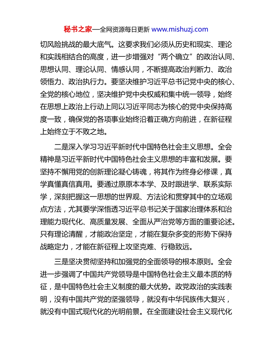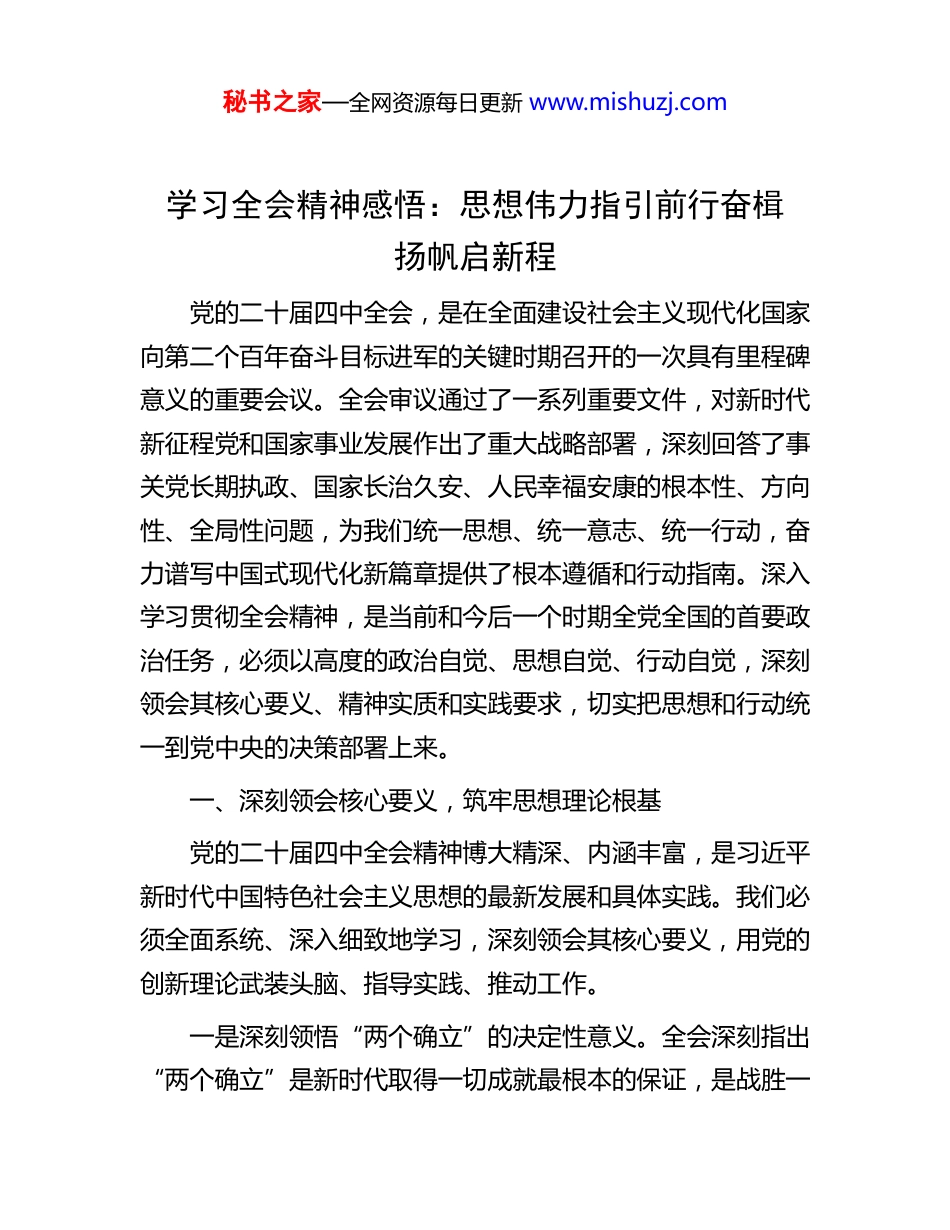 秘书之家—全网资源每日更新 www.mishuzj.com学习全会精神感悟:思想伟力指引前行奋楫扬帆启新程党的二十届四中全会,是在全面建设社会主义现代化国家向第二个百年奋斗目标进军的关键时期召开的一次具有里程碑意义的重要会议。全会审议通过了一系列重要文件,对新时代新征程党和国家事业发展作出了重大战略部署,深刻回答了事关党长期执政、国家长治久安、人民幸福安康的根本性、方向性、全局性问题,为我们统一思想、统一意志、统一行动,奋力谱写中国式现代化新篇章提供了根本遵循和行动指南。深入学习贯彻全会精神,是当前和今后一个时期全党全国的首要政治任务,必须以高度的政治自觉、思想自觉、行动自觉,深刻领会其核心要义、精神实质和实践要求,切实把思想和行动统一到党中央的决策部署上来。一、深刻领会核心要义,筑牢思想理论根基党的二十届四中全会精神博大精深、内涵丰富,是习近平新时代中国特色社会主义思想的最新发展和具体实践。我们必须全面系统、深入细致地学习,深刻领会其核心要义,用党的创新理论武装头脑、指导实践、推动工作。一是深刻领悟“两个确立”的决定性意义。全会深刻指出“两个确立”是新时代取得一切成就最根本的保证,是战胜一秘书之家—全网资源每日更新 www.mishuzj.com切风险挑战的最大底气。这要求我们必须从历史和现实、理论和实践相结合的高度,进一步增强对“两个确立”的政治认同、思想认同、理论认同、情感认同,不断提高政治判断力、政治领悟力、政治执行力。要坚决维护习近平总书记党中央的核心、全党的核心地位,坚决维护党中央权威和集中统一领导,始终在思想上政治上行动上同以习近平同志为核心的党中央保持高度一致,确保党的各项事业始终沿着正确方向前进,在新征程上始终立于不败之地。二是深入学习习近平新时代中国特色社会主义思想。全会精神是习近平新时代中国特色社会主义思想的丰富和发展。要坚持不懈用党的创新理论凝心铸魂,将其作为终身必修课,真学真懂真信真用。要通过原原本本学、及时跟进学、联系实际学,深刻把握这一思想的世界观、方法论和贯穿其中的立场观点方法,尤其要学深悟透习近平总书记关于国家治理体系和治理能力现代化、高质量发展、全面从严治党等方面的重要论述。只有理论清醒,才能政治坚定,才能在复杂多变的形势下保持战略定力,才能在新征程上攻坚克难、行稳致远。三是坚决贯彻坚持和加强党的全面领导的根本原则。全会进一步强调了中国共产党领导是中国特色社会主义最本质的特征,是中国特色社会主义制度的最大优势。政党政治的实践表明,没有中国共产党的坚强领导,就没有中华民族伟大复兴,就没有中国式现代化的光明前景。在全面建设社会主义现代化秘书之家—全网资源每日更新 www.mishuzj.com国家的新征程上,必须毫不动摇地坚持和加强党的全面领导,完善党领导各项事业的体制机制,确保党中央的决策部署得到不折不扣地贯彻执行。各级党组织和广大党员干部要强化党性意识,增强组织观念,自觉服从党的领导,维护党的团结统一,以实际行动诠释对党和人民的忠诚。二、锚定宏伟蓝图,推动中国式现代化建设行稳致远党的二十届四中全会立足新的历史方位,对全面推进中国式现代化作出了更加系统、更加明确的战略部署,为实现中华民族伟大复兴指明了清晰路径。我们必须牢牢把握全会精神的战略意图,将其转化为推动高质量发展的强大动力。一是聚焦高质量发展这一首要任务。全会深刻强调,高质量发展是全面建设社会主义现代化国家的首要任务。这要求我们必须完整、准确、全面贯彻新发展理念,加快构建新发展格局,着力推动经济实现质的有效提升和量的合理增长。要坚持以供给侧结构性改革为主线,不断优化经济结构,提升产业链供应链韧性和安全水平。要大力推进科技创新,实现高水平科技自立自强,为现代化建设提供强大驱动力。要深化改革开放,破除体制机制障碍,激发各类市场主体活力,建设更高水平开放型经济新体制。通过不懈努力,将全会关于高质量发展的各项部署落到实处,转化为实实在在的发展成效。秘书之家—全网资源每日更新 www.mishuzj.com二是深入推进国家治理体系和治理能力现代化。...