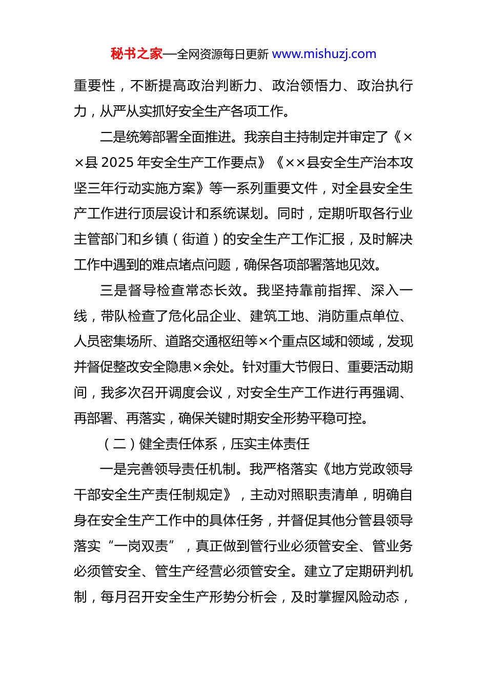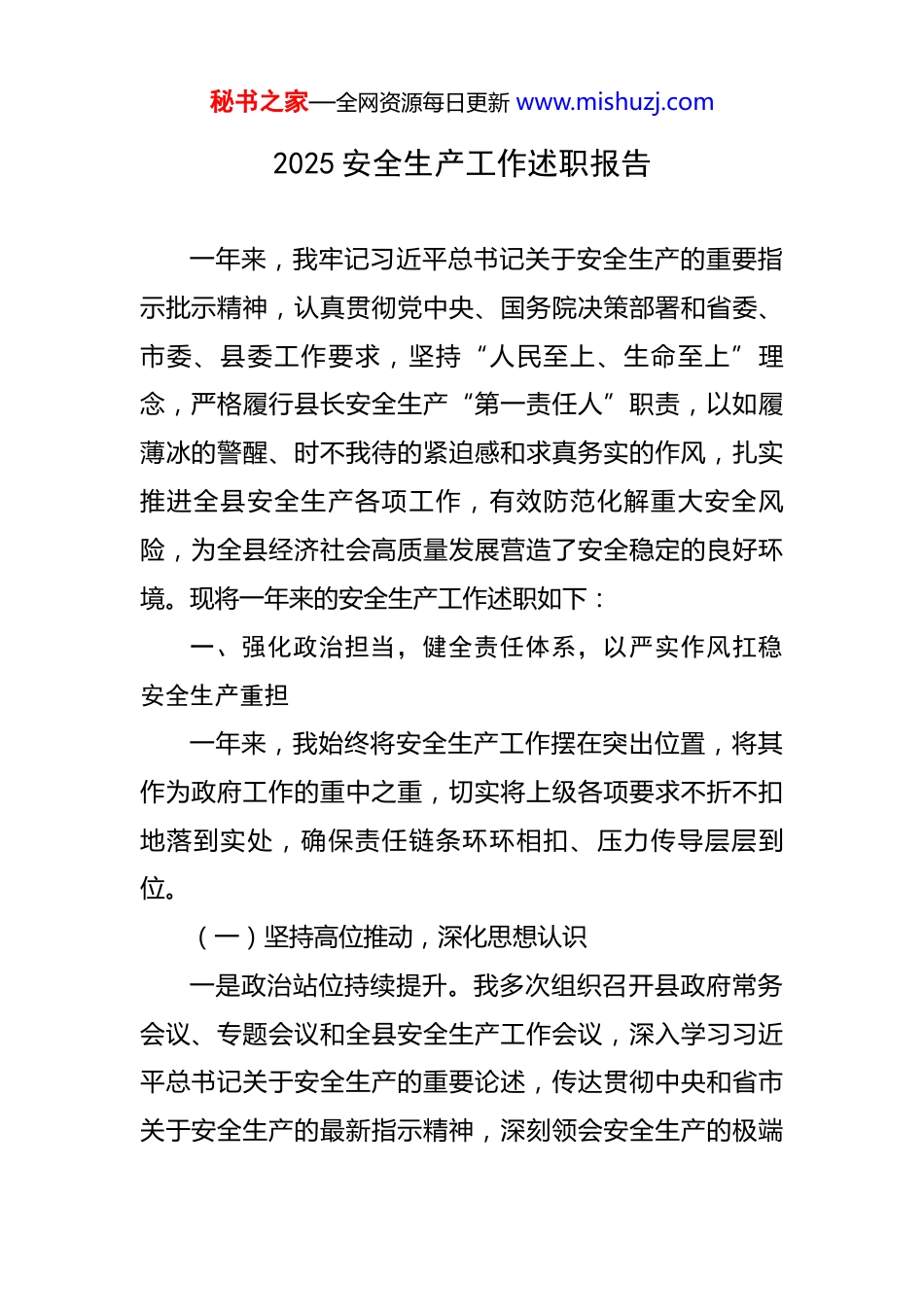 秘书之家—全网资源每日更新 www.mishuzj.com2025 安全生产工作述职报告 一年来,我牢记习近平总书记关于安全生产的重要指示批示精神,认真贯彻党中央、国务院决策部署和省委、市委、县委工作要求,坚持“人民至上、生命至上”理念,严格履行县长安全生产“第一责任人”职责,以如履薄冰的警醒、时不我待的紧迫感和求真务实的作风,扎实推进全县安全生产各项工作,有效防范化解重大安全风险,为全县经济社会高质量发展营造了安全稳定的良好环境。现将一年来的安全生产工作述职如下:一、强化政治担当,健全责任体系,以严实作风扛稳安全生产重担一年来,我始终将安全生产工作摆在突出位置,将其作为政府工作的重中之重,切实将上级各项要求不折不扣地落到实处,确保责任链条环环相扣、压力传导层层到位。(一)坚持高位推动,深化思想认识一是政治站位持续提升。我多次组织召开县政府常务会议、专题会议和全县安全生产工作会议,深入学习习近平总书记关于安全生产的重要论述,传达贯彻中央和省市关于安全生产的最新指示精神,深刻领会安全生产的极端秘书之家—全网资源每日更新 www.mishuzj.com重要性,不断提高政治判断力、政治领悟力、政治执行力,从严从实抓好安全生产各项工作。二是统筹部署全面推进。我亲自主持制定并审定了《××县 2025 年安全生产工作要点》《××县安全生产治本攻坚三年行动实施方案》等一系列重要文件,对全县安全生产工作进行顶层设计和系统谋划。同时,定期听取各行业主管部门和乡镇(街道)的安全生产工作汇报,及时解决工作中遇到的难点堵点问题,确保各项部署落地见效。三是督导检查常态长效。我坚持靠前指挥、深入一线,带队检查了危化品企业、建筑工地、消防重点单位、人员密集场所、道路交通枢纽等×个重点区域和领域,发现并督促整改安全隐患×余处。针对重大节假日、重要活动期间,我多次召开调度会议,对安全生产工作进行再强调、再部署、再落实,确保关键时期安全形势平稳可控。(二)健全责任体系,压实主体责任一是完善领导责任机制。我严格落实《地方党政领导干部安全生产责任制规定》,主动对照职责清单,明确自身在安全生产工作中的具体任务,并督促其他分管县领导落实“一岗双责”,真正做到管行业必须管安全、管业务必须管安全、管生产经营必须管安全。建立了定期研判机制,每月召开安全生产形势分析会,及时掌握风险动态,秘书之家—全网资源每日更新 www.mishuzj.com精准施策。二是强化部门监管责任。督促各行业主管部门结合自身职责,制定详细的安全生产监管计划,明确监管重点、监管标准和监管频次。推动部门之间建立联动机制,形成监管合力,杜绝推诿扯皮现象。对因监管不到位导致事故发生的部门和个人,依法依规严肃追责问责,倒逼责任落实。三是压实企业主体责任。通过召开企业安全生产培训会、签订安全生产承诺书、开展警示教育等多种形式,督促企业严格落实安全生产法,健全内部安全管理制度,加大安全投入,加强员工培训,提升本质安全水平。特别是对高危行业企业,实行重点关注、重点帮扶,指导企业建立健全全员安全生产责任制,确保每一道环节、每一个岗位都有人负责、有人把关。全县×家重点企业均已配备专职安全管理人员,并按要求开展安全风险辨识和隐患排查治理。(三)夯实基层基础,提升治理能力一是充实基层监管力量。针对部分乡镇(街道)和村(社区)安全生产监管力量薄弱的问题,我协调相关部门,通过招录、配备等方式,为基层一线充实了×名专兼职安全监管员,并组织开展了系统培训,提升其专业素养和秘书之家—全网资源每日更新 www.mishuzj.com实战能力。二是推动网格化管理。全面推行安全生产网格化管理模式,将全县划分为×个安全生产网格,明确网格责任人、责任范围和职责任务。利用信息化手段,建立网格化管理信息平台,实现安全隐患的及时发现、上报、整改和销号,提高风险防控的精准性和效率。三是强化科技赋能。积极推动“智慧安监”建设,投资×万元用于安全生产信息化平台升级改造,接入×家重点企业实时监控数据,实现对危险作业、关键设备运行等情况的在线监测和预警。通过大数据分析,...