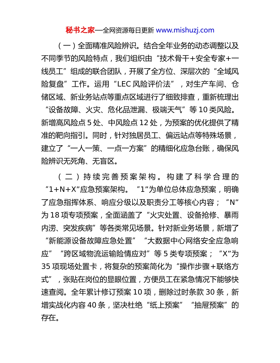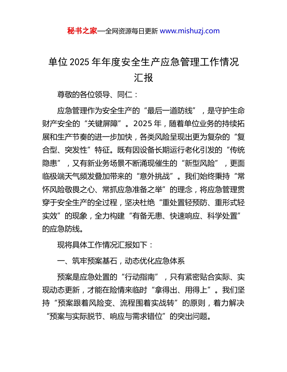 秘书之家—全网资源每日更新 www.mishuzj.com单位 2025 年年度安全生产应急管理工作情况汇报尊敬的各位领导、同仁:应急管理作为安全生产的“最后一道防线”,是守护生命财产安全的“关键屏障”。2025 年,随着单位业务的持续拓展和生产节奏的进一步加快,各类风险呈现出更为复杂的“复合型、突发性”特征。既有因设备长期运行老化引发的“传统隐患”,又有新业务场景不断涌现催生的“新型风险”,更面临极端天气频发叠加带来的“意外挑战”。我们始终秉持“常怀风险敬畏之心、常抓应急准备之举”的理念,将应急管理贯穿于安全生产的全过程,坚决杜绝“重处置轻预防、重形式轻实效”的现象,全力构建“有备无患、快速响应、科学处置”的应急防线。现将具体工作情况汇报如下:一、筑牢预案基石,动态优化应急体系预案是应急处置的“行动指南”,只有紧密贴合实际、实现动态更新,才能在险情来临时“拿得出、用得上”。我们坚持“预案跟着风险变、流程围着实战转”的原则,着力解决“预案与实际脱节、响应与需求错位”的突出问题。秘书之家—全网资源每日更新 www.mishuzj.com(一)全面精准风险辨识。结合全年业务的动态调整以及不同季节的风险特点,我们组织由“技术骨干+安全专家+一线员工”组成的联合团队,开展了全方位、深层次的“全域风险复盘”工作。运用“LEC 风险评价法”,对生产车间、仓储区域、新业务站点等重点区域进行了细致排查,重新梳理出“设备故障、火灾、危化品泄漏、极端天气”等 10 类风险。新增高风险点 5 处、中风险点 12 处,为预案的优化提供了精准的靶向指引。同时,针对独居员工、偏远站点等特殊场景,建立了“一人一策、一点一方案”的精细化应急台账,确保风险辨识无死角、无盲区。( 二 ) 持 续 完 善 预 案 架 构 。 构 建 了 科 学 合 理 的“1+N+X”应急预案架构。“1”为单位总体应急预案,明确了应急指挥体系、响应分级以及职责分工等核心内容;“N”为 18 项专项预案,全面涵盖了“火灾处置、设备抢修、暴雨内涝、突发疾病”等各类常见场景。针对新业务场景,新增了“新能源设备故障应急处置”“大数据中心网络安全应急响应”“跨区域物流运输险情应对”等 5 类专项预案;“X”为35 项现场处置卡,将复杂的预案简化为“操作步骤+联络方式”,张贴在岗位的显眼位置,方便员工在紧急情况下能够快速查阅。全年累计修订预案 10 项,删除过时条款 30 条,新增实战化内容 40 条,坚决杜绝“纸上预案”“抽屉预案”的存在。秘书之家—全网资源每日更新 www.mishuzj.com(三)细化分级响应机制。按照“险情等级定响应、响应等级定力量”的原则,将应急响应细致划分为“四级”:Ⅰ级响应(特别重大险情)由单位应急指挥部统一调度,联动外部消防、医疗、公安等多部门力量协同作战;Ⅱ级响应(重大险情)由分管领导牵头,调动单位专职应急队及相关部门力量进行处置;Ⅲ级响应(较大险情)由部门负责人组织,依托班组应急力量并协调部分外部资源快速处置;Ⅳ级响应(一般险情)由岗位员工自行组织,按照现场处置卡进行初步处理并及时上报。明确了各级响应的“启动条件、处置流程、物资调用、信息上报”标准,全年启动Ⅳ级响应 6 次、Ⅲ级响应 3 次、Ⅱ级响应 1 次,均实现了“分级精准、响应及时”,有效避免了“小题大做浪费资源、大题小做延误处置”的情况发生。二、建强应急铁军,提升专业处置能力应急队伍是应急处置的“核心力量”,只有具备过硬的专业素质和快速的反应能力,才能在险情面前“拉得出、冲得上”。我们打破传统“单一队伍、临时拼凑”的模式,构建了“专职+兼职+联动”的立体化应急队伍体系。(一)锻造专职应急精兵。从生产、设备、安全等多个关键部门选拔 35 名业务骨干,组建了“单位专职应急队”。明确了“24 小时值班备勤、5 分钟内集结”的严格要求,以确保在第一时间响应险情。按照“专业分工”原则,将队伍划分秘书之家—全网资源每日更新 www.mishuzj.com为“灭火救援组、设备抢修组、医疗救护组、疏散引导组、信息保障组”,每组配备了“防化服、破拆工具、急救箱、...