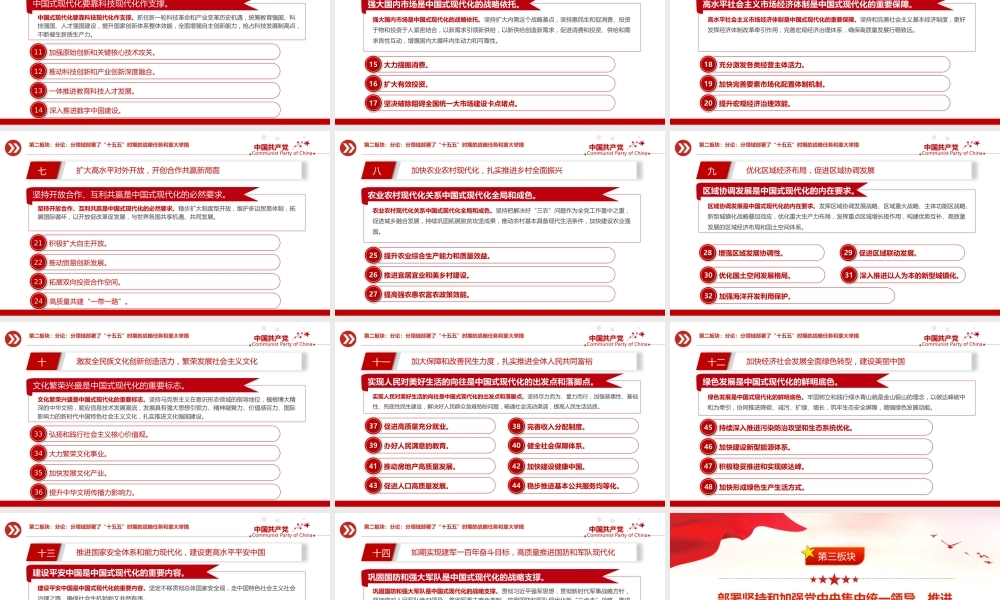 党的二十届四中全会《规划建议》专题解读授 课 人 : X X 时 间 : 2 0 2 5 . 1 1 中国共产党第二十届中央委员会第四次全体会议,于 2025 年 10 月 20 日至 23 日在北京举行。全会最重要的成果是审议通过《中共中央关于制定国民经济和社会发展第十五个五年规划的建议》。《建议》共 15 个部分、 61 条,分为三大板块。前言分论:分领域部署了“十五五”时期的战略任务和重大举措2部署坚持和加强党中央集中统一领导、推进社会主义民主法治建设等任务3总论1目录总论第一板块主要阐述“十四五”时期我国发展取得的重大成就、抓好“十五五”时期经济社会发展的重大意义和总体要求。Communist Party of China中国共产党第一板块:总论“ 十五五”时期是基本实现社会主义现代化的关键时期一“ 十四五”时期我国发展取得重大成就。1“ 十五五”时期在基本实现社会主义现代化进程中具有承前启后的重要地位。2“ 十五五”时期我国发展环境面临深刻复杂变化。3Communist Party of China中国共产党第一板块:总论“ 十五五”时期经济社会发展的指导思想。4坚持马克思列宁主义、毛泽东思想、邓小平理论、“三个代表”重要思想、科学发展观,全面贯彻习近平新时代中国特色社会主义思想,深入贯彻党的二十大和二十届历次全会精神,统筹推进“五位一体”总体布局,协调推进“四个全面”战略布局,统筹国内国际两个大局,完整准确全面贯彻新发展理念,加快构建新发展格局,坚持稳中求进工作总基调,坚持以经济建设为中心,以推动高质量发展为主题,以改革创新为根本动力,以满足人民日益增长的美好生活需要为根本目的,以全面从严治党为根本保障,推动经济实现质的有效提升和量的合理增长,推动人的全面发展、全体人民共同富裕迈出坚实步伐,确保基本实现社会主义现代化取得决定性进展。指导思想“ 十五五”时期经济社会发展的指导方针和主要目标二Communist Party of China中国共产党第一板块:总论“ 十五五”时期经济社会发展必须遵循的原则。5坚决维护党中央权威和集中统一领导,提高党把方向、谋大局、定政策、促改革能力,把党的领导贯穿经济社会发展各方面全过程,为我国社会主义现代化建设提供根本保证。坚持党的全面领导1尊重人民主体地位,紧紧依靠人民,维护人民根本利益,促进社会公平正义,注重在发展中保障和改善民生,在满足民生需求中拓展发展空间,推动经济和社会协调发展、物质文明和精神文明相得益彰,让现代化建设成果更多更公平惠及全体人民。坚持人民至上2以新发展理念引领发展,因地制宜发展新质生产力,做强国内大循环,畅通国内国际双循环,统筹扩大内需和深化供给侧结构性改革,加快培育新动能,促进经济结构优化升级,做优增量、盘活存量,推动经济持续健康发展和社会全面进步。坚持高质量发展3聚焦制约高质量发展的体制机制障碍,推进深层次改革,扩大高水平开放,推动生产关系和生产力、上层建筑和经济基础、国家治理和社会发展更好相适应,持续增强发展动力和社会活力。坚持全面深化改革4充分发挥市场在资源配置中的决定性作用,更好发挥政府作用,构建统一、开放、竞争、有序的市场体系,建设法治经济、信用经济,打造市场化法治化国际化一流营商环境,形成既“放得活”又“管得好”的经济秩序。 坚持有效市场和有为政府相结合 5在发展中固安全,在安全中谋发展,强化底线思维,有效防范化解各类风险,增强经济和社会韧性,以新安全格局保障新发展格局。坚持统筹发展和安全 6Communist Party of China中国共产党第一板块:总论“ 十五五”时期经济社会发展的主要目标。62035在此基础上再奋斗五年,到二〇三五年实现我国经济实力、科技实力、国防实力、综合国力和国际影响力大幅跃升,人均国内生产总值达到中等发达国家水平,人民生活更加幸福美好,基本实现社会主义现代化。高质量发展取得显著成效科技自立自强水平大幅提高社会文明程度明显提升人民生活品质不断提高美丽中国建设取得新的重大进展进一步全面深化改革取得新突破国家安全屏障更加巩固第二板块分论分领域部署“十五五”时期的战略任务和重大举措...