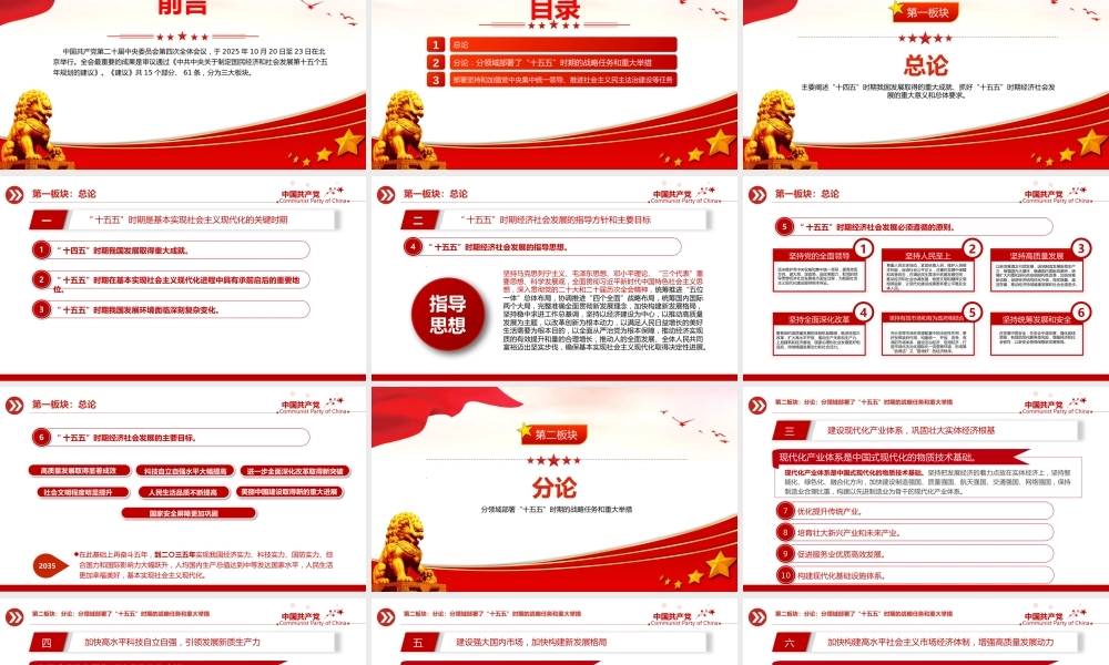 党的二十届四中全会《规划建议》专题解读授 课 人 : X X 时 间 : 2 0 2 5 . 1 1 中国共产党第二十届中央委员会第四次全体会议,于 2025 年 10 月 20 日至 23 日在北京举行。全会最重要的成果是审议通过《中共中央关于制定国民经济和社会发展第十五个五年规划的建议》。《建议》共 15 个部分、 61 条,分为三大板块。前言分论:分领域部署了“十五五”时期的战略任务和重大举措2部署坚持和加强党中央集中统一领导、推进社会主义民主法治建设等任务3总论1目录总论第一板块主要阐述“十四五”时期我国发展取得的重大成就、抓好“十五五”时期经济社会发展的重大意义和总体要求。Communist Party of China中国共产党第一板块:总论“ 十五五”时期是基本实现社会主义现代化的关键时期一“ 十四五”时期我国发展取得重大成就。1“ 十五五”时期在基本实现社会主义现代化进程中具有承前启后的重要地位。2“ 十五五”时期我国发展环境面临深刻复杂变化。3Communist Party of China中国共产党第一板块:总论“ 十五五”时期经济社会发展的指导思想。4坚持马克思列宁主义、毛泽东思想、邓小平理论、“三个代表”重要思想、科学发展观,全面贯彻习近平新时代中国特色社会主义思想,深入贯彻党的二十大和二十届历次全会精神,统筹推进“五位一体”总体布局,协调推进“四个全面”战略布局,统筹国内国际两个大局,完整准确全面贯彻新发展理念,加快构建新发展格局,坚持稳中求进工作总基调,坚持以经济建设为中心,以推动高质量发展为主题,以改革创新为根本动力,以满足人民日益增长的美好生活需要为根本目的,以全面从严治党为根本保障,推动经济实现质的有效提升和量的合理增长,推动人的全面发展、全体人民共同富裕迈出坚实步伐,确保基本实现社会主义现代化取得决定性进展。指导思想“ 十五五”时期经济社会发展的指导方针和主要目标二Communist Party of China中国共产党第一板块:总论“ 十五五”时期经济社会发展必须遵循的原则。5坚决维护党中央权威和集中统一领导,提高党把方向、谋大局、定政策、促改革能力,把党的领导贯穿经济社会发展各方面全过程,为我国社会主义现代化建设提供根本保证。坚持党的全面领导1尊重人民主体地位,紧紧依靠人民,维护人民根本利益,促进社会公平正义,注重在发展中保障和改善民生,在满足民生需求中拓展发展空间,推动经济和社会协调发展、物质文明和精神文明相得益彰,让现代化建设成果更多更公平惠及全体人民。坚持人民至上2以新发展理念引领发展,因地制宜发展新质生产力,做强国内大循环,畅通国内国际双循环,统筹扩大内需和深化供给侧结构性改革,加快培育新动能,促进经济结构优化升级,做优增量、盘活存量,推动经济持续健康发展和社会全面进步。坚持高质量发展3聚焦制约高质量发展的体制机制障碍,推进深层次改革,扩大高水平开放,推动生产关系和生产力、上层建筑和经济基础、国家治理和社会发展更好相适应,持续增强发展动力和社会活力。坚持全面深化改革4充分发挥市场在资源配置中的决定性作用,更好发挥政府作用,构建统一、开放、竞争、有序的市场体系,建设法治经济、信用经济,打造市场化法治化国际化一流营商环境,形成既“放得活”又“管得好”的经济秩序。 坚持有效市场和有为政府相结合 5在发展中固安全,在安全中谋发展,强化底线思维,有效防范化解各类风险,增强经济和社会韧性,以新安全格局保障新发展格局。坚持统筹发展和安全 6Communist Party of China中国共产党第一板块:总论“ 十五五”时期经济社会发展的主要目标。62035在此基础上再奋斗五年,到二〇三五年实现我国经济实力、科技实力、国防实力、综合国力和国际影响力大幅跃升,人均国内生产总值达到中等发达国家水平,人民生活更加幸福美好,基本实现社会主义现代化。高质量发展取得显著成效科技自立自强水平大幅提高社会文明程度明显提升人民生活品质不断提高美丽中国建设取得新的重大进展进一步全面深化改革取得新突破国家安全屏障更加巩固第二板块分论分领域部署“十五五”时期的战略任务和重大举措...