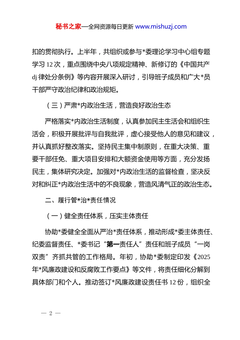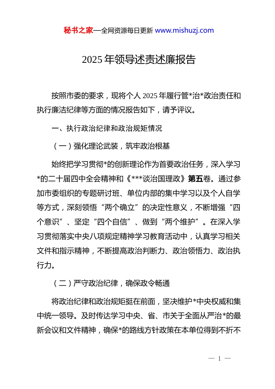 秘书之家—全网资源每日更新 www.mishuzj.com2025 年领导述责述廉报告按照市委的要求,现将个人 2025 年履行管*治*政治责任和执行廉洁纪律等方面的情况报告如下,请予评议。一、执行政治纪律和政治规矩情况(一)强化理论武装,筑牢政治根基始终把学习贯彻*的创新理论作为首要政治任务,深入学习*的二十届四中全会精神和《***谈治国理政》第五卷。通过参加市委组织的专题研讨班、单位内部的集中学习以及个人自学等方式,深刻领悟“两个确立”的决定性意义,不断增强“四个意识”、坚定“四个自信”、做到“两个维护”。在深入学习贯彻落实中央八项规定精神学习教育活动中,认真学习相关文件和指示精神,不断提高政治判断力、政治领悟力、政治执行力。(二)严守政治纪律,确保政令畅通将政治纪律和政治规矩挺在前面,坚决维护*中央权威和集中统一领导。及时传达学习中央、省、市关于全面从严治*的最新会议和文件精神,确保*的路线方针政策在本单位得到不折不— 1 —秘书之家—全网资源每日更新 www.mishuzj.com扣的贯彻执行。上半年,共组织或参与*委理论学习中心组专题学习 12 次,重点围绕中央八项规定精神、新修订的《中国共产dj 律处分条例》等内容开展深入研讨,引导班子成员和广大*员干部严守政治纪律和政治规矩。(三)严肃*内政治生活,营造良好政治生态严格落实*内政治生活制度,认真参加民主生活会和组织生活会,积极开展批评与自我批评,虚心接受他人的意见和建议,并认真抓好整改落实。坚持民主集中制原则,在重大决策、重要干部任免、重大项目安排和大额资金使用等方面,充分发扬民主,集体研究决定。加强对*内政治生活的监督检查,坚决反对和纠正*内政治生活中的不良现象,营造风清气正的政治生态。二、履行管*治*责任情况(一)健全责任体系,压实主体责任协助*委健全全面从严治*责任体系,推动形成*委主体责任、纪委监督责任、*委书记“第一责任人”责任和班子成员“一岗双责”齐抓共管的工作格局。年初,协助*委制定印发《2025年*风廉政建设和反腐败工作要点》等文件,将责任细化分解到具体部门和个人。推动签订*风廉政建设责任书 12 份,组织全— 2 —秘书之家—全网资源每日更新 www.mishuzj.com体干部职工签订廉洁从业承诺书,排查岗位廉洁风险点并制定防控措施超过 220 份,层层压实责任。上半年,协助*委召开 3次*风廉政建设专题研究会,对重要工作亲自部署、重大问题亲自过问,确保责任落到实处。(二)加强干部教育管理,打造高素质队伍加强对干部的思想政治教育,通过开展主题*日活动、廉政教育讲座、观看警示教育片等形式,提高干部的政治觉悟和廉洁自律意识。组织干部深入学习*的二十届四中全会精神和《***谈治国理政》第五卷,引导干部树立正确的世界观、人生观和价值观。加强干部业务培训,定期组织业务学习和技能竞赛,提高干部的业务水平和工作能力。严格干部选拔任用标准和程序,坚持德才兼备、以德为先,选拔任用忠诚干净担当的干部。(三)落实意识形态工作责任制将意识形态工作纳入重要议事日程,定期研究分析意识形态领域形势,制定意识形态工作方案和措施。加强对单位宣传阵地的管理,规范信息发布审核流程,确保发布的信息符合*的路线方针政策和国家法律法规。加强对干部职工的思想引导,通过开展谈心谈话、组织专题讨论等形式,及时了解干部职工— 3 —秘书之家—全网资源每日更新 www.mishuzj.com的思想动态,引导干部职工树立正确的思想观念。上半年,组织开展意识形态专题学习 5 次,对意识形态工作进行专项检查 2次。三、推进*风廉政建设和反腐败工作情况(一)加强廉政教育,增强廉洁意识坚持把廉洁教育作为一体推进“三不腐”的基础性工程来抓。以深入贯彻中央八项规定精神学习教育为契机,牵头组织开展形式多样的警示教育活动 9 次,内容涵盖节前廉政提醒谈话、专题讲座、观看警示教育片及学习典型案例通报等。上半年,累计开展各层级谈心谈话 9 次,重点覆盖新任职干部、关键岗位人员等,做到早提醒、早纠正。充分运用单位微信公众号等新媒体平台,常态化推送廉洁文化信息,营造“以清为美、以廉为荣...