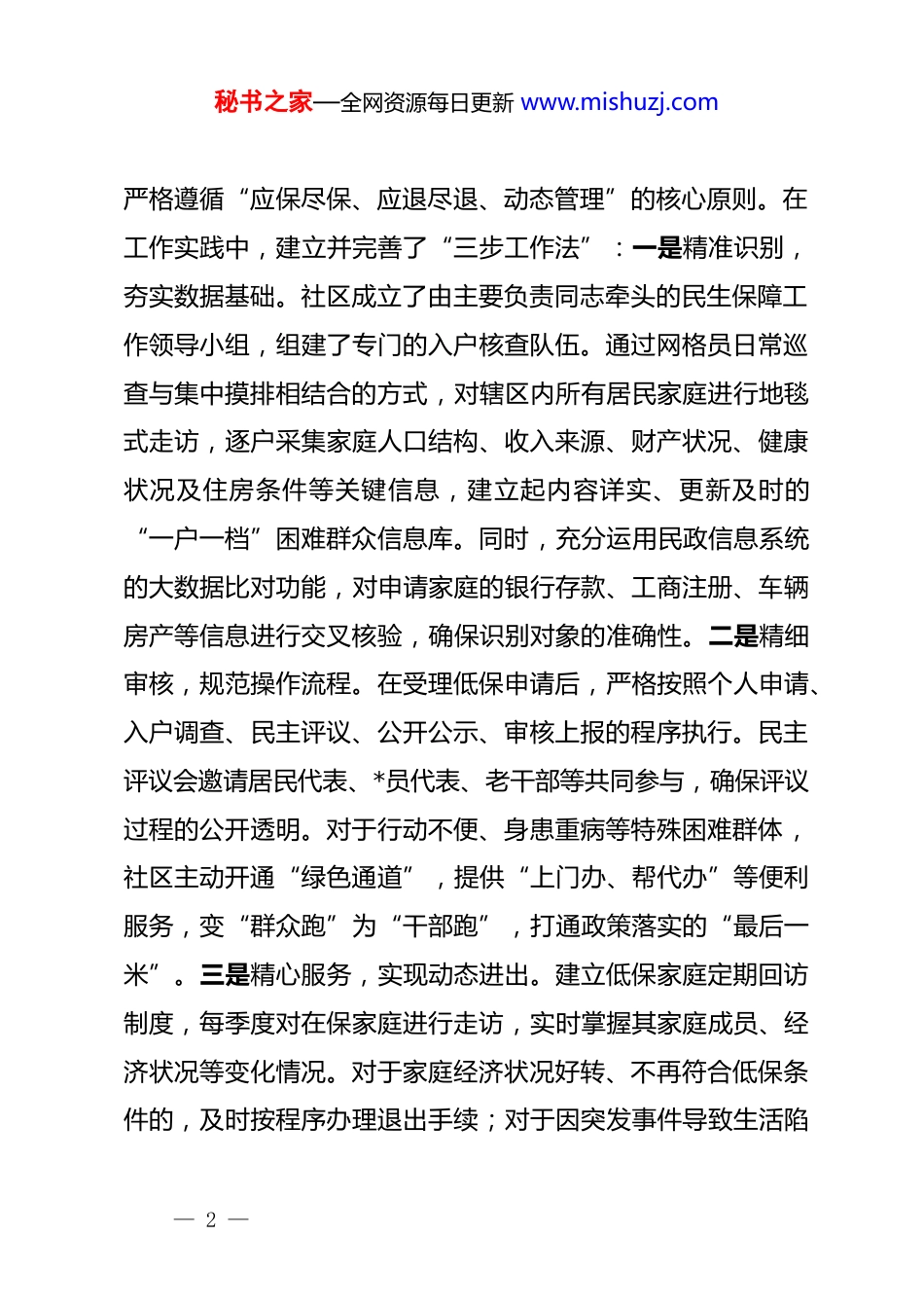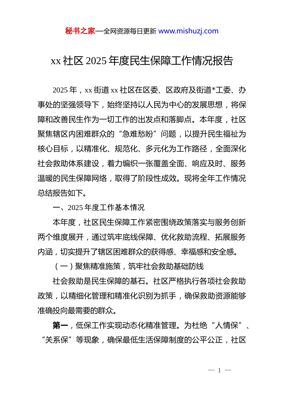 秘书之家—全网资源每日更新 www.mishuzj.comxx 社区 2025 年度民生保障工作情况报告2025 年,xx 街道 xx 社区在区委、区政府及街道*工委、办事处的坚强领导下,始终坚持以人民为中心的发展思想,将保障和改善民生作为一切工作的出发点和落脚点。本年度,社区聚焦辖区内困难群众的“急难愁盼”问题,以提升民生福祉为核心目标,以精准化、规范化、多元化为工作路径,全面深化社会救助体系建设,着力编织一张覆盖全面、响应及时、服务温暖的民生保障网络,取得了阶段性成效。现将全年工作情况总结报告如下。一、2025 年度工作基本情况本年度,社区民生保障工作紧密围绕政策落实与服务创新两个维度展开,通过筑牢底线保障、优化救助流程、拓展服务内涵,切实提升了辖区困难群众的获得感、幸福感和安全感。(一)聚焦精准施策,筑牢社会救助基础防线社会救助是民生保障的基石。社区严格执行各项社会救助政策,以精细化管理和精准化识别为抓手,确保救助资源能够准确投向最需要的群众。第一,低保工作实现动态化精准管理。为杜绝“人情保”、“关系保”等现象,确保最低生活保障制度的公平公正,社区— 1 —秘书之家—全网资源每日更新 www.mishuzj.com严格遵循“应保尽保、应退尽退、动态管理”的核心原则。在工作实践中,建立并完善了“三步工作法”:一是精准识别,夯实数据基础。社区成立了由主要负责同志牵头的民生保障工作领导小组,组建了专门的入户核查队伍。通过网格员日常巡查与集中摸排相结合的方式,对辖区内所有居民家庭进行地毯式走访,逐户采集家庭人口结构、收入来源、财产状况、健康状况及住房条件等关键信息,建立起内容详实、更新及时的“一户一档”困难群众信息库。同时,充分运用民政信息系统的大数据比对功能,对申请家庭的银行存款、工商注册、车辆房产等信息进行交叉核验,确保识别对象的准确性。二是精细审核,规范操作流程。在受理低保申请后,严格按照个人申请、入户调查、民主评议、公开公示、审核上报的程序执行。民主评议会邀请居民代表、*员代表、老干部等共同参与,确保评议过程的公开透明。对于行动不便、身患重病等特殊困难群体,社区主动开通“绿色通道”,提供“上门办、帮代办”等便利服务,变“群众跑”为“干部跑”,打通政策落实的“最后一米”。三是精心服务,实现动态进出。建立低保家庭定期回访制度,每季度对在保家庭进行走访,实时掌握其家庭成员、经济状况等变化情况。对于家庭经济状况好转、不再符合低保条件的,及时按程序办理退出手续;对于因突发事件导致生活陷— 2 —秘书之家—全网资源每日更新 www.mishuzj.com入困境的新增困难家庭,则迅速启动纳入程序,实现保障对象的有进有出、动态平衡。截至 2025 年 10 月底,社区共有在册低保对象 72 户 134 人,实现了对困难群体的精准覆盖与动态管理。第二,临时救助发挥“及时雨”关键作用。针对群众因病、因灾、因学等突发性、紧迫性困难,社区依托成熟的网格化管理体系,构建了高效的临时救助快速响应机制。社区网格员作为“民情观察员”和“政策宣传员”,通过日常巡查、邻里互助、居民信息反馈等多种渠道,第一时间掌握辖区群众的突发困难。例如,居民张女士的家庭因其配偶突发重病住院,高昂的医疗费用使其家庭瞬间陷入困境。网格员在巡查中了解到此情况后,立即向社区报告。社区在接到报告后,第一时间启动临时救助应急预案,工作人员当天即上门核实情况、指导申请,仅用 5 个工作日便完成了从申请、审核到救助金发放的全过程,有效缓解了该家庭的燃眉之急。今年以来,社区共受理并办结临时救助申请 34 起,救助范围涵盖了因病致贫、因学致困、意外事故等多种类型,切实发挥了临时救助“救急解难”的兜底保障作用。(二)创新服务模式,提升多元帮扶综合效能在做好政策性兜底保障的基础上,社区积极延伸服务链条,— 3 —秘书之家—全网资源每日更新 www.mishuzj.com整合社会资源,针对不同困难群体的个性化需求,开展了一系列富有特色、充满温度的帮扶活动,推动民生保障从“生存型”救助向“发展型”帮扶转变。第一,聚焦特殊群体,提供精准化...