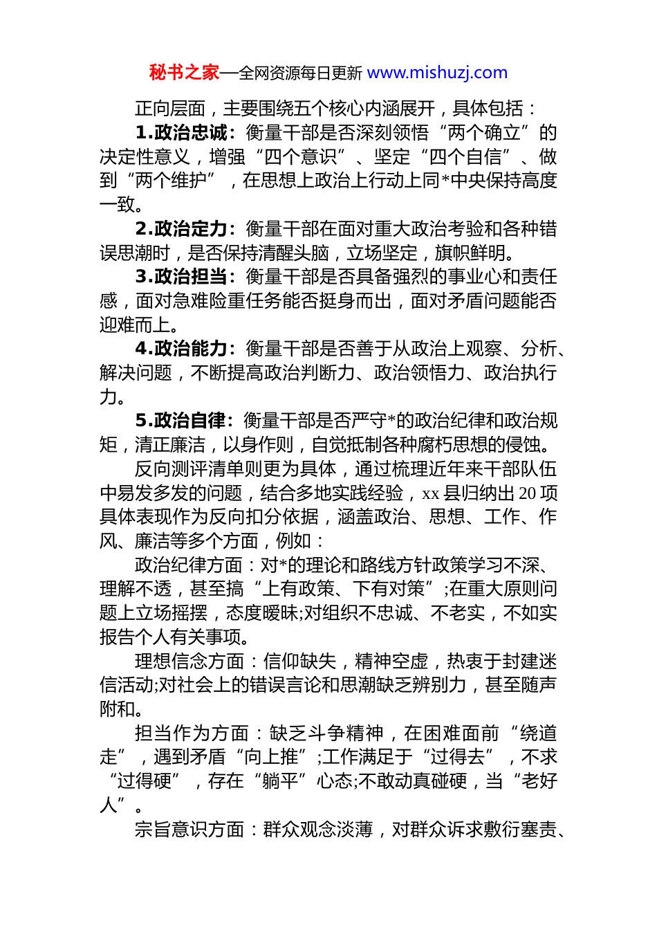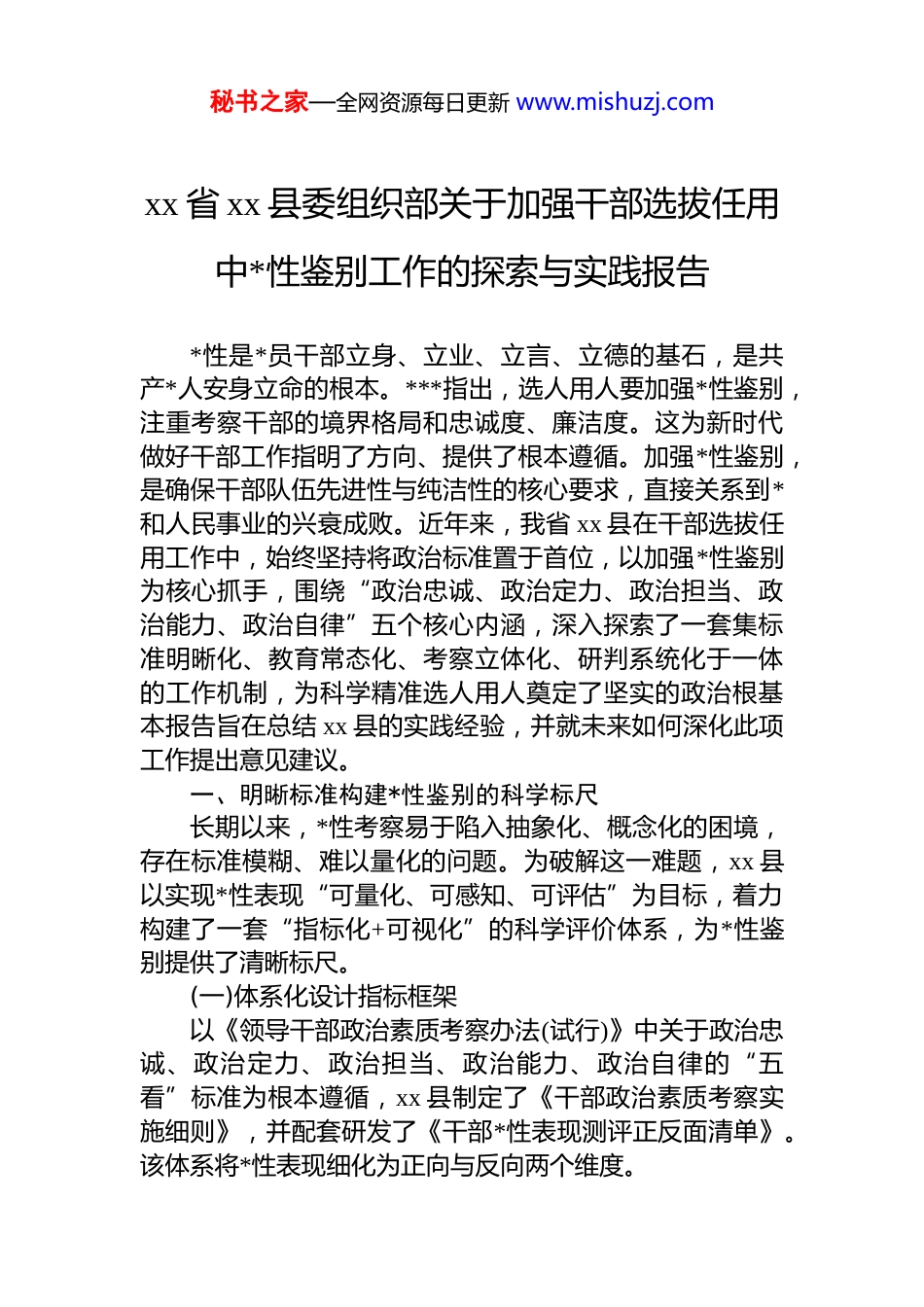 秘书之家—全网资源每日更新 www.mishuzj.comxx 省 xx 县委组织部关于加强干部选拔任用中*性鉴别工作的探索与实践报告*性是*员干部立身、立业、立言、立德的基石,是共产*人安身立命的根本。***指出,选人用人要加强*性鉴别,注重考察干部的境界格局和忠诚度、廉洁度。这为新时代做好干部工作指明了方向、提供了根本遵循。加强*性鉴别,是确保干部队伍先进性与纯洁性的核心要求,直接关系到*和人民事业的兴衰成败。近年来,我省 xx 县在干部选拔任用工作中,始终坚持将政治标准置于首位,以加强*性鉴别为核心抓手,围绕“政治忠诚、政治定力、政治担当、政治能力、政治自律”五个核心内涵,深入探索了一套集标准明晰化、教育常态化、考察立体化、研判系统化于一体的工作机制,为科学精准选人用人奠定了坚实的政治根基本报告旨在总结 xx 县的实践经验,并就未来如何深化此项工作提出意见建议。一、明晰标准构建*性鉴别的科学标尺长期以来,*性考察易于陷入抽象化、概念化的困境,存在标准模糊、难以量化的问题。为破解这一难题,xx 县以实现*性表现“可量化、可感知、可评估”为目标,着力构建了一套“指标化+可视化”的科学评价体系,为*性鉴别提供了清晰标尺。(一)体系化设计指标框架以《领导干部政治素质考察办法(试行)》中关于政治忠诚、政治定力、政治担当、政治能力、政治自律的“五看”标准为根本遵循,xx 县制定了《干部政治素质考察实施细则》,并配套研发了《干部*性表现测评正反面清单》。该体系将*性表现细化为正向与反向两个维度。秘书之家—全网资源每日更新 www.mishuzj.com正向层面,主要围绕五个核心内涵展开,具体包括:1.政治忠诚:衡量干部是否深刻领悟“两个确立”的决定性意义,增强“四个意识”、坚定“四个自信”、做到“两个维护”,在思想上政治上行动上同*中央保持高度一致。2.政治定力:衡量干部在面对重大政治考验和各种错误思潮时,是否保持清醒头脑,立场坚定,旗帜鲜明。3.政治担当:衡量干部是否具备强烈的事业心和责任感,面对急难险重任务能否挺身而出,面对矛盾问题能否迎难而上。4.政治能力:衡量干部是否善于从政治上观察、分析、解决问题,不断提高政治判断力、政治领悟力、政治执行力。5.政治自律:衡量干部是否严守*的政治纪律和政治规矩,清正廉洁,以身作则,自觉抵制各种腐朽思想的侵蚀。反向测评清单则更为具体,通过梳理近年来干部队伍中易发多发的问题,结合多地实践经验,xx 县归纳出 20 项具体表现作为反向扣分依据,涵盖政治、思想、工作、作风、廉洁等多个方面,例如:政治纪律方面:对*的理论和路线方针政策学习不深、理解不透,甚至搞“上有政策、下有对策”;在重大原则问题上立场摇摆,态度暧昧;对组织不忠诚、不老实,不如实报告个人有关事项。理想信念方面:信仰缺失,精神空虚,热衷于封建迷信活动;对社会上的错误言论和思潮缺乏辨别力,甚至随声附和。担当作为方面:缺乏斗争精神,在困难面前“绕道走”,遇到矛盾“向上推”;工作满足于“过得去”,不求“过得硬”,存在“躺平”心态;不敢动真碰硬,当“老好人”。宗旨意识方面:群众观念淡薄,对群众诉求敷衍塞责、秘书之家—全网资源每日更新 www.mishuzj.com推诿扯皮;追求个人享乐,在服务群众时摆架子、耍官威。工作作风方面:作风漂浮,调查研究走过场、不深入;形式主义、官僚主义问题突出,热衷于做表面文章;不注重团结,搞“小圈子”。廉洁自律方面:规矩意识淡薄,违规收受礼品礼金;利用职权或影响力为亲属及身边工作人员谋取私利;生活作风不检点,家风不正。其他方面:网络言行不当,造成不良影响;心理素质不佳,在压力面前表现出消极或极端情绪。通过“正向赋分+反向扣分”的双维量化评分体系,干部的“政治画像”与“*性画像”不再是模糊的定性描述,而是转化为可比较、可分析的直观数据,实现了科学精准的初步描绘。(二)动态化调整个性指标*性标准并非一成不变。xx 县坚持每年结合*的最新理论创新成果、国家重大战略部署以及县域经济社会发展的中心任务,对*性评价指标进行动态优化调整,确保指标体系始终紧扣时代脉搏、服务中心大局。同时...