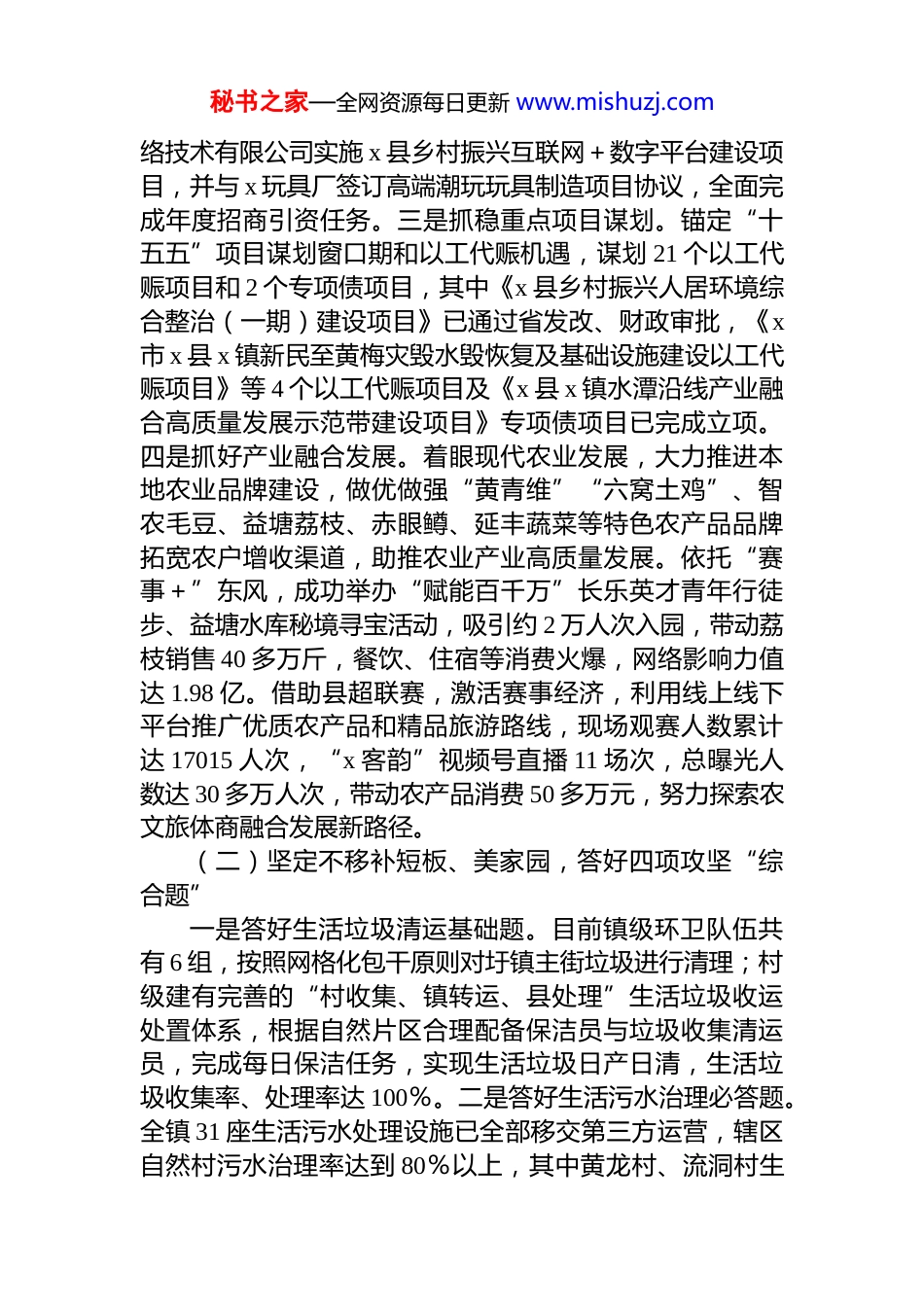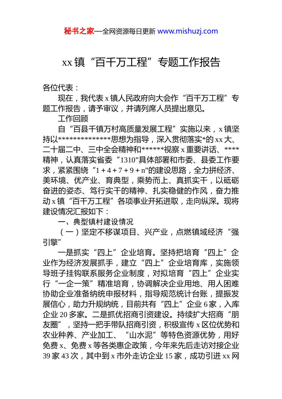 秘书之家—全网资源每日更新 www.mishuzj.comxx 镇“百千万工程”专题工作报告各位代表:现在,我代表 x 镇人民政府向大会作“百千万工程”专题工作报告,请予审议,并请列席人员提出意见。工作回顾自“百县千镇万村高质量发展工程”实施以来,x 镇坚持以**************思想为指导,深入贯彻落实*的 xx 大、二十届二中、三中全会精神和******视察 x 重要讲话、****精神,认真落实省委“1310”具体部署和市委、县委工作要求,紧紧围绕“1+4+7+9+n”的建设思路,全力拼经济、美环境、优产业、育典型,乘势而上、真抓实干,以砥砺奋进的姿态、笃行实干的精神、扎实稳健的作风,奋力推动 x 镇“百千万工程”各项事业开拓进取,走向纵深。现将建设情况汇报如下:一、典型镇村建设情况(一)坚定不移谋项目、兴产业,点燃镇域经济“强引擎”一是抓实“四上”企业培育。坚持把培育“四上”企业作为经济发展抓手,建立“四上”企业培育库,实施领导班子挂钩联系服务企业制度,对拟培育“四上”企业实行“一企一策”精准培育,协调解决企业用地、用人困难协助企业准备纳统申报材料,指导规范统计台账,提振发展信心,助力升规纳统,目前共有“四上”企业 6 家,入库企业 20 多家。二是抓优招商引资建设。持续扩大招商“朋友圈”,坚持一把手带队招商引资,积极宣传 x 区位优势和农业种养、产业加工、“山水泥”等特色资源优势,用好免费 x、免费 x 等各类惠企政策,今年来先后走访对接企业39 家 43 次,其中到 x 市外走访企业 15 家,成功引进 xx 网秘书之家—全网资源每日更新 www.mishuzj.com络技术有限公司实施 x 县乡村振兴互联网+数字平台建设项目,并与 x 玩具厂签订高端潮玩玩具制造项目协议,全面完成年度招商引资任务。三是抓稳重点项目谋划。锚定“十五五”项目谋划窗口期和以工代赈机遇,谋划 21 个以工代赈项目和 2 个专项债项目,其中《x 县乡村振兴人居环境综合整治(一期)建设项目》已通过省发改、财政审批,《x市 x 县 x 镇新民至黄梅灾毁水毁恢复及基础设施建设以工代赈项目》等 4 个以工代赈项目及《x 县 x 镇水潭沿线产业融合高质量发展示范带建设项目》专项债项目已完成立项。四是抓好产业融合发展。着眼现代农业发展,大力推进本地农业品牌建设,做优做强“黄青维”“六窝土鸡”、智农毛豆、益塘荔枝、赤眼鳟、延丰蔬菜等特色农产品品牌拓宽农户增收渠道,助推农业产业高质量发展。依托“赛事+”东风,成功举办“赋能百千万”长乐英才青年行徒步、益塘水库秘境寻宝活动,吸引约 2 万人次入园,带动荔枝销售 40 多万斤,餐饮、住宿等消费火爆,网络影响力值达 1.98 亿。借助县超联赛,激活赛事经济,利用线上线下平台推广优质农产品和精品旅游路线,现场观赛人数累计达 17015 人次,“x 客韵”视频号直播 11 场次,总曝光人数达 30 多万人次,带动农产品消费 50 多万元,努力探索农文旅体商融合发展新路径。(二)坚定不移补短板、美家园,答好四项攻坚“综合题”一是答好生活垃圾清运基础题。目前镇级环卫队伍共有 6 组,按照网格化包干原则对圩镇主街垃圾进行清理;村级建有完善的“村收集、镇转运、县处理”生活垃圾收运处置体系,根据自然片区合理配备保洁员与垃圾收集清运员,完成每日保洁任务,实现生活垃圾日产日清,生活垃圾收集率、处理率达 100%。二是答好生活污水治理必答题。全镇 31 座生活污水处理设施已全部移交第三方运营,辖区自然村污水治理率达到 80%以上,其中黄龙村、流洞村生秘书之家—全网资源每日更新 www.mishuzj.com活污水治理率达到 90%以上。三是答好厕所革命管控加分题。对全镇 54 座公厕实行造册登记,参照环卫公厕管养标准,对农村公厕的日常管护、保洁标准提出明确要求,由各村落实好日常管养责任,并安排保洁队伍做好日常打扫工作,均已达到“四净三无两通一明”要求。四是答好“六乱”集中整治重点题。组建圩镇“六乱”整治专班,常态化开展治理和环境整治行动,针对圩镇主街道路狭隘占道经营严重等问题,柔性执法,疏堵结合,拆除圩镇危旧建筑...