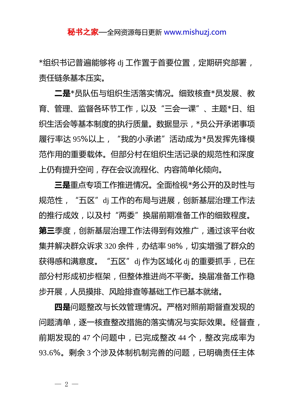 秘书之家—全网资源每日更新 www.mishuzj.comxx 镇 2025 年第三季度基层 dj 工作督查情况报告为全面总结 2025 年第三季度基层 dj 工作成效,深入分析存在问题,明确下阶段工作方向,现将 xx 镇第三季度基层 dj 工作督查情况报告如下。一、基本情况2025 年第三季度,xx 镇*委紧密围绕年度 dj 工作部署,以压实责任、推动发展为核心目标,周密组织开展了全镇范围内的基层 dj 工作专项督查。本次督查成立专项工作组,对全镇 19个村*组织实现了全覆盖检查。工作组坚持问题导向,采取查阅台账资料、实地查看阵地建设、个别访谈、现场询问相结合的方式,对基层 dj 重点任务落实情况进行系统梳理和深度检视,旨在通过精准督查促规范提升,以严格督导保责任落实。督查工作聚焦核心任务,主要涵盖以下几个方面:一是*组织履职与政治建设情况。重点检查各村*组织书记履行抓 dj 第一责任人职责情况,以及政治理论学习的常态化、制度化落实情况。督查结果显示,第三季度各村*组织在政治理论学习方面成效显著,累计开展集中学习活动 190 余场次,参与*员达 3000 余人次,学习贯彻*的创新理论不断走深走实。村— 1 —秘书之家—全网资源每日更新 www.mishuzj.com*组织书记普遍能够将 dj 工作置于首要位置,定期研究部署,责任链条基本压实。二是*员队伍与组织生活落实情况。细致核查*员发展、教育、管理、监督各环节工作,以及“三会一课”、主题*日、组织生活会等基本制度的执行质量。数据显示,*员公开承诺事项履行率达 95%以上,“我的小承诺”活动成为*员发挥先锋模范作用的重要载体。但部分村在组织生活记录的规范性和深度上仍有提升空间,存在会议流程化、内容简单化倾向。三是重点专项工作推进情况。全面检视*务公开的及时性与规范性,“五区”dj 工作的布局与进展,创新基层治理工作法的推行成效,以及村“两委”换届前期准备工作的细致程度。第三季度,创新基层治理工作法得到有效推广,通过该平台收集并解决群众诉求 320 余件,办结率 98%,切实增强了群众的获得感和满意度。“五区”dj 作为区域化 dj 的重要抓手,已在部分村形成初步框架,但整体推进尚不平衡。换届准备工作稳步开展,人员摸排、风险排查等基础工作已基本就绪。四是问题整改与长效管理情况。严格对照前期督查发现的问题清单,逐一核查整改措施的落实情况与实际效果。经督查,前期发现的 47 个问题中,已完成整改 44 个,整改完成率为93.6%。剩余 3 个涉及体制机制完善的问题,已明确责任主体— 2 —秘书之家—全网资源每日更新 www.mishuzj.com和阶段性目标,正在持续推进中。工作组对整改不彻底、不及时的 2 个村*组织进行了现场批评和业务指导,确保问题清零见底。总体而言,第三季度全镇基层 dj 工作基础持续夯实,*组织政治功能和组织功能得到进一步增强,在推动基层治理、服务乡村振兴等方面的引领作用日益凸显,为区域经济社会发展提供了坚实的组织保障。二、存在问题在肯定成绩的同时,督查也清醒地认识到,对照新时代 dj工作的高标准、严要求,我镇基层 dj 工作仍存在一些亟待解决的短板和不足,主要体现在以下几个方面:第一,dj 责任传导存在温差,部分村*组织书记履职尽责存在短板。少数村*组织书记对“抓好 dj 是最大政绩”的认识仍停留在口头上,未能完全转化为行动自觉。在谋划工作时,重经济、轻 dj 的观念尚未彻底扭转,对 dj 工作的投入精力不足,满足于完成“规定动作”,缺乏打造特色亮点的主动性和创造性,导致本村 dj 工作长期在低位徘徊,未能形成有效突破。第二,dj 工作与中心任务融合度不高,“两张皮”现象依然存在。部分村*组织在推动“dj+”模式时,思路不开阔,方法不多,未能找到 dj 工作与产业发展、乡村建设、民生改善等中— 3 —秘书之家—全网资源每日更新 www.mishuzj.com心任务的精准结合点。例如,“五区”dj 工作在实际操作中存在表层化、形式化倾向,简单地认为“挂了牌子、开了会”就是开展了工作,未能真正将*组织的组织力转化为推动产业升级、破解发展难题的强大动力,dj 优势未能有效转化为...