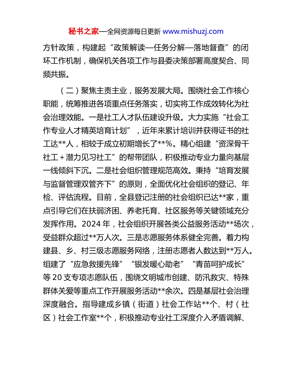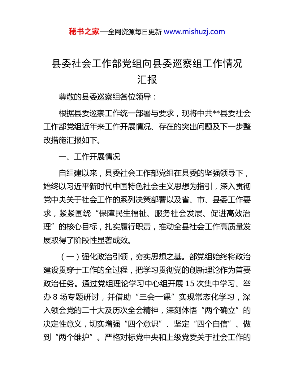 秘书之家—全网资源每日更新 www.mishuzj.com县委社会工作部党组向县委巡察组工作情况汇报尊敬的县委巡察组各位领导:根据县委巡察工作统一部署与要求,现将中共**县委社会工作部党组近年来工作开展情况、存在的突出问题及下一步整改措施汇报如下。一、工作开展情况自组建以来,县委社会工作部党组在县委的坚强领导下,始终以习近平新时代中国特色社会主义思想为指引,深入贯彻党中央关于社会工作的系列决策部署以及省、市、县委工作要求,紧紧围绕“保障民生福祉、服务社会发展、促进高效治理”的核心目标,扎实履行职责,推动全县社会工作高质量发展取得了阶段性显著成效。(一)强化政治引领,夯实思想之基。部党组始终将政治建设贯穿于工作的全过程,把学习贯彻党的创新理论作为首要政治任务。通过党组理论学习中心组开展 15 次集中学习、举办 8 场专题研讨,并借助“三会一课”实现常态化学习,深入领会党的二十大及历次全会精神,深刻体悟“两个确立”的决定性意义,切实增强“四个意识”、坚定“四个自信”、做到“两个维护”。严格对标党中央和上级党委关于社会工作的秘书之家—全网资源每日更新 www.mishuzj.com方针政策,构建起“政策解读—任务分解—落地督查”的闭环工作机制,确保机关各项工作与县委决策部署高度契合、同频共振。(二)聚焦主责主业,服务发展大局。围绕社会工作核心职能,统筹推进各项重点任务落实,切实将工作成效转化为社会治理效能。一是社工人才队伍建设升级。大力实施“社会工作专业人才精英培育计划”,近年来累计培训并获得证书的社工达**人,相较于成立初期增长了**%。精心组建“资深骨干社工+潜力见习社工”的帮带团队,积极推动专业力量向基层一线倾斜下沉。二是社会组织管理规范高效。秉持“培育发展与监督管理双管齐下”的原则,全面优化社会组织的登记、年检、评估流程。目前,全县登记注册的社会组织已达**家,重点引导它们在扶弱济困、养老托育、社区服务等关键领域充分发挥作用。2024 年,社会组织开展各类公益服务活动**场次,受益群众超过**万人次。三是志愿服务体系健全完善。着力构建县、乡、村三级志愿服务网络,注册志愿者人数达到**万人。组建了“应急救援先锋”“银发暖心助老”“青苗呵护成长”等 20 支专项志愿队伍,围绕文明城市创建、防汛救灾、特殊群体关爱等重点工作开展服务活动**余次。四是基层社会治理深度融合。指导建成乡镇(街道)社会工作站**个、村(社区)社会工作室**个,积极推动专业社工深度介入矛盾调解、秘书之家—全网资源每日更新 www.mishuzj.com心理疏导、社区营造等工作。2024 年,协助化解基层纠纷**起,为平安**、法治**建设提供了有力支持。(三)深化改革创新,激发工作活力。积极探索社会工作的新模式、新方法,不断激发工作活力和创造力。一是数字化赋能社工服务。搭建“智慧社工服务平台”,整合社工人才信息、社会组织资源、志愿服务项目等数据,实现信息共享和精准对接。通过平台发布服务需求**条,匹配服务项目**个,提高了服务效率和质量。二是跨部门协同合作机制。与民政、教育、卫生等部门建立常态化沟通协调机制,形成工作合力。联合开展“关爱困境儿童”“社区健康服务”等项目,整合资源,提高服务的针对性和有效性。三是品牌项目打造。打造“社工+志愿者”联动服务品牌,通过项目化运作,引导社工和志愿者在社区服务、养老服务等领域开展特色服务。该品牌项目获得了社会各界的广泛认可和好评。(四)加强自身建设,提升工作效能。注重加强部党组自身建设,提高干部队伍的综合素质和工作能力。一是干部教育培训。制定年度干部教育培训计划,开展政治理论、业务知识、法律法规等方面的培训**次,培训干部**人次,提高了干部的政治素养和业务水平。二是党风廉政建设。严格落实党风廉政建设主体责任,签订廉政责任书,加强廉政教育和监督检查。开展廉政风险排查,制定防控措施,确保干部廉洁从政。三是工作作风改进。深入开展作风建设专项整治活动,坚决反对形秘书之家—全网资源每日更新 www.mishuzj.com式主义、官僚主义,树立务实高效的工作作风。加强工作纪律管...