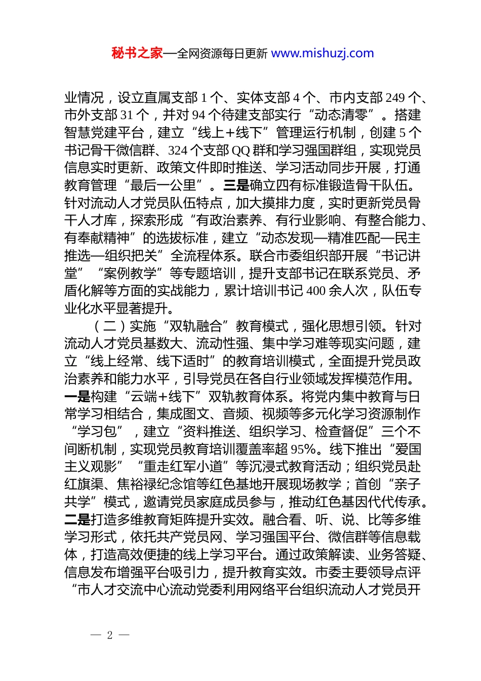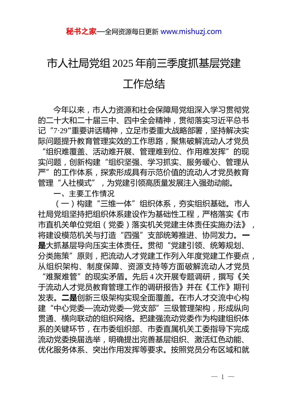 秘书之家—全网资源每日更新 www.mishuzj.com市人社局党组 2025 年前三季度抓基层党建工作总结今年以来,市人力资源和社会保障局党组深入学习贯彻党的二十大和二十届三中、四中全会精神,贯彻落实习近平总书记“7·29”重要讲话精神,立足市委重大战略部署,坚持解决实际问题提升教育管理实效的工作思路,聚焦破解流动人才党员“组织难覆盖、活动难开展、管理难到位、作用难发挥”的现实问题,创新构建“组织坚强、学习抓实、服务暖心、管理从严”的工作体系,探索形成具有示范价值的流动人才党员教育管理“人社模式”,为党建引领高质量发展注入强劲动能。一、主要工作情况(一)构建“三维一体”组织体系,夯实组织基础。市人社局党组坚持把组织体系建设作为基础性工程,严格落实《市市直机关单位党组(党委)落实机关党建主体责任实施办法》,将建设模范机关与打造“四强”支部统筹推进、协同发力。一是大抓基层导向压实主体责任。贯彻“党建引领、统筹规划、分类施策”原则,把流动人才党建工作列入年度党建工作要点,从组织架构、制度保障、资源支持等方面破解流动人才党员“难聚难管”的现实矛盾。先后 4 次开展专题调研,撰写《关于流动人才党员教育管理工作的调研报告》并在《工作》期刊发表。二是创新三级架构实现全面覆盖。在市人才交流中心构建“中心党委—流动党委—党支部”三级管理架构,形成纵向贯通、横向联动的组织网络。把建强流动党委作为构建组织体系的关键环节,在市委组织部、市委直属机关工委指导下完成流动党委换届选举,明确提出完善基层组织、激活红色动能、优化服务体系、突出作用发挥等要求。按照党员分布区域和就— 1 —秘书之家—全网资源每日更新 www.mishuzj.com业情况,设立直属支部 1 个、实体支部 4 个、市内支部 249 个、市外支部 31 个,并对 94 个待建支部实行“动态清零”。搭建智慧党建平台,建立“线上+线下”管理运行机制,创建 5 个书记骨干微信群、324 个支部 QQ 群和学习强国群组,实现党员信息实时更新、政策文件即时推送、学习活动同步开展,打通教育管理“最后一公里”。三是确立四有标准锻造骨干队伍。针对流动人才党员队伍特点,加大摸排力度,实时更新党员骨干人才库,探索形成“有政治素养、有行业影响、有整合能力、有奉献精神”的选拔标准,建立“动态发现—精准匹配—民主推选—组织把关”全流程体系。联合市委组织部开展“书记讲堂”“案例教学”等专题培训,提升支部书记在联系党员、矛盾化解等方面的实战能力,累计培训书记 400 余人次,队伍专业化水平显著提升。(二)实施“双轨融合”教育模式,强化思想引领。针对流动人才党员基数大、流动性强、集中学习难等现实问题,建立“线上经常、线下适时”的教育培训模式,全面提升党员政治素养和能力水平,引导党员在各自行业领域发挥模范作用。一是构建“云端+线下”双轨教育体系。将党内集中教育与日常学习相结合,集成图文、音频、视频等多元化学习资源制作“学习包”,建立“资料推送、组织学习、检查督促”三个不间断机制,实现党员教育培训覆盖率超 95%。线下推出“爱国主义观影”“重走红军小道”等沉浸式教育活动;组织党员赴红旗渠、焦裕禄纪念馆等红色基地开展现场教学;首创“亲子共学”模式,邀请党员家庭成员参与,推动红色基因代代传承。二是打造多维教育矩阵提升实效。融合看、听、说、比等多维学习形式,依托共产党员网、学习强国平台、微信群等信息载体,打造高效便捷的线上学习平台。通过政策解读、业务答疑、信息发布增强平台吸引力,提升教育实效。市委主要领导点评“市人才交流中心流动党委利用网络平台组织流动人才党员开— 2 —秘书之家—全网资源每日更新 www.mishuzj.com展线上学习”富有成效,建议全市推广学习。三是深化教育实践彰显模范本色。建立健全《流动人才党员学习教育制度》,以系统化学习强化理论武装和党性锤炼。通过党务知识培训、礼仪素养提升、应急救护演练等多样化培训,培育党员综合素质,厚植服务群众的实践根基。广大党员将学习成效转化为行动自觉,涌现出一批先进典型,如惠济区第一党支部自筹...