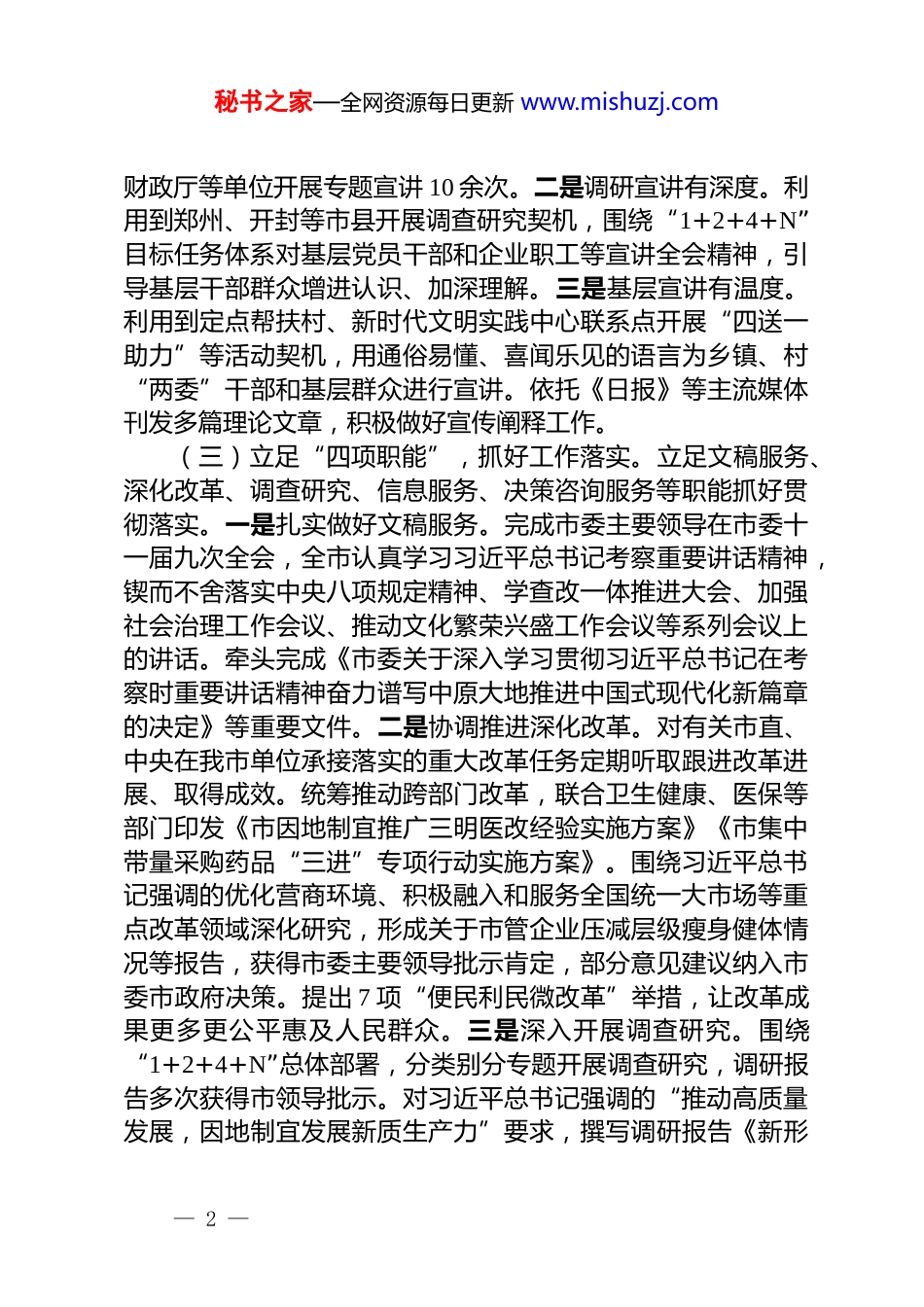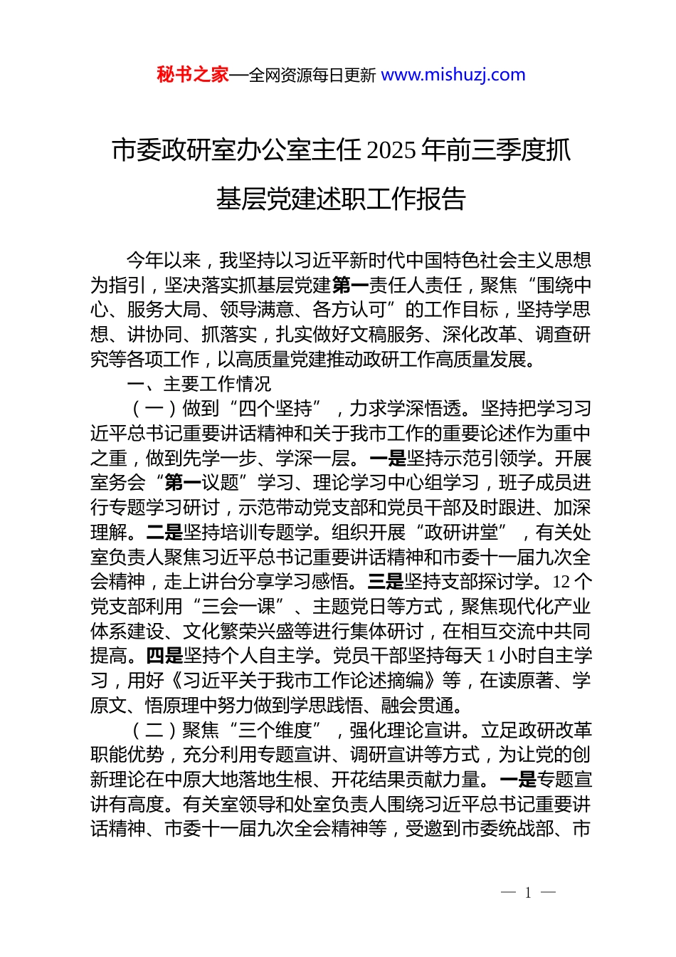 秘书之家—全网资源每日更新 www.mishuzj.com市委政研室办公室主任 2025 年前三季度抓基层党建述职工作报告今年以来,我坚持以习近平新时代中国特色社会主义思想为指引,坚决落实抓基层党建第一责任人责任,聚焦“围绕中心、服务大局、领导满意、各方认可”的工作目标,坚持学思想、讲协同、抓落实,扎实做好文稿服务、深化改革、调查研究等各项工作,以高质量党建推动政研工作高质量发展。一、主要工作情况(一)做到“四个坚持”,力求学深悟透。坚持把学习习近平总书记重要讲话精神和关于我市工作的重要论述作为重中之重,做到先学一步、学深一层。一是坚持示范引领学。开展室务会“第一议题”学习、理论学习中心组学习,班子成员进行专题学习研讨,示范带动党支部和党员干部及时跟进、加深理解。二是坚持培训专题学。组织开展“政研讲堂”,有关处室负责人聚焦习近平总书记重要讲话精神和市委十一届九次全会精神,走上讲台分享学习感悟。三是坚持支部探讨学。12 个党支部利用“三会一课”、主题党日等方式,聚焦现代化产业体系建设、文化繁荣兴盛等进行集体研讨,在相互交流中共同提高。四是坚持个人自主学。党员干部坚持每天 1 小时自主学习,用好《习近平关于我市工作论述摘编》等,在读原著、学原文、悟原理中努力做到学思践悟、融会贯通。(二)聚焦“三个维度”,强化理论宣讲。立足政研改革职能优势,充分利用专题宣讲、调研宣讲等方式,为让党的创新理论在中原大地落地生根、开花结果贡献力量。一是专题宣讲有高度。有关室领导和处室负责人围绕习近平总书记重要讲话精神、市委十一届九次全会精神等,受邀到市委统战部、市— 1 —秘书之家—全网资源每日更新 www.mishuzj.com财政厅等单位开展专题宣讲 10 余次。二是调研宣讲有深度。利用到郑州、开封等市县开展调查研究契机,围绕“1+2+4+N”目标任务体系对基层党员干部和企业职工等宣讲全会精神,引导基层干部群众增进认识、加深理解。三是基层宣讲有温度。利用到定点帮扶村、新时代文明实践中心联系点开展“四送一助力”等活动契机,用通俗易懂、喜闻乐见的语言为乡镇、村“两委”干部和基层群众进行宣讲。依托《日报》等主流媒体刊发多篇理论文章,积极做好宣传阐释工作。(三)立足“四项职能”,抓好工作落实。立足文稿服务、深化改革、调查研究、信息服务、决策咨询服务等职能抓好贯彻落实。一是扎实做好文稿服务。完成市委主要领导在市委十一届九次全会,全市认真学习习近平总书记考察重要讲话精神,锲而不舍落实中央八项规定精神、学查改一体推进大会、加强社会治理工作会议、推动文化繁荣兴盛工作会议等系列会议上的讲话。牵头完成《市委关于深入学习贯彻习近平总书记在考察时重要讲话精神奋力谱写中原大地推进中国式现代化新篇章的决定》等重要文件。二是协调推进深化改革。对有关市直、中央在我市单位承接落实的重大改革任务定期听取跟进改革进展、取得成效。统筹推动跨部门改革,联合卫生健康、医保等部门印发《市因地制宜推广三明医改经验实施方案》《市集中带量采购药品“三进”专项行动实施方案》。围绕习近平总书记强调的优化营商环境、积极融入和服务全国统一大市场等重点改革领域深化研究,形成关于市管企业压减层级瘦身健体情况等报告,获得市委主要领导批示肯定,部分意见建议纳入市委市政府决策。提出 7 项“便民利民微改革”举措,让改革成果更多更公平惠及人民群众。三是深入开展调查研究。围绕“1+2+4+N”总体部署,分类别分专题开展调查研究,调研报告多次获得市领导批示。对习近平总书记强调的“推动高质量发展,因地制宜发展新质生产力”要求,撰写调研报告《新形— 2 —秘书之家—全网资源每日更新 www.mishuzj.com势下加快我市人工智能人才队伍建设的几点建议》。对习近平总书记强调的“扎扎实实加强社会治理”,撰写完成《新社会组织党建工作的“难”与“解”》《关于做好新一轮全市村“两委”换届的思考与建议》等调研报告。四是全力做好信息服务。坚持所选刊物围绕“两高四着力”重大要求,聚焦影响经济社会持续健康发展的突出矛盾,人民群众切身利益和社会公平正义等...