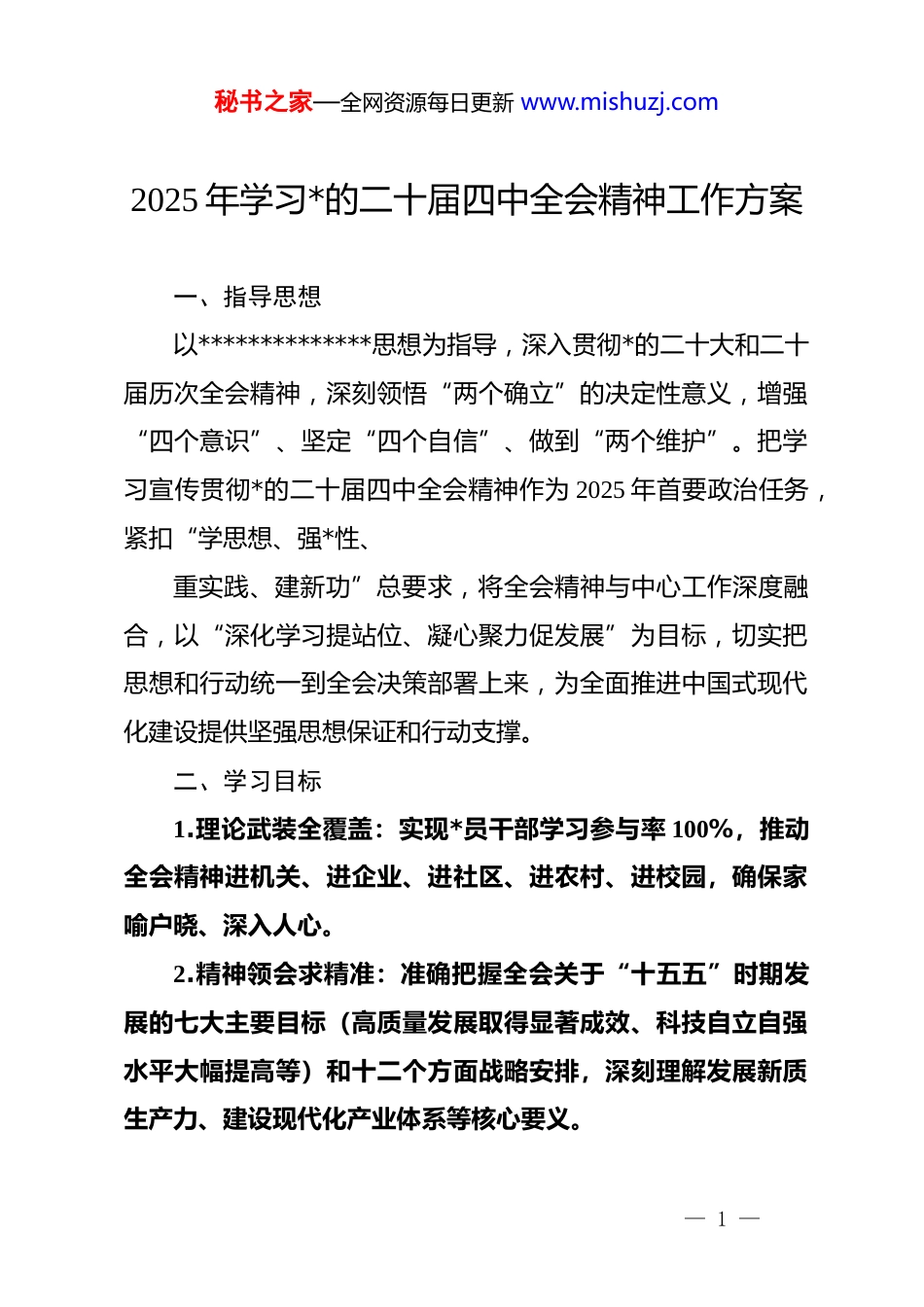 秘书之家—全网资源每日更新 www.mishuzj.com2025 年学习*的二十届四中全会精神工作方案一、指导思想以**************思想为指导,深入贯彻*的二十大和二十届历次全会精神,深刻领悟“两个确立”的决定性意义,增强“四个意识”、坚定“四个自信”、做到“两个维护”。把学习宣传贯彻*的二十届四中全会精神作为 2025 年首要政治任务,紧扣“学思想、强*性、重实践、建新功”总要求,将全会精神与中心工作深度融合,以“深化学习提站位、凝心聚力促发展”为目标,切实把思想和行动统一到全会决策部署上来,为全面推进中国式现代化建设提供坚强思想保证和行动支撑。二、学习目标1.理论武装全覆盖:实现*员干部学习参与率 100%,推动全会精神进机关、进企业、进社区、进农村、进校园,确保家喻户晓、深入人心。2.精神领会求精准:准确把握全会关于“十五五”时期发展的七大主要目标(高质量发展取得显著成效、科技自立自强水平大幅提高等)和十二个方面战略安排,深刻理解发展新质生产力、建设现代化产业体系等核心要义。— 1 —秘书之家—全网资源每日更新 www.mishuzj.com3.成果转化见实效:将学习成果转化为破解发展难题的具体举措,推动重点工作落地见效,确保 2025 年年度目标任务完成率不低于 95%,重大项目推进达标率 100%。三、学习重点1.聚焦全会核心部署:深入学习全会审议通过的《中共中央关于制定国民经济和社会发展第十五个五年规划和二〇三五年远景目标的建议》,重点把握“建设现代化产业体系”“加快高水平科技自立自强”“推进共同富裕”“全面绿色转型”等与发展紧密相关的部署要求。2.紧扣发展新质生产力:深刻理解发展新质生产力的内涵特征,结合实际明确传统产业升级(智能化、绿色化、融合化)、新兴产业培育(人工智能、生物制造等)、未来产业布局(商业航天、氢能等)的具体路径。3.强化安全与民生导向:学习全会关于推进国家安全体系和能力现代化的部署,筑牢产业链供应链、数据安全等屏障;聚焦民生领域,落实教育、医疗、养老等普惠性政策,提升群众获得感幸福感。四、时间安排(一)动员部署阶段(2025 年 11 月—12 月)召开全市(或单位)学习动员大会,传达全会精神;成立— 2 —秘书之家—全网资源每日更新 www.mishuzj.com由主要领导任组长的学习领导小组,下设办公室负责日常协调;印发工作方案,明确责任分工、时间节点和具体要求。(二)集中学习阶段(2026 年 1 月—2 月)领导班子示范学:*委(*组)理论学习中心组每月开展 1次专题研讨,邀请专家学者辅导解读,中心组成员结合分管工作撰写发言材料。分层分类深入学:机关干部通过“每周学习日”“专题培训班”开展系统学习;企业职工聚焦科技创新、产业升级开展“车间课堂”“技能比武”;基层群众依托新时代文明实践中心(所、站)开展“百姓宣讲”“文艺汇演”等活动。线上线下融合学:依托“学习强国”平台、地方政务 app开设学习专栏,推送全会公报、解读文章、微视频等资料;组织“全会精神知识竞赛”,*员参与率不低于 95%。(三)实践转化阶段(2026 年 3 月—4 月)开展“学全会、解难题、促发展”专项行动,领导班子成员牵头破解 1—2 项制约发展的瓶颈问题;各部门对照全会部署梳理重点任务清单,明确“任务书、路线图、责任人”。推进“民生实事项目”落地,围绕就业、教育、医疗等领域,每季度开展 1 次民生实事进展督查,确保问题解决率达 90%以上。(四)总结提升阶段(2026 年 5 月—6 月)— 3 —秘书之家—全网资源每日更新 www.mishuzj.com组织学习成效评估,通过问卷调查、实地检查、成果展示等方式,总结经验做法;召开总结会议,表彰学习先进集体和个人;将有效做法固化为长效学习机制。五、保障措施1.组织保障:各级*委(*组)履行主体责任,主要领导为第一责任人,分管领导具体抓;建立“一级抓一级、层层抓落实”的责任体系,定期召开推进会,通报学习进展。2.资源保障:统筹安排学习经费,保障专家辅导、资料印制、活动开展等需求;组建由*校教师、理论骨干组成的宣讲团,开展巡回宣讲。3.督导考核:将学习贯彻情况纳入年度绩效考核和 dj 工作责任制考核,成立督导组定期督查,对学习不力、落实不到位的单位和个人严肃追责问责。— 4 —