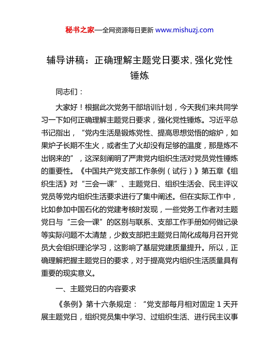 秘书之家—全网资源每日更新 www.mishuzj.com辅导讲稿:正确理解主题党日要求,强化党性锤炼同志们:大家好!根据此次党务干部培训计划,今天我们来共同学习一下如何正确理解主题党日要求,强化党性锤炼。习近平总书记指出,“党内生活是锻炼党性、提高思想觉悟的熔炉,如果炉子长期不生火,或者生了火却没有足够的温度,那是炼不出钢来的”,这深刻阐明了严肃党内组织生活对党员党性锤炼的重要性。《中国共产党支部工作条例(试行)》第五章《组织生活》对“三会一课”、主题党日、组织生活会、民主评议党员等党内组织生活要求进行了集中阐述。但在实际工作中,比如参加中国石化的党建考核时发现,一些党务工作者对主题党日与“三会一课”的区别与联系、支部工作手册如何做记录等实际问题不太清楚,少数支部把主题党日简化成每月召开党员大会组织理论学习,这影响了基层党建质量提升。所以,正确理解把握主题党日的要求,对于提高党内组织生活质量具有重要的现实意义。一、主题党日的内容要求《条例》第十六条规定:“党支部每月相对固定 1 天开展主题党日,组织党员集中学习、过组织生活、进行民主议事秘书之家—全网资源每日更新 www.mishuzj.com和志愿服务等。”大家要注意,这里面提到的“三会一课”、组织生活会、民主评议党员等党的组织生活,都可以作为主题党日的内容。而且第 16 条中还有一个“等”字,这就意味着主题党日的内容还可以进一步拓展。比如在学习贯彻习近平新时代中国特色社会主义思想主题教育期间,党支部开展党建共建、建言献策、党员志愿服务等活动,都可以作为主题党日的内容。通俗来讲,主题党日就像是一个“标签”,只要是符合要求的支部党员活动、党内组织生活都可以“贴”上去。二、主题党日的性质要求《条例》第五章《组织生活》开宗明义(第 15 条)指出:“党支部应当严格执行党的组织生活制度,经常、认真、严肃地开展批评和自我批评,增强党内政治生活的政治性、时代性、原则性、战斗性。”主题党日作为党的组织生活,自然也必须具有政治性、时代性、原则性、战斗性这“四性”。这“四性”也是判断支部开展的工作、组织的活动能否作为主题党日的标准。我们强调“四性”,并不是说要刻板单调,基层党建是可以创新的,但不能跑偏走样。如果党支部把跳绳比赛、户外拓展作为组织生活,甚至把亲子沙龙、相亲会、彩妆体验纳入主题党日,这就忽略了“四性”的要求,混淆了党支部与群团组织的区别,这样的活动是不应当作为支部组织生活、主题党日的。秘书之家—全网资源每日更新 www.mishuzj.com三、主题党日的实践要点(一)坚持理论武装与党性修养相结合。我们要组织党员坚持用习近平新时代中国特色社会主义思想武装头脑,学懂弄通理论、掌握思想真谛、解决思想困惑,牢固树立正确的世界观、人生观、价值观和权力观、政绩观、事业观,深刻领悟“两个确立”的决定性意义,不断增强“四个意识”、坚定“四个自信”、做到“两个维护”,使自己的思维方式和精神世界更好适应事业发展需要。同时,要引导教育党员坚持说实话、谋实事、出实招、见实效,把雷厉风行和久久为功有机结合起来,勇于攻坚克难,以钉钉子精神做实做细做好各项工作,不好高骛远、不脱离实际,力戒形式主义、官僚主义。(二)坚持教育与自我教育相结合。在学习交流、民主评议党员时,必然会带来思想碰撞。但现实中,有的党员怕得罪人、患得患失,有的重感情轻原则,以个人好恶为评价标准;有的主要谈成绩、重点谈业务、回避矛盾问题、东拉西扯等,导致党内组织生活缺乏应有的辣味,没有达到“团结—批评—团结”的目的。毛泽东同志指出,以斗争求团结则团结存,以退让求团结则团结亡。勇于自我革新是我们党的显著特点和优势,参加组织生活的党员必须拿起批评和自我批评的武器,开展积极健康的思想斗争,除尘去垢,解决问题,通过“团结—批评—团结”达到“惩前毖后、治病救人”的目的。秘书之家—全网资源每日更新 www.mishuzj.com(三)紧跟时代发展步伐。习近平总书记指出,党内政治生活要紧跟时代步伐、聆听时代声音、回答时代课题,及时发现和解决党内出现的新问题,使党...