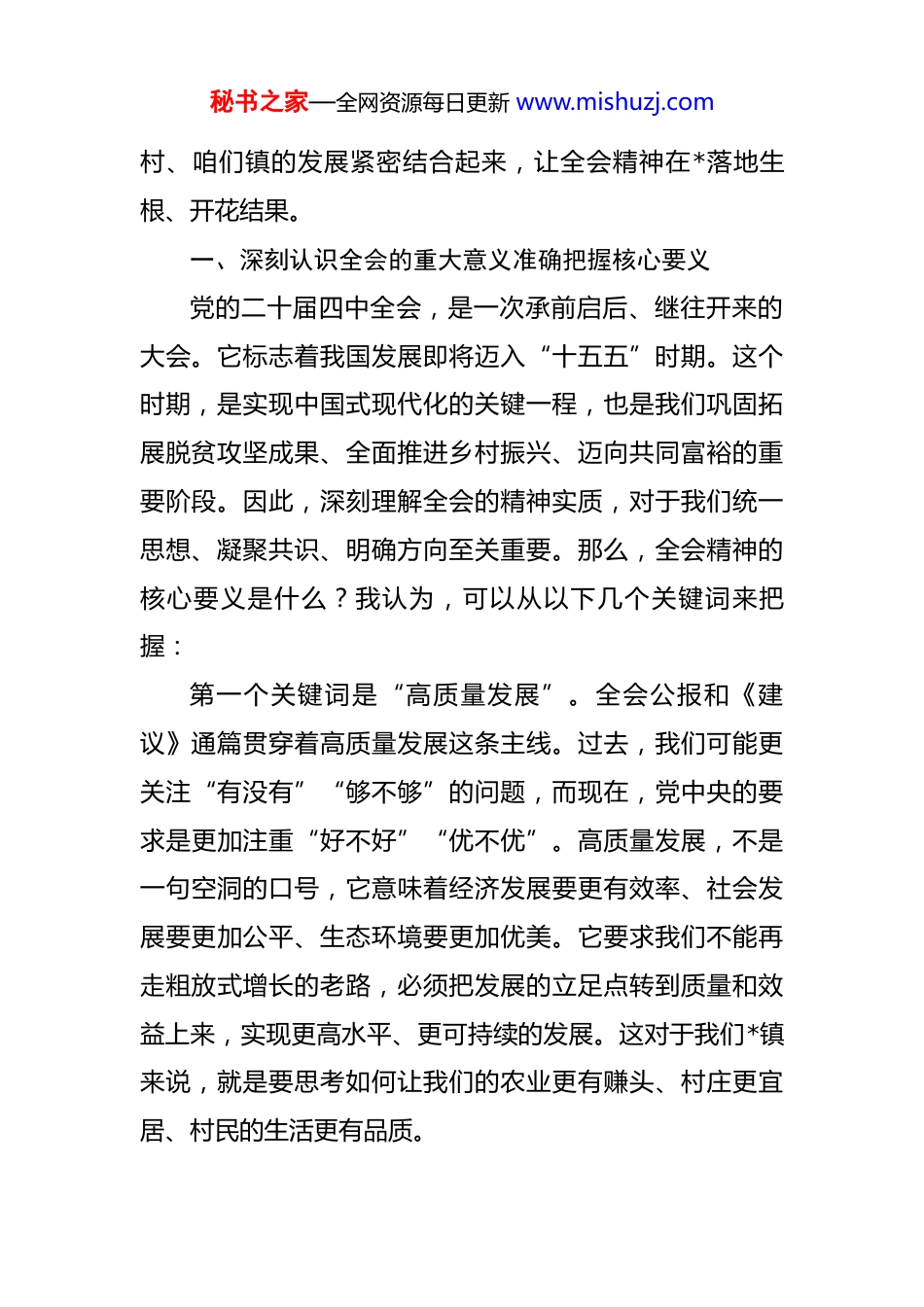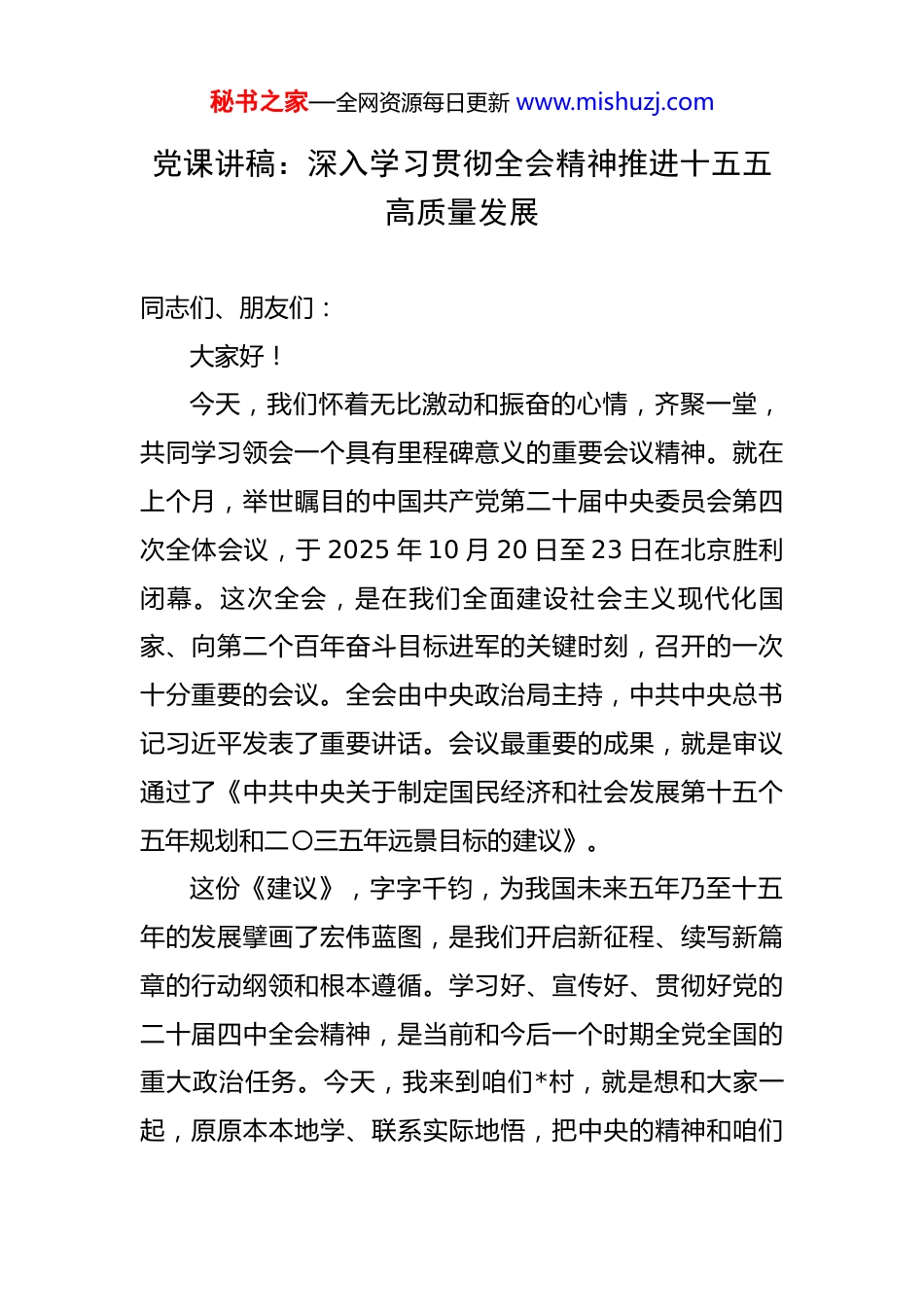 秘书之家—全网资源每日更新 www.mishuzj.com党课讲稿:深入学习贯彻全会精神推进十五五高质量发展 同志们、朋友们:大家好!今天,我们怀着无比激动和振奋的心情,齐聚一堂,共同学习领会一个具有里程碑意义的重要会议精神。就在上个月,举世瞩目的中国共产党第二十届中央委员会第四次全体会议,于 2025 年 10 月 20 日至 23 日在北京胜利闭幕。这次全会,是在我们全面建设社会主义现代化国家、向第二个百年奋斗目标进军的关键时刻,召开的一次十分重要的会议。全会由中央政治局主持,中共中央总书记习近平发表了重要讲话。会议最重要的成果,就是审议通过了《中共中央关于制定国民经济和社会发展第十五个五年规划和二〇三五年远景目标的建议》。这份《建议》,字字千钧,为我国未来五年乃至十五年的发展擘画了宏伟蓝图,是我们开启新征程、续写新篇章的行动纲领和根本遵循。学习好、宣传好、贯彻好党的二十届四中全会精神,是当前和今后一个时期全党全国的重大政治任务。今天,我来到咱们*村,就是想和大家一起,原原本本地学、联系实际地悟,把中央的精神和咱们秘书之家—全网资源每日更新 www.mishuzj.com村、咱们镇的发展紧密结合起来,让全会精神在*落地生根、开花结果。一、深刻认识全会的重大意义准确把握核心要义党的二十届四中全会,是一次承前启后、继往开来的大会。它标志着我国发展即将迈入“十五五”时期。这个时期,是实现中国式现代化的关键一程,也是我们巩固拓展脱贫攻坚成果、全面推进乡村振兴、迈向共同富裕的重要阶段。因此,深刻理解全会的精神实质,对于我们统一思想、凝聚共识、明确方向至关重要。那么,全会精神的核心要义是什么?我认为,可以从以下几个关键词来把握:第一个关键词是“高质量发展”。全会公报和《建议》通篇贯穿着高质量发展这条主线。过去,我们可能更关注“有没有”“够不够”的问题,而现在,党中央的要求是更加注重“好不好”“优不优”。高质量发展,不是一句空洞的口号,它意味着经济发展要更有效率、社会发展要更加公平、生态环境要更加优美。它要求我们不能再走粗放式增长的老路,必须把发展的立足点转到质量和效益上来,实现更高水平、更可持续的发展。这对于我们*镇来说,就是要思考如何让我们的农业更有赚头、村庄更宜居、村民的生活更有品质。秘书之家—全网资源每日更新 www.mishuzj.com第二个关键词是“新质生产力”。这是近两年党中央提出的一个极具前瞻性和战略性的新概念。什么是新质生产力?通俗地讲,它是由技术革命性突破、生产要素创新性配置、产业深度转型升级而催生的当代先进生产力。它的核心是“创新”,特点是“高科技、高效能、高质量”。它不像传统生产力那样主要依靠大量的资源投入,而是更多依靠科技进步、劳动者素质提高和管理创新。对于我们农村地区而言,发展新质生产力,就是要用现代科技武装农业,比如推广精准灌溉、智能温控大棚、无人机植保;就是要用数字技术赋能乡村,比如发展农村电商、直播带货,把我们的特色农产品卖到全国各地;就是要培育新型农业经营主体,让有文化、懂技术、善经营的新型农民成为乡村振兴的主力军。第三个关键词是“共同富裕”。全会再次强调,要扎实推进共同富裕,坚持以人民为中心的发展思想。中国式现代化,是全体人民共同富裕的现代化。共同富裕不是“劫富济贫”,更不是搞平均主义“大锅饭”,而是通过高质量发展把“蛋糕”做大做好,然后通过合理的制度安排把“蛋糕”切好分好。这意味着我们要持续缩小城乡差距、区域差距和收入差距。具体到我们身边,就是要不断完善农村的基础设施,让村里的路更宽、灯更亮、网络更秘书之家—全网资源每日更新 www.mishuzj.com快;就是要提升公共服务水平,让孩子们在家门口能上好学,让老人们生病了能方便看医;就是要千方百计拓宽农民增收致富的渠道,让大家的腰包越来越鼓,日子越过越红火。第四个关键词是“安全与发展”。全会强调,要更好统筹发展和安全。安全是发展的前提,发展是安全的保障。这里的安全,是广义的安全,不仅包括国防安全、粮食安全,也包括生态安全、社会安全、生产安全。对我们基层来说,...