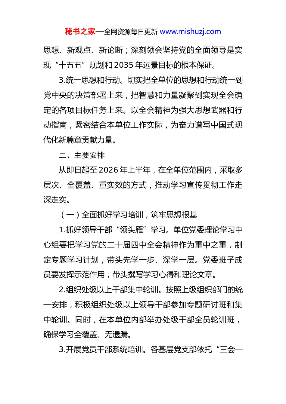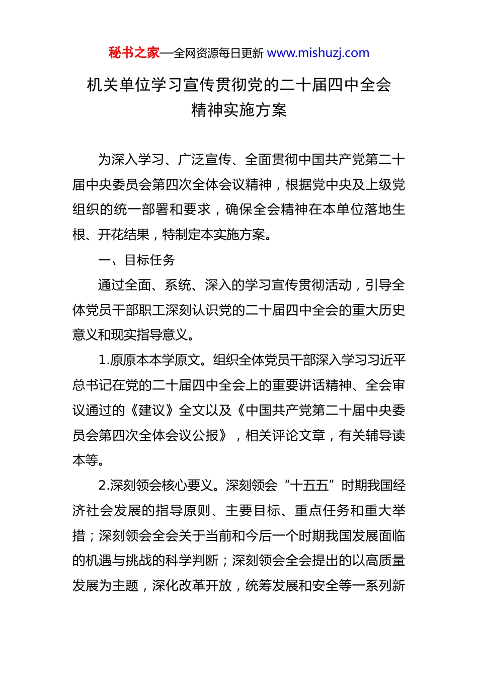 秘书之家—全网资源每日更新 www.mishuzj.com机关单位学习宣传贯彻党的二十届四中全会精神实施方案 为深入学习、广泛宣传、全面贯彻中国共产党第二十届中央委员会第四次全体会议精神,根据党中央及上级党组织的统一部署和要求,确保全会精神在本单位落地生根、开花结果,特制定本实施方案。一、目标任务通过全面、系统、深入的学习宣传贯彻活动,引导全体党员干部职工深刻认识党的二十届四中全会的重大历史意义和现实指导意义。1.原原本本学原文。组织全体党员干部深入学习习近平总书记在党的二十届四中全会上的重要讲话精神、全会审议通过的《建议》全文以及《中国共产党第二十届中央委员会第四次全体会议公报》,相关评论文章,有关辅导读本等。2.深刻领会核心要义。深刻领会“十五五”时期我国经济社会发展的指导原则、主要目标、重点任务和重大举措;深刻领会全会关于当前和今后一个时期我国发展面临的机遇与挑战的科学判断;深刻领会全会提出的以高质量发展为主题,深化改革开放,统筹发展和安全等一系列新秘书之家—全网资源每日更新 www.mishuzj.com思想、新观点、新论断;深刻领会坚持党的全面领导是实现“十五五”规划和 2035 年远景目标的根本保证。3.统一思想和行动。切实把全单位的思想和行动统一到党中央的决策部署上来,把智慧和力量凝聚到实现全会确定的各项目标任务上来。以全会精神为强大思想武器和行动指南,紧密结合本单位工作实际,为奋力谱写中国式现代化新篇章贡献力量。二、主要安排从即日起至 2026 年上半年,在全单位范围内,采取多层次、全覆盖、重实效的方式,推动学习宣传贯彻工作走深走实。(一)全面抓好学习培训,筑牢思想根基1.抓好领导干部“领头雁”学习。单位党委理论学习中心组要把学习党的二十届四中全会精神作为重中之重,制定专题学习计划,带头先学一步、深学一层。党委班子成员要发挥示范作用,带头撰写学习心得和理论文章。2.组织处级以上干部集中轮训。按照上级组织部门的统一安排,积极组织处级以上领导干部参加专题研讨班和集中轮训。同时,在本单位内部举办处级干部全员轮训班,确保学习全覆盖、无遗漏。3.开展党员干部系统培训。各基层党支部依托“三会一秘书之家—全网资源每日更新 www.mishuzj.com课”、主题党日等形式,组织全体党员开展常态化学习。单位将统一为全体党员干部订购《党的二十届四中全会〈建议〉学习辅导读本》等权威学习资料(假设有,请根据具体情况调整),确保学习的准确性和权威性。(二)广泛组织集中宣讲,凝聚奋进共识1.领导干部带头深入宣讲。单位党委书记将面向全单位党员干部作一次系统、全面的专题辅导报告。其他党委班子成员要结合分管领域和工作实际,深入基层联系点或所在党支部开展对象化、分众化、互动化的宣讲活动,把全会精神讲清楚、讲明白,让干部群众听得懂、能领会。2.组建基层宣讲小分队。动员各单位、各部门的先进工作者、青年理论骨干、业务专家等组成宣讲小分队,通过“微党课”“微宣讲”等形式,深入项目一线、服务窗口和工作班组,用生动的语言和鲜活的案例解读“十五五”规划,打通理论武装“最后一公里”。(三)深入开展研究阐释,推动转化运用1.聚焦重点开展专题研讨。结合本单位“十四五”规划执行情况和“十五五”发展谋划,设置若干关键议题,如“如何在本单位推动高质量发展”、“科技创新如何引领单位未来发展”、“如何服务和融入国家能源资源安全、生态文明建设等重大战略”等,通过专题研讨会、务虚会秘书之家—全网资源每日更新 www.mishuzj.com等形式,深化对全会精神的理解,形成具有前瞻性和操作性的工作思路。2.深入开展调查研究。单位领导班子成员要结合全会提出的新任务新要求,带头领题调研。围绕制约本单位高质量发展的瓶颈问题、职工群众急难愁盼的现实问题,深入基层、深入一线,形成一批高质量的调研报告。适时召开调研成果交流会,将调研成果转化为破解难题、推动工作的具体举措。3.形成一批理论研究成果。鼓励和支持单位内的专家学者、业务骨干围绕全会精神,特别是《建议》提出的新战略新部署,结合本行业本领域特点,撰写理论文章和研究报告...