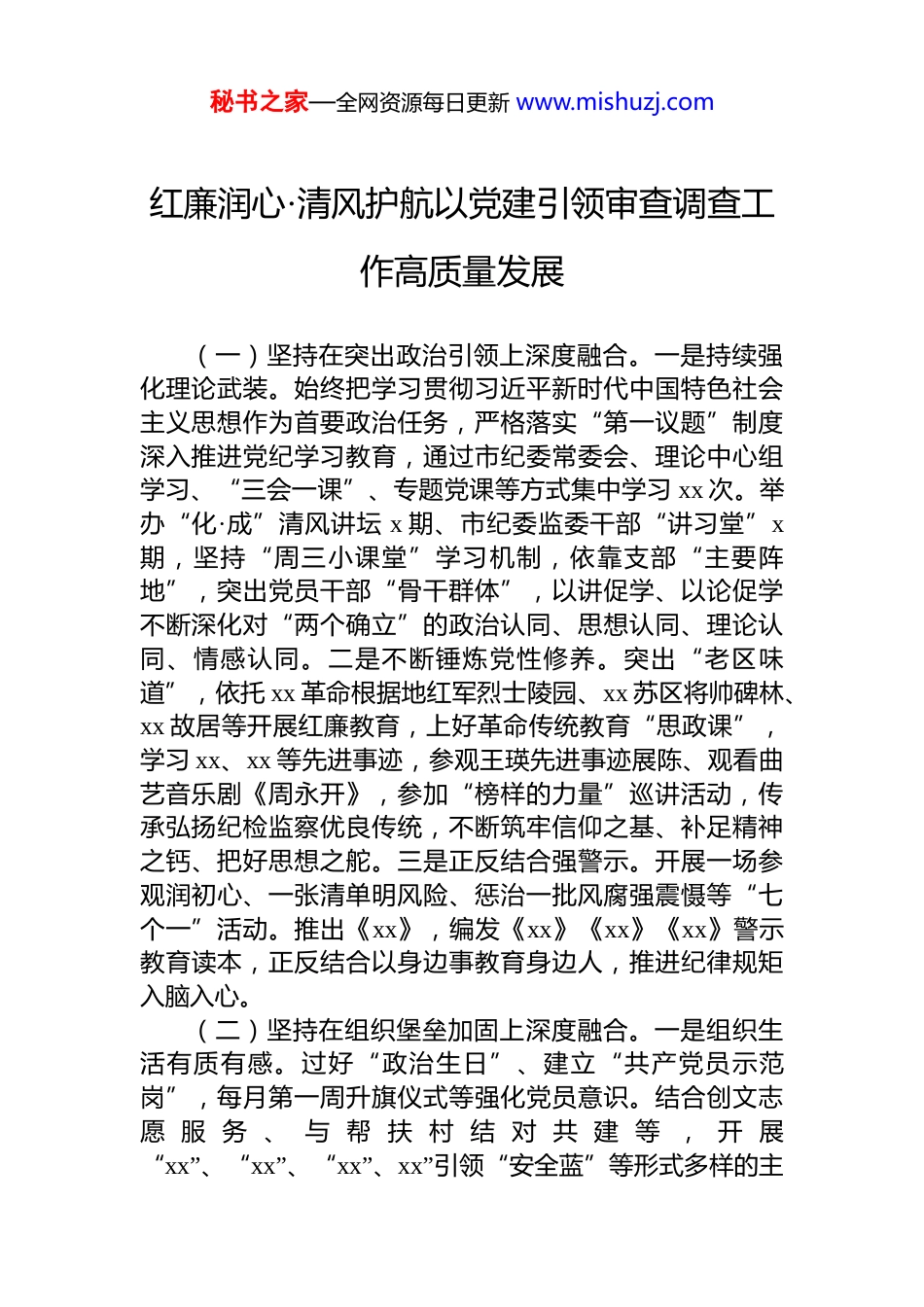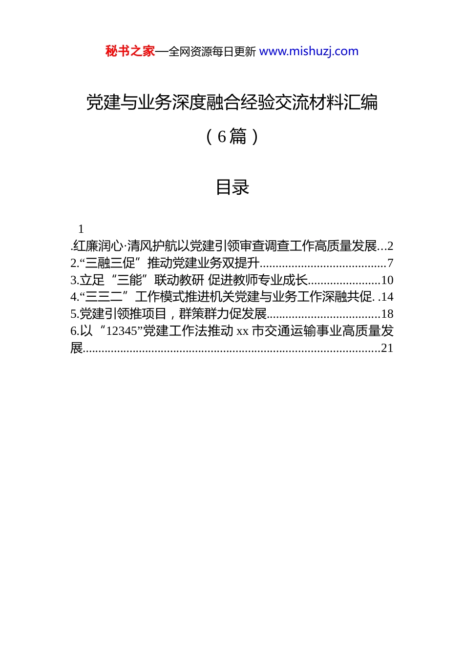 秘书之家—全网资源每日更新 www.mishuzj.com党建与业务深度融合经验交流材料汇编(6 篇)目录1.红廉润心·清风护航以党建引领审查调查工作高质量发展...22.“三融三促”推动党建业务双提升........................................73.立足“三能”联动教研 促进教师专业成长.......................104.“三三二”工作模式推进机关党建与业务工作深融共促. .145.党建引领推项目,群策群力促发展....................................186.以“12345”党建工作法推动 xx 市交通运输事业高质量发展...............................................................................................21秘书之家—全网资源每日更新 www.mishuzj.com红廉润心·清风护航以党建引领审查调查工作高质量发展(一)坚持在突出政治引领上深度融合。一是持续强化理论武装。始终把学习贯彻习近平新时代中国特色社会主义思想作为首要政治任务,严格落实“第一议题”制度深入推进党纪学习教育,通过市纪委常委会、理论中心组学习、“三会一课”、专题党课等方式集中学习 xx 次。举办“化·成”清风讲坛 x 期、市纪委监委干部“讲习堂”x期,坚持“周三小课堂”学习机制,依靠支部“主要阵地”,突出党员干部“骨干群体”,以讲促学、以论促学不断深化对“两个确立”的政治认同、思想认同、理论认同、情感认同。二是不断锤炼党性修养。突出“老区味道”,依托 xx 革命根据地红军烈士陵园、xx 苏区将帅碑林、xx 故居等开展红廉教育,上好革命传统教育“思政课”,学习 xx、xx 等先进事迹,参观王瑛先进事迹展陈、观看曲艺音乐剧《周永开》,参加“榜样的力量”巡讲活动,传承弘扬纪检监察优良传统,不断筑牢信仰之基、补足精神之钙、把好思想之舵。三是正反结合强警示。开展一场参观润初心、一张清单明风险、惩治一批风腐强震慑等“七个一”活动。推出《xx》,编发《xx》《xx》《xx》警示教育读本,正反结合以身边事教育身边人,推进纪律规矩入脑入心。(二)坚持在组织堡垒加固上深度融合。一是组织生活有质有感。过好“政治生日”、建立“共产党员示范岗”,每月第一周升旗仪式等强化党员意识。结合创文志愿 服 务 、 与 帮 扶 村 结 对 共 建 等 , 开 展“xx”、“xx”、“xx”、xx”引领“安全蓝”等形式多样的主秘书之家—全网资源每日更新 www.mishuzj.com题党日活动,开展“一月一安全主题,一月一学习主题”的每月双主题活动,开展青年干部座谈会、读书分享会等活动,党支部的凝聚力和向心力不断增强。二是党建品牌有声有色。实施“四青”工程,组织开展“青廉说”演讲比赛、“青历”重走红军路、“青醒”警示教育、“xx”入户家访,加强青年党员干部教育管理。创建“xx”党建品牌,开展党员干部“家访”活动,全面摸底党员干部工作、生活及家庭情况,在谈心谈话中融入监督,在解决困难中体现关爱,着力推进关怀激励实化细化,教育引导党员干部以好家风涵养好作风,发挥好亲情监督预防作用。三是组织覆盖有形有效。压紧“一岗双责”,坚持“纪检干部+转隶干部”、“能手+熟手+新手”、“审查调查+综合部门”原则,支部成员互帮互助、取长补短,推动支部党建工作和纪法业务快速衔接、综合业务能力整体提升。同时,充分发扬“支部建在连上”的光荣传统,把党的基层组织建在办案点,临时党组织与审查调查组同时设立,坚持“党建+审调”,助力审调工作高质量发展,让“利剑”更显锋芒。(三)坚持在推动提质增效上深度融合。一是坚持力度与节奏统筹。做深做实问题线索适当了解、综合分析,加强问题线索集体研判,突出市、县、乡分层分类瞄准重心,集中精力查该查的问题、办该办的案件。二是坚持数量与质量并重。推动案源提质,深化类案监督、风腐同查专业监督等机制,加强“纪巡审”联动监督、贯通协作,着力主动发现有价值、能成案的问题线索。全市自办案件主动发现问题线索成案率同比提升 xx%。实施“优质案件孵化培育工程”,推动案件复盘制度化常态化,开展案件质量评查 xxx 次、“三书比对”xx 件,办案过程动态评估xxx 次,案件质量稳步提升。三...