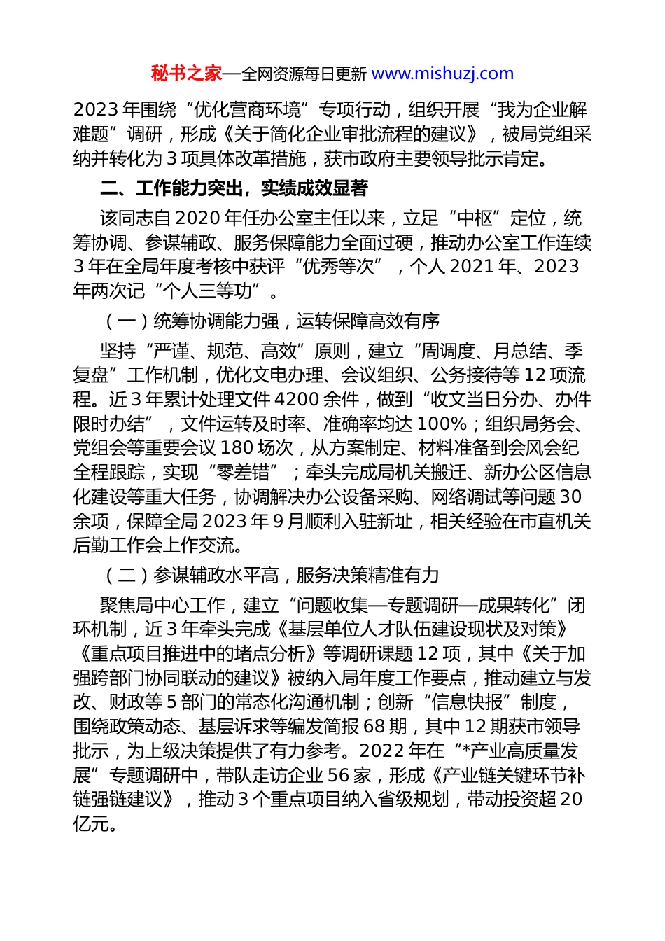 秘书之家—全网资源每日更新 www.mishuzj.com拟提拔任用人员个人现实表现材料*,男,汉族,1985 年 3 月生,*人,2008 年 7 月参加工作,2010 年 6 月加入中国共产党,大学本科学历,现任*局办公室主任。根据组织安排,结合日常考察、年度考核及民主测评情况,现将其现实表现情况综合汇报如下:一、思想政治坚定,政治素养过硬该同志始终把政治建设摆在首位,深入学习贯彻习近平新时代中国特色社会主义思想,深刻领悟“两个确立”的决定性意义,增强“四个意识”、坚定“四个自信”、做到“两个维护”,在思想上政治上行动上同以习近平同志为核心的党中央保持高度一致。一是理论学习扎实深入。坚持“第一议题”制度,通过集中学、个人学、专题研讨等方式,系统学习党的二十大精神、习近平总书记关于本领域工作的重要论述及最新政策文件。近 3 年累计参与党委理论学习中心组学习 24 次,撰写学习笔记 12 万余字、心得体会 18 篇,在局内“青年理论学习小组”中作专题发言 6 次,理论功底扎实,政治判断力、政治领悟力、政治执行力不断提升。二是政治立场鲜明坚定。严守党的政治纪律和政治规矩,严格落实重大事项请示报告制度,对上级决策部署坚决贯彻执行,无阳奉阴违、自行其是等问题。在疫情防控、防汛救灾等重大考验中,始终站在一线、靠前指挥,以实际行动践行对党忠诚。2022 年*市突发疫情期间,作为局疫情防控专班副组长,连续驻点值守 15天,统筹协调物资调配、人员排查等工作,确保全局 300 余名干部职工“零感染”,相关做法被市委组织部作为“党员先锋案例”推广。三是大局意识突出强化。自觉将个人工作融入全局发展,主动对标“十四五”规划及局年度重点任务,牵头制定《办公室服务保障全局中心工作清单》,明确“文会办理、督查督办、综合协调”三大核心职责,推动办公室从“事务型”向“参谋型”转变。秘书之家—全网资源每日更新 www.mishuzj.com2023 年围绕“优化营商环境”专项行动,组织开展“我为企业解难题”调研,形成《关于简化企业审批流程的建议》,被局党组采纳并转化为 3 项具体改革措施,获市政府主要领导批示肯定。二、工作能力突出,实绩成效显著该同志自 2020 年任办公室主任以来,立足“中枢”定位,统筹协调、参谋辅政、服务保障能力全面过硬,推动办公室工作连续3 年在全局年度考核中获评“优秀等次”,个人 2021 年、2023年两次记“个人三等功”。(一)统筹协调能力强,运转保障高效有序坚持“严谨、规范、高效”原则,建立“周调度、月总结、季复盘”工作机制,优化文电办理、会议组织、公务接待等 12 项流程。近 3 年累计处理文件 4200 余件,做到“收文当日分办、办件限时办结”,文件运转及时率、准确率均达 100%;组织局务会、党组会等重要会议 180 场次,从方案制定、材料准备到会风会纪全程跟踪,实现“零差错”;牵头完成局机关搬迁、新办公区信息化建设等重大任务,协调解决办公设备采购、网络调试等问题 30余项,保障全局 2023 年 9 月顺利入驻新址,相关经验在市直机关后勤工作会上作交流。(二)参谋辅政水平高,服务决策精准有力聚焦局中心工作,建立“问题收集—专题调研—成果转化”闭环机制,近 3 年牵头完成《基层单位人才队伍建设现状及对策》《重点项目推进中的堵点分析》等调研课题 12 项,其中《关于加强跨部门协同联动的建议》被纳入局年度工作要点,推动建立与发改、财政等 5 部门的常态化沟通机制;创新“信息快报”制度,围绕政策动态、基层诉求等编发简报 68 期,其中 12 期获市领导批示,为上级决策提供了有力参考。2022 年在“*产业高质量发展”专题调研中,带队走访企业 56 家,形成《产业链关键环节补链强链建议》,推动 3 个重点项目纳入省级规划,带动投资超 20亿元。秘书之家—全网资源每日更新 www.mishuzj.com(三)督办落实力度大,重点任务落地见效严格落实“清单化管理、项目化推进”要求,建立《局重点工作督办台账》,将年度 12 类 58 项任务分解到责任科室、明确到具体时限,实行“周提醒、月通报、季考评”。2023 年围绕“民生...
