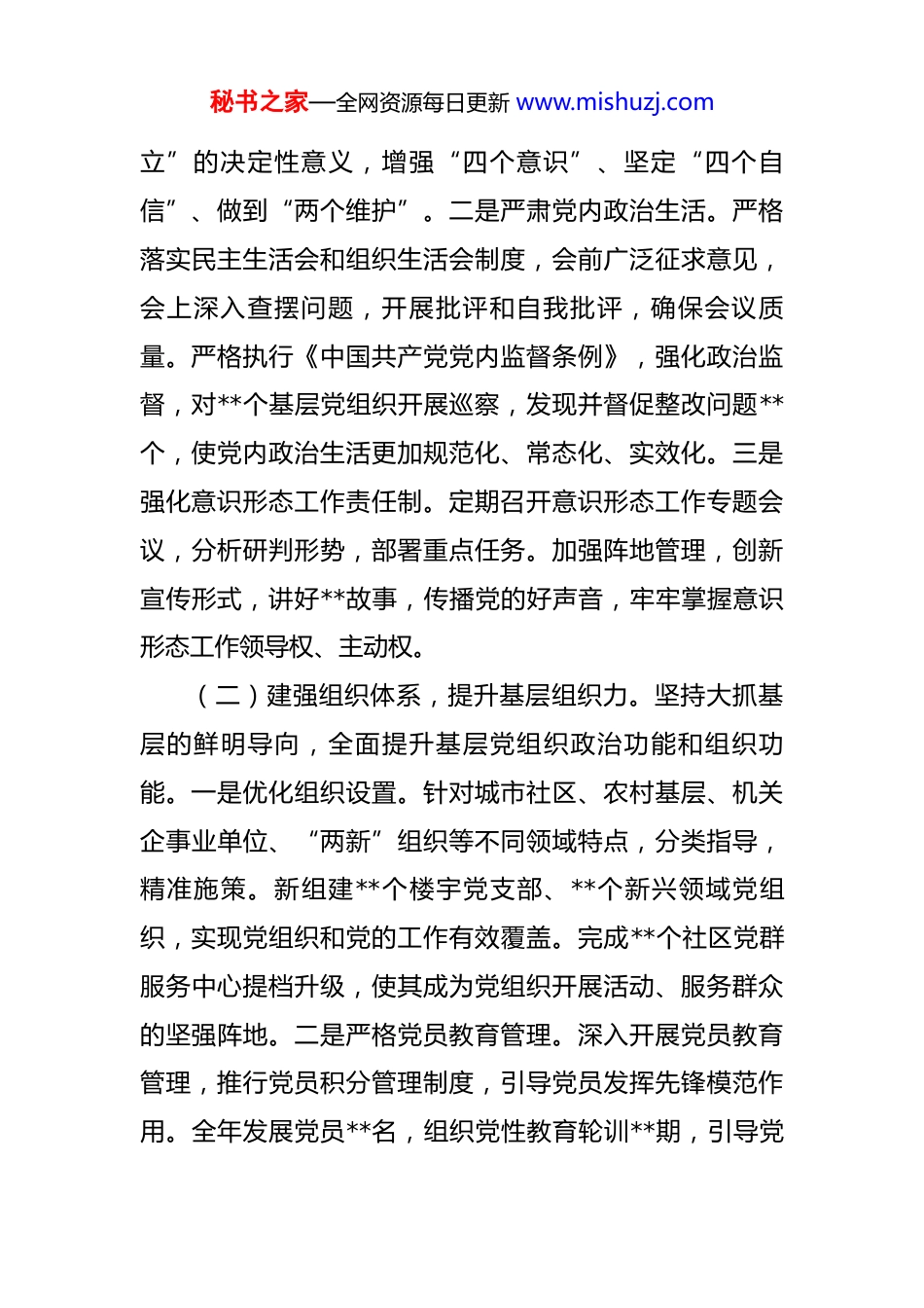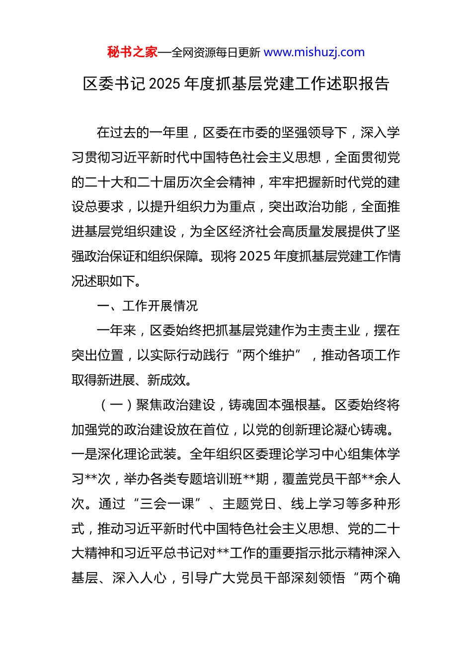 秘书之家—全网资源每日更新 www.mishuzj.com区委书记 2025 年度抓基层党建工作述职报告 在过去的一年里,区委在市委的坚强领导下,深入学习贯彻习近平新时代中国特色社会主义思想,全面贯彻党的二十大和二十届历次全会精神,牢牢把握新时代党的建设总要求,以提升组织力为重点,突出政治功能,全面推进基层党组织建设,为全区经济社会高质量发展提供了坚强政治保证和组织保障。现将 2025 年度抓基层党建工作情况述职如下。一、工作开展情况一年来,区委始终把抓基层党建作为主责主业,摆在突出位置,以实际行动践行“两个维护”,推动各项工作取得新进展、新成效。(一)聚焦政治建设,铸魂固本强根基。区委始终将加强党的政治建设放在首位,以党的创新理论凝心铸魂。一是深化理论武装。全年组织区委理论学习中心组集体学习**次,举办各类专题培训班**期,覆盖党员干部**余人次。通过“三会一课”、主题党日、线上学习等多种形式,推动习近平新时代中国特色社会主义思想、党的二十大精神和习近平总书记对**工作的重要指示批示精神深入基层、深入人心,引导广大党员干部深刻领悟“两个确秘书之家—全网资源每日更新 www.mishuzj.com立”的决定性意义,增强“四个意识”、坚定“四个自信”、做到“两个维护”。二是严肃党内政治生活。严格落实民主生活会和组织生活会制度,会前广泛征求意见,会上深入查摆问题,开展批评和自我批评,确保会议质量。严格执行《中国共产党党内监督条例》,强化政治监督,对**个基层党组织开展巡察,发现并督促整改问题**个,使党内政治生活更加规范化、常态化、实效化。三是强化意识形态工作责任制。定期召开意识形态工作专题会议,分析研判形势,部署重点任务。加强阵地管理,创新宣传形式,讲好**故事,传播党的好声音,牢牢掌握意识形态工作领导权、主动权。(二)建强组织体系,提升基层组织力。坚持大抓基层的鲜明导向,全面提升基层党组织政治功能和组织功能。一是优化组织设置。针对城市社区、农村基层、机关企事业单位、“两新”组织等不同领域特点,分类指导,精准施策。新组建**个楼宇党支部、**个新兴领域党组织,实现党组织和党的工作有效覆盖。完成**个社区党群服务中心提档升级,使其成为党组织开展活动、服务群众的坚强阵地。二是严格党员教育管理。深入开展党员教育管理,推行党员积分管理制度,引导党员发挥先锋模范作用。全年发展党员**名,组织党性教育轮训**期,引导党秘书之家—全网资源每日更新 www.mishuzj.com员在服务群众、推动发展中亮身份、作表率。三是创新基层治理模式。深入推广“党建引领+网格化管理”模式,将全区划分为**个网格,配备网格员**名,构建起“区委—街道(乡镇)—社区(村)—网格—楼栋(户)”五级联动体系,有效整合各类资源力量,实现小事不出网格、大事不出社区,提升了基层治理精细化水平。(三)淬炼过硬队伍,激发干事创业劲头。坚持德才兼备、以德为先,着力建设高素质专业化干部队伍。一是强化干部教育培训。聚焦提升基层党组织书记政治素养和业务能力,举办专题培训班**期,对**名村(社区)党组织书记进行全覆盖轮训。实施“墩苗育苗”计划,选派**名优秀年轻干部到基层一线挂职锻炼,提升其处理复杂问题的能力。二是激发干部担当作为。健全完善干部考核评价机制,突出实干实绩导向,将抓基层党建成效作为干部选拔任用的重要依据。落实容错纠错机制,为**名在改革发展中敢闯敢试、担当作为的干部撑腰鼓劲。三是关心关爱基层干部。加大对基层干部特别是村(社区)干部的政策倾斜力度,提高待遇保障水平,改善工作条件,让他们心无旁骛地投入到工作中,切实增强了基层干部的归属感和荣誉感。(四)深化为民服务,厚植党执政根基。坚持以人民秘书之家—全网资源每日更新 www.mishuzj.com为中心的发展思想,把服务群众作为基层党建的出发点和落脚点。一是持续开展“我为群众办实事”实践活动。围绕群众急难愁盼问题,确定**项重点民生实事项目,累计解决就业、教育、医疗、养老等领域问题**个。例如,在**社区,通过党组织牵头,成功改造**个老旧小区,新增停车位**个,安装无障碍设...