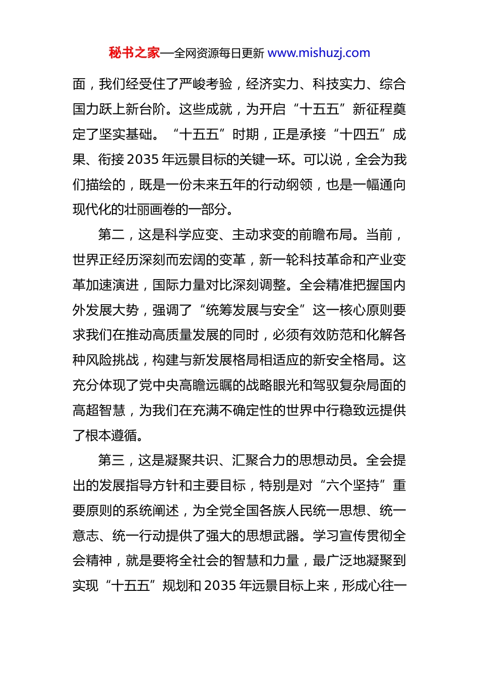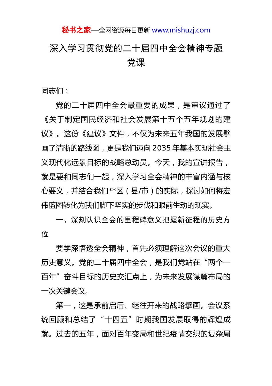 秘书之家—全网资源每日更新 www.mishuzj.com深入学习贯彻党的二十届四中全会精神专题党课 同志们:党的二十届四中全会最重要的成果,是审议通过了《关于制定国民经济和社会发展第十五个五年规划的建议》。这份《建议》文件,不仅为未来五年我国的发展擘画了清晰的路线图,更是我们迈向 2035 年基本实现社会主义现代化远景目标的战略总动员。今天,我的宣讲报告,就是要和同志们一起,深入学习全会精神的丰富内涵与核心要义,并结合我们**区(县/市)的实际,探讨如何将宏伟蓝图转化为我们脚下坚实的步伐和眼前生动的现实。一、深刻认识全会的里程碑意义把握新征程的历史方位要学深悟透全会精神,首先必须理解这次会议的重大历史意义。党的二十届四中全会,是我们党站在“两个一百年”奋斗目标的历史交汇点上,为未来发展谋篇布局的一次关键会议。第一,这是承前启后、继往开来的战略擘画。会议系统回顾和总结了“十四五”时期我国发展取得的辉煌成就。过去的五年,面对百年变局和世纪疫情交织的复杂局秘书之家—全网资源每日更新 www.mishuzj.com面,我们经受住了严峻考验,经济实力、科技实力、综合国力跃上新台阶。这些成就,为开启“十五五”新征程奠定了坚实基础。“十五五”时期,正是承接“十四五”成果、衔接 2035 年远景目标的关键一环。可以说,全会为我们描绘的,既是一份未来五年的行动纲领,也是一幅通向现代化的壮丽画卷的一部分。第二,这是科学应变、主动求变的前瞻布局。当前,世界正经历深刻而宏阔的变革,新一轮科技革命和产业变革加速演进,国际力量对比深刻调整。全会精准把握国内外发展大势,强调了“统筹发展与安全”这一核心原则要求我们在推动高质量发展的同时,必须有效防范和化解各种风险挑战,构建与新发展格局相适应的新安全格局。这充分体现了党中央高瞻远瞩的战略眼光和驾驭复杂局面的高超智慧,为我们在充满不确定性的世界中行稳致远提供了根本遵循。第三,这是凝聚共识、汇聚合力的思想动员。全会提出的发展指导方针和主要目标,特别是对“六个坚持”重要原则的系统阐述,为全党全国各族人民统一思想、统一意志、统一行动提供了强大的思想武器。学习宣传贯彻全会精神,就是要将全社会的智慧和力量,最广泛地凝聚到实现“十五五”规划和 2035 年远景目标上来,形成心往一秘书之家—全网资源每日更新 www.mishuzj.com处想、劲往一处使的磅礴伟力。二、系统把握“六个坚持”的核心要义筑牢高质量发展的思想根基全会精神博大精深,而《人民日报》发表的学习材料中所强调的“六个坚持”,则是我们理解和把握全会精神的“纲”与“魂”。这六条重要原则,深刻揭示了新发展阶段推动高质量发展的内在规律,是我们必须长期坚持并不断丰富发展的宝贵经验。(一)坚持党的全面领导是根本保证。这是“六个坚持”的首要原则。中国共产党领导是中国特色社会主义最本质的特征,是中国特色社会主义制度的最大优势。全会强调,必须将党的领导贯穿于经济社会发展的全过程、各领域。对我们**而言,坚持党的全面领导,就是要不折不扣地贯彻落实党中央的决策部署,确保中央政令畅通、令行禁止。具体到工作中,就是要加强各级党组织的政治功能和组织功能,打造一支忠诚、干净、担当的高素质干部队伍,把党的政治优势、组织优势转化为推动**高质量发展的强大动能。无论是推动重大项目**的落地,还是解决群众急难愁盼的民生问题,都必须在党的统一领导下进行,确保我们的事业始终沿着正确的方向前进。(二)坚持人民至上是价值取向。发展的最终目的是秘书之家—全网资源每日更新 www.mishuzj.com为了人民。全会明确指出,要让现代化建设成果更多更公平惠及全体人民。这一原则,深刻回答了“发展为了谁、依靠谁、成果由谁共享”的根本问题。在我们**的实践中,坚持人民至上,就意味着要把群众的安危冷暖时刻放在心上。我们推动经济发展,不是为了数据好看,而是为了让老百姓的口袋更鼓、日子更甜。我们进行城市建设,不是为了形象工程,而是为了让群众的居住环境更舒适、出行更便捷。这意味着,在制定政策时,要多听听群众的意见;在推进工作时,要多想想群众的...