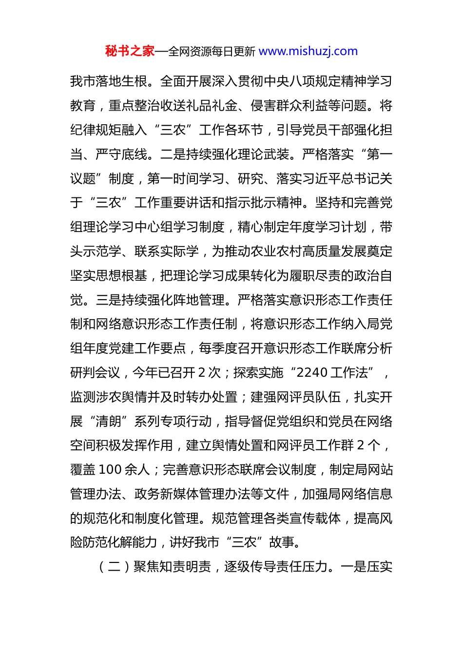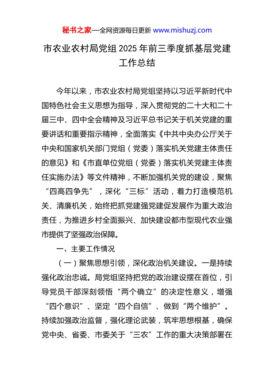 秘书之家—全网资源每日更新 www.mishuzj.com市农业农村局党组 2025 年前三季度抓基层党建工作总结 今年以来,市农业农村局党组坚持以习近平新时代中国特色社会主义思想为指导,深入贯彻党的二十大和二十届三中、四中全会精神及习近平总书记关于机关党建的重要讲话和重要指示精神,全面落实《中共中央办公厅关于中央和国家机关部门党组(党委)落实机关党建主体责任的意见》和《市直单位党组(党委)落实机关党建主体责任实施办法》等文件精神,不断加强机关党的建设,聚焦“四高四争先”,深化“三标”活动,着力打造模范机关、清廉机关,始终把抓党建强党建促发展作为重大政治责任,为推进乡村全面振兴、加快建设都市型现代农业强市提供了坚强政治保障。一、主要工作情况(一)聚焦思想引领,深化政治机关建设。一是持续强化政治忠诚。局党组坚持把党的政治建设摆在首位,引导党员干部深刻领悟“两个确立”的决定性意义,增强“四个意识”、坚定“四个自信”、做到“两个维护”。持续加强政治监督,强化理论武装,筑牢思想根基,确保党中央、省委、市委关于“三农”工作的重大决策部署在秘书之家—全网资源每日更新 www.mishuzj.com我市落地生根。全面开展深入贯彻中央八项规定精神学习教育,重点整治收送礼品礼金、侵害群众利益等问题。将纪律规矩融入“三农”工作各环节,引导党员干部强化担当、严守底线。二是持续强化理论武装。严格落实“第一议题”制度,第一时间学习、研究、落实习近平总书记关于“三农”工作重要讲话和指示批示精神。坚持和完善党组理论学习中心组学习制度,精心制定年度学习计划,带头示范学、联系实际学,为推动农业农村高质量发展奠定坚实思想根基,把理论学习成果转化为履职尽责的政治自觉。三是持续强化阵地管理。严格落实意识形态工作责任制和网络意识形态工作责任制,将意识形态工作纳入局党组年度党建工作要点,每季度召开意识形态工作联席分析研判会议,今年已召开 2 次;探索实施“2240 工作法”,监测涉农舆情并及时转办处置;建强网评员队伍,扎实开展“清朗”系列专项行动,指导督促党组织和党员在网络空间积极发挥作用,建立舆情处置和网评员工作群 2 个,覆盖 100 余人;完善意识形态联席会议制度,制定局网站管理办法、政务新媒体管理办法等文件,加强局网络信息的规范化和制度化管理。规范管理各类宣传载体,提高风险防范化解能力,讲好我市“三农”故事。(二)聚焦知责明责,逐级传导责任压力。一是压实秘书之家—全网资源每日更新 www.mishuzj.com机关党建责任链条。紧紧牵住责任制这个“牛鼻子”,着力构建明责清晰、履责到位、督责有力、考责精准的机关党建责任体系。实化细化责任清单,推动责任层层传递、压力层层传导、任务层层落实。党组书记履行第一责任人职责,对机关党建重点工作、重要事项做到严格把关;党组其他成员严格落实“一岗双责”,加强对分管部门和单位党建工作的督促检查;机关党委落实专门责任,推动从严管理监督向局属单位党组织延伸;机关纪委履行监督责任,强化监督执纪问责;党支部发挥战斗堡垒作用,推动机关党建工作落实落地,形成横向到边、纵向到底齐抓共管的党建责任落实新格局。二是完善制度机制。落实全面从严治党主体责任清单,将专兼职党务工作经历纳入干部履历,严格党费收缴、使用和管理办法等规章制度,不断健全科学完备、有效管用的机关党建工作制度。严格责任考评。强化基层党组织书记抓党建工作述职评议考核,采取自查报告、书记述职、民主测评、个别访谈、领导考评、综合评价等方式进行多维度、立体式考核评价,既看“做没做”更看“好不好”,切实发挥考核指挥棒作用。三是压实各方责任。压实党组主体责任和书记第一责任。坚持把党建工作与业务工作同谋划、同部署、同推进,每半年至少各召开 1 次党组会专题研究机关党建和全面从严秘书之家—全网资源每日更新 www.mishuzj.com治党工作。压实班子成员“一岗双责”。班子成员加强对分管领域党建工作的督促检查,定期听取专题汇报,自上而下层层传导,扛稳压实廉政责任。及时发现和纠正苗头性、倾向性问题,做到抓早抓小、防...
