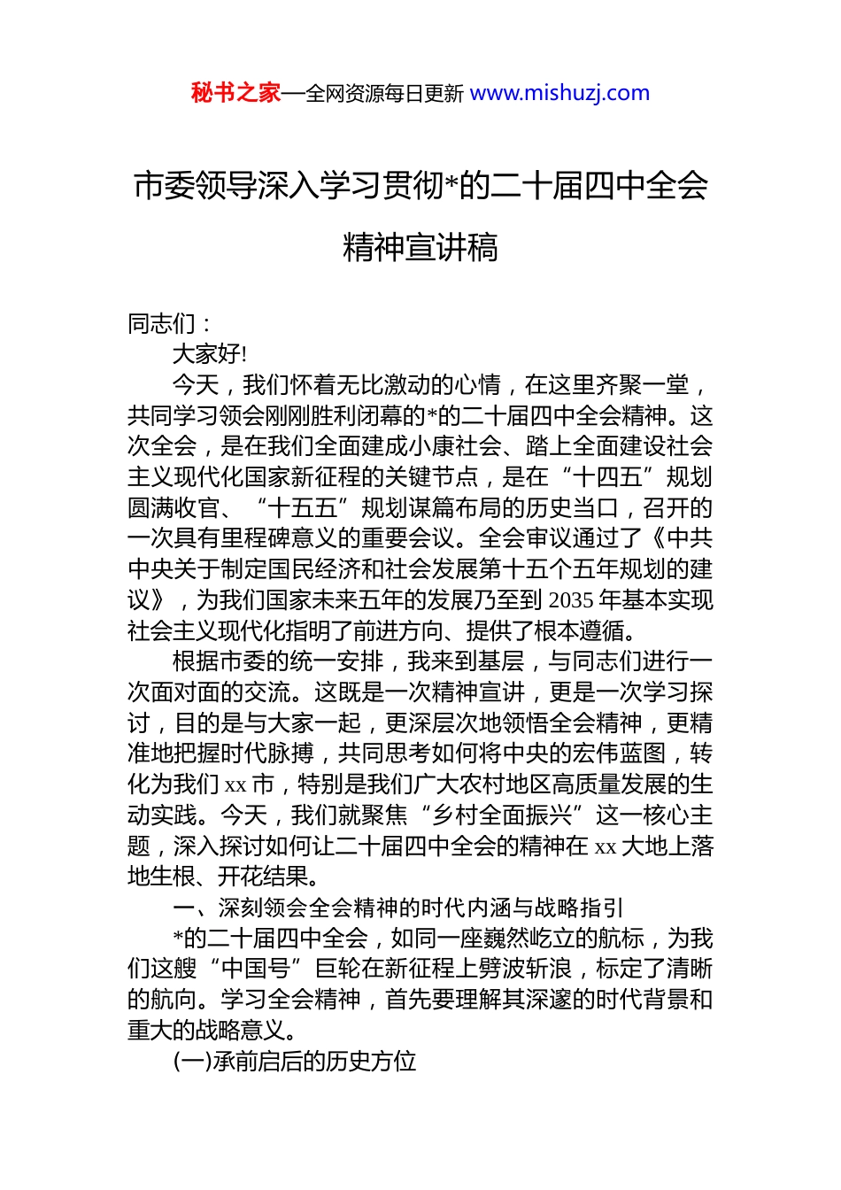 秘书之家—全网资源每日更新 www.mishuzj.com市委领导深入学习贯彻*的二十届四中全会精神宣讲稿同志们:大家好!今天,我们怀着无比激动的心情,在这里齐聚一堂,共同学习领会刚刚胜利闭幕的*的二十届四中全会精神。这次全会,是在我们全面建成小康社会、踏上全面建设社会主义现代化国家新征程的关键节点,是在“十四五”规划圆满收官、“十五五”规划谋篇布局的历史当口,召开的一次具有里程碑意义的重要会议。全会审议通过了《中共中央关于制定国民经济和社会发展第十五个五年规划的建议》,为我们国家未来五年的发展乃至到 2035 年基本实现社会主义现代化指明了前进方向、提供了根本遵循。根据市委的统一安排,我来到基层,与同志们进行一次面对面的交流。这既是一次精神宣讲,更是一次学习探讨,目的是与大家一起,更深层次地领悟全会精神,更精准地把握时代脉搏,共同思考如何将中央的宏伟蓝图,转化为我们 xx 市,特别是我们广大农村地区高质量发展的生动实践。今天,我们就聚焦“乡村全面振兴”这一核心主题,深入探讨如何让二十届四中全会的精神在 xx 大地上落地生根、开花结果。一、深刻领会全会精神的时代内涵与战略指引*的二十届四中全会,如同一座巍然屹立的航标,为我们这艘“中国号”巨轮在新征程上劈波斩浪,标定了清晰的航向。学习全会精神,首先要理解其深邃的时代背景和重大的战略意义。(一)承前启后的历史方位秘书之家—全网资源每日更新 www.mishuzj.com“十五五”时期,是实现第二个百年奋斗目标的起步五年,更是衔接 2035 年基本实现现代化远景目标的关键五年。这次全会通过的《建议》,不仅仅是一份五年的发展规划更是*中央立足“两个大局”,统筹发展与安全,对中国式现代化建设作出的系统性、前瞻性战略部署。它深刻回答了“强国建设、民族复兴”新征程中,未来五年“举什么旗、走什么路、以什么样的精神状态、朝着什么样的目标继续前进”的重大问题。可以说,学懂弄通全会精神,就是抓住了发展的“纲”与“魂”。(二)一以贯之的战略定力全会精神博大精深,但其中一条鲜明的主线,就是对“三农”工作一以贯之的高度重视。从脱贫攻坚到乡村振兴,从十九届五中全会提出“优先发展农业农村,全面推进乡村振兴”,到*的二十大报告专章部署“全面推进乡村振兴”,再到这次二十届四中全会《建议》中强调“促进城乡融合发展,加快建设农业强国”,充分体现了*中央解决好“三农”问题作为全*工作重中之重的战略清醒和历史担当。这绝不是权宜之计,而是着眼于国家长治久安、民族伟大复兴的“国之大者”。*中央高度重视“三农”工作,全会精神为我们做好新时代的乡村工作提供了强大思想武器。我们必须认识到,没有农业农村的现代化,就没有整个国家的现代化;没有农民的富裕富足,就无法实现全体人民的共同富裕。二、聚焦核心任务将全会精神转化为乡村振兴的实践路径蓝图已经绘就,关键在于落实。如何将全会《建议》中关于乡村振兴的部署要求,转化为我们 xx 市可操作、能落地的具体行动?这需要我们紧密结合本地实际,在四个关键领域下足“绣花”功夫。(一)建设现代农业强市筑牢粮食安全与产业兴旺的根基全会《建议》明确提出“加快建设农业强国”。“农秘书之家—全网资源每日更新 www.mishuzj.com业强国”的内涵,绝不仅仅是产量的增加,更是产业竞争力、科技创新力、可持续发展能力的全面提升。对我们 xx市而言,就是要全力发展“科技农业、绿色农业、质量农业、品牌农业”,提升农业综合生产能力和质量效益。首先,以科技创新为引擎,驱动农业现代化。传统的“面朝黄土背朝天”模式已无法适应新时代的要求。未来五年,要将农业科技创新摆在更加突出的位置。要推动数字技术与农业生产深度融合,在 xx 市有条件的地区建立“智慧农业”示范区,利用物联网、大数据、人工智能等技术,对农作物的生长环境、病虫害防治、水肥管理进行精准调控。同时,要加强与 xx 省内外农业科研院所的合作,引进和培育一批适合本地气候土壤的优良品种,特别是在高附加值经济作物上实现突破,让科技真正成为农民增收致富的“金钥匙”。其次,以绿色发展为底色,守护农...