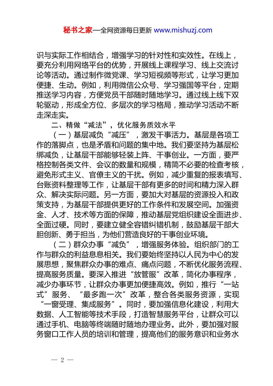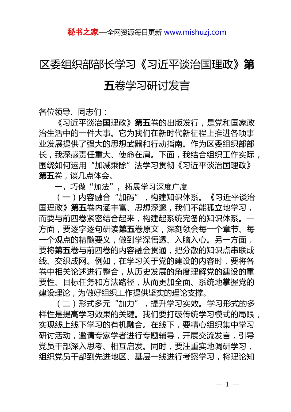 秘书之家—全网资源每日更新 www.mishuzj.com区委组织部部长学习《习近平谈治国理政》第五卷学习研讨发言各位领导、同志们:《习近平谈治国理政》第五卷的出版发行,是党和国家政治生活中的一件大事。它为我们在新时代新征程上推进各项事业发展提供了强大的思想武器和行动指南。作为区委组织部部长,我深感责任重大、使命在肩。下面,我结合组织工作实际,围绕如何运用“加减乘除”法学习贯彻《习近平谈治国理政》第五卷,谈几点体会。一、巧做“加法”,拓展学习深度广度(一)内容融合“加码”,构建知识体系。《习近平谈治国理政》第五卷内涵丰富、思想深邃,我们不能孤立地学习,而要与前四卷紧密结合起来,构建起系统完备的知识体系。一方面,要逐字逐句研读第五卷原文,深刻领会每一个章节、每一个观点的精髓要义,做到学深悟透、入脑入心。另一方面,要将第五卷与前四卷的内容融会贯通,把分散的知识点串联成线、交织成网。例如,在学习关于党的建设的内容时,要将各卷中相关论述进行整合,从历史发展的角度理解党的建设的重要性、目标任务和方法路径,从而更加全面、系统地掌握党的建设理论,为做好组织工作提供坚实的理论支撑。(二)形式多元“加力”,提升学习实效。学习形式的多样性是提高学习效果的关键。我们要打破传统学习模式的局限,实现线上线下学习的有机融合。在线下,要精心组织集中学习研讨活动,邀请专家学者进行专题辅导,开展交流发言,引导党员干部深入思考、相互启发。同时,要注重实地调研学习,组织党员干部到先进地区、基层一线进行考察学习,将理论知— 1 —秘书之家—全网资源每日更新 www.mishuzj.com识与实际工作相结合,增强学习的针对性和实效性。在线上,要充分利用网络平台的优势,开展线上课程学习、线上交流讨论等活动。通过制作微党课、学习短视频等形式,让学习更加便捷、生动。例如,利用微信公众号、学习强国等平台,定期推送学习内容,方便党员干部随时随地学习。通过线上线下双轮驱动,形成全方位、多层次的学习格局,推动学习活动不断走深走实。二、精做“减法”,优化服务质效水平(一)基层减负“减压”,激发干事活力。基层是各项工作的落脚点,也是矛盾和问题的集中地。我们要坚持为基层松绑减负,让基层干部能够轻装上阵、干事创业。一方面,要严格控制各类文件、会议的数量和规模,精简不必要的检查考核,避免形式主义、官僚主义的干扰。例如,减少重复的报表填写、台账资料整理等工作,让基层干部有更多的时间和精力深入群众、解决实际问题。另一方面,要加大对基层的资源投入和政策支持,为基层干部提供更好的工作条件和发展空间。加强资金、人才、技术等方面的保障,推动基层党组织建设全面进步、全面过硬。同时,要建立健全容错纠错机制,鼓励基层干部大胆创新、勇于担当,为他们营造良好的干事创业环境。(二)群众办事“减负”,增强服务体验。组织部门的工作与群众的利益息息相关。我们要始终坚持以人民为中心的发展思想,聚焦群众办事的难点、痛点问题,不断优化服务流程、提高服务质量。要深入推进“放管服”改革,简化办事程序,减少办事环节,让群众办事更加便捷高效。例如,推行“一站式”服务、“最多跑一次”改革,整合各类服务资源,实现“一窗受理、集成服务”。同时,要加强信息化建设,利用大数据、人工智能等技术手段,打造智慧服务平台,让群众可以通过手机、电脑等终端随时随地办理业务。此外,要加强对服务窗口工作人员的培训和管理,提高他们的服务意识和业务水— 2 —秘书之家—全网资源每日更新 www.mishuzj.com平,做到热情服务、周到服务,让群众感受到组织部门的关怀和温暖。三、善做“乘法”,推动工作创新发展(一)理论实践“相乘”,激发工作动力。学习的目的在于应用,在于推动工作。我们要将学习《习近平谈治国理政》第五卷的成果转化为推动组织工作创新发展的强大动力。要深刻领会书中蕴含的新思想、新观点、新论断,将其运用到实际工作中去。例如,在干部选拔任用工作中,要坚持德才兼备、以德为先、五湖四海、任人唯贤的原则,选拔出忠诚干净担当的高素质干部队伍。在基层党组...