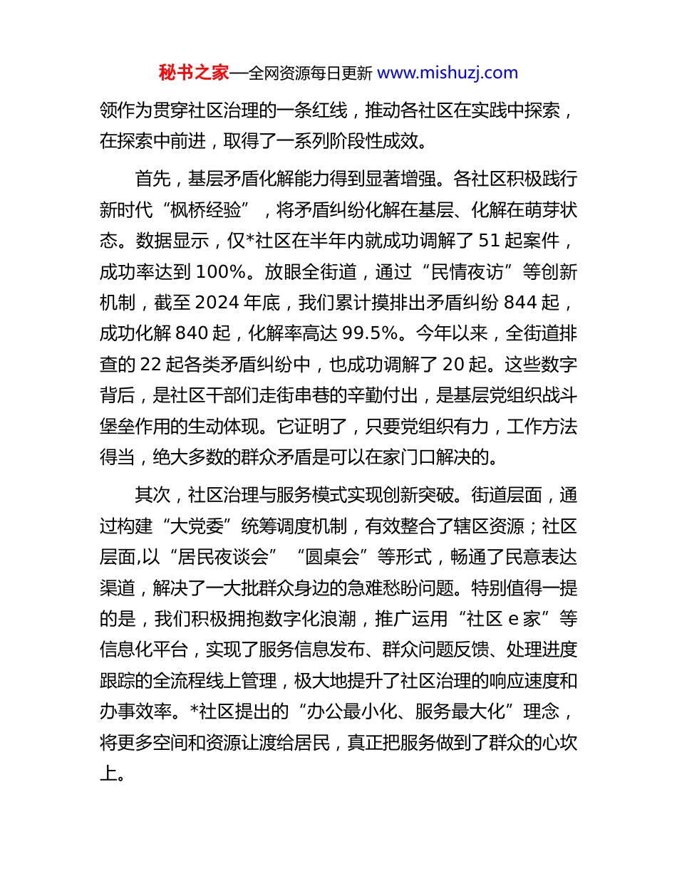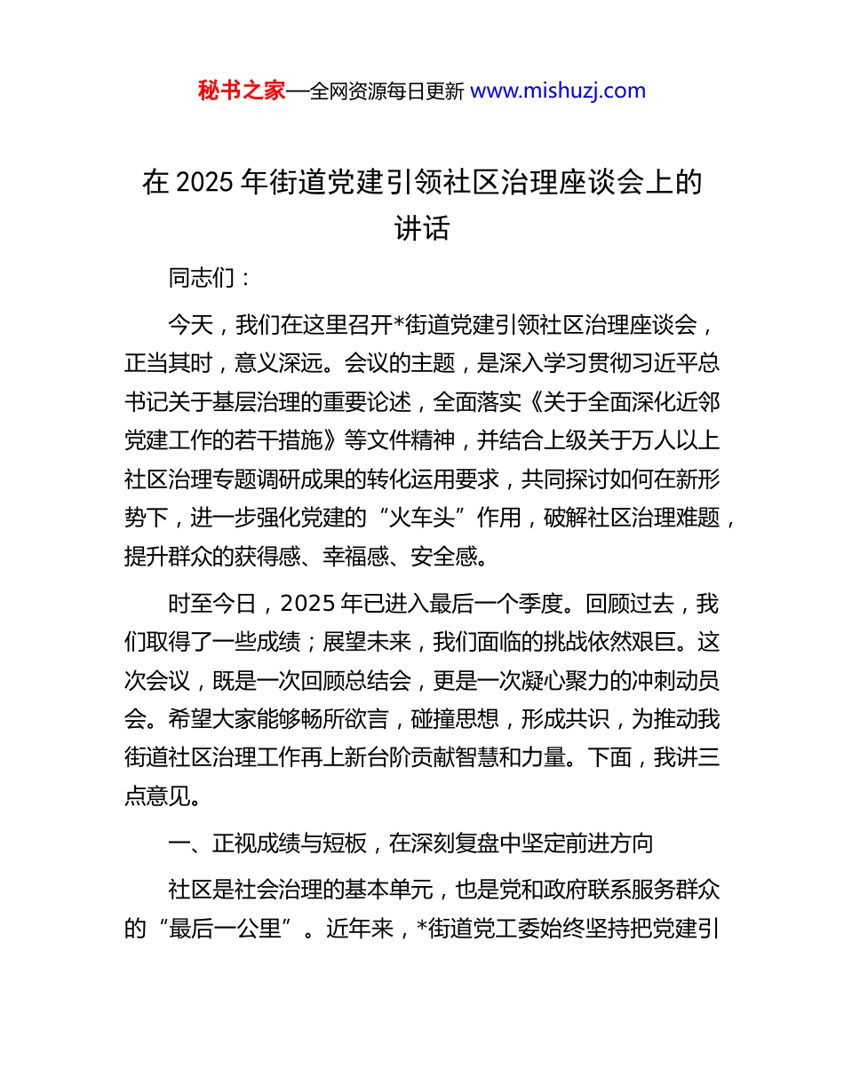 秘书之家—全网资源每日更新 www.mishuzj.com在 2025 年街道党建引领社区治理座谈会上的讲话同志们:今天,我们在这里召开*街道党建引领社区治理座谈会,正当其时,意义深远。会议的主题,是深入学习贯彻习近平总书记关于基层治理的重要论述,全面落实《关于全面深化近邻党建工作的若干措施》等文件精神,并结合上级关于万人以上社区治理专题调研成果的转化运用要求,共同探讨如何在新形势下,进一步强化党建的“火车头”作用,破解社区治理难题,提升群众的获得感、幸福感、安全感。时至今日,2025 年已进入最后一个季度。回顾过去,我们取得了一些成绩;展望未来,我们面临的挑战依然艰巨。这次会议,既是一次回顾总结会,更是一次凝心聚力的冲刺动员会。希望大家能够畅所欲言,碰撞思想,形成共识,为推动我街道社区治理工作再上新台阶贡献智慧和力量。下面,我讲三点意见。一、正视成绩与短板,在深刻复盘中坚定前进方向社区是社会治理的基本单元,也是党和政府联系服务群众的“最后一公里”。近年来,*街道党工委始终坚持把党建引秘书之家—全网资源每日更新 www.mishuzj.com领作为贯穿社区治理的一条红线,推动各社区在实践中探索,在探索中前进,取得了一系列阶段性成效。首先,基层矛盾化解能力得到显著增强。各社区积极践行新时代“枫桥经验”,将矛盾纠纷化解在基层、化解在萌芽状态。数据显示,仅*社区在半年内就成功调解了 51 起案件,成功率达到 100%。放眼全街道,通过“民情夜访”等创新机制,截至 2024 年底,我们累计摸排出矛盾纠纷 844 起,成功化解 840 起,化解率高达 99.5%。今年以来,全街道排查的 22 起各类矛盾纠纷中,也成功调解了 20 起。这些数字背后,是社区干部们走街串巷的辛勤付出,是基层党组织战斗堡垒作用的生动体现。它证明了,只要党组织有力,工作方法得当,绝大多数的群众矛盾是可以在家门口解决的。其次,社区治理与服务模式实现创新突破。街道层面,通过构建“大党委”统筹调度机制,有效整合了辖区资源;社区层面,以“居民夜谈会”“圆桌会”等形式,畅通了民意表达渠道,解决了一大批群众身边的急难愁盼问题。特别值得一提的是,我们积极拥抱数字化浪潮,推广运用“社区 e 家”等信息化平台,实现了服务信息发布、群众问题反馈、处理进度跟踪的全流程线上管理,极大地提升了社区治理的响应速度和办事效率。*社区提出的“办公最小化、服务最大化”理念,将更多空间和资源让渡给居民,真正把服务做到了群众的心坎上。秘书之家—全网资源每日更新 www.mishuzj.com最后,基层队伍建设取得长足进步。一方面,通过开展常态化业务培训与实战演练,社区工作人员的专业素养和应急处理能力大幅提升。在近期组织的消防安全演练中,各社区工作人员能够迅速响应、科学处置,展现了良好的业务水平。另一方面,我们注重从优秀青年中培养社区骨干,建立了一支年龄结构合理、充满活力的社区工作者队伍。这支队伍不仅熟悉社区情况,更懂得如何与居民沟通,如何调动各方资源,为社区治理注入了新的活力。同时,我们还建立了完善的激励机制,鼓励社区工作者扎根基层、服务群众,形成了比学赶超的良好氛围。然而,在肯定成绩的同时,我们必须清醒地认识到存在的短板和深层次问题。这也是我们今天坐下来共同研究解决的核心议题。第一,发展不平衡问题依然突出。各社区之间在资源禀赋、干部能力、工作基础等方面存在差距,“头部”社区一路领跑,“腰部”社区动力不足,“尾部”社区尚在追赶的现象客观存在。有的社区品牌响亮,有的社区却特色不明;有的社区善于整合资源,有的社区则习惯于“等靠要”。这种不平衡,制约了街道整体治理水平的提升。第二,数据支撑体系尚不健全。当前,我们对工作的评判,更多依赖于定性感受和个案总结,缺乏一套科学、量化、持续的评估体系。比如,公共服务的覆盖率到底是多少?我们的医疗、教育、养老服务具体覆盖了多少居民?虽然历史数据显示,我们在 2011 年就实现秘书之家—全网资源每日更新 www.mishuzj.com了农村合作医疗参保率 100%。没有精准的数据,就如同“盲人摸象”,难以做到精准施策...