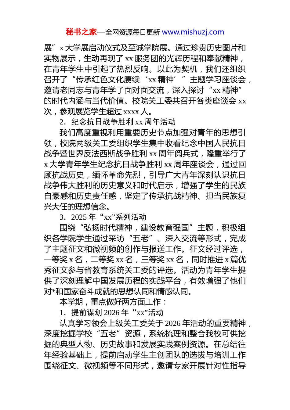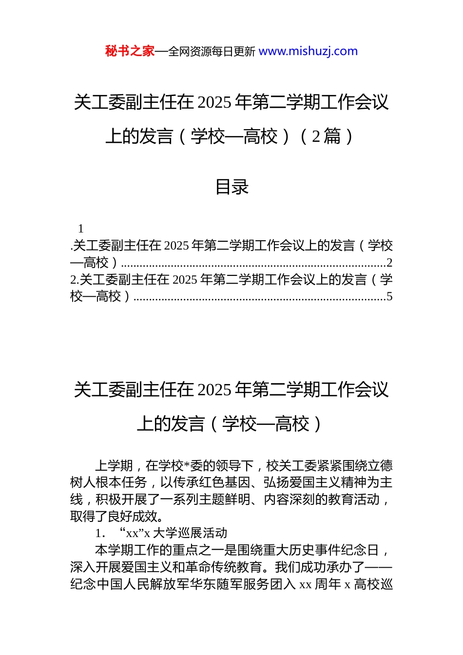 秘书之家—全网资源每日更新 www.mishuzj.com关工委副主任在 2025 年第二学期工作会议上的发言(学校—高校)(2 篇)目录1.关工委副主任在 2025 年第二学期工作会议上的发言(学校—高校).....................................................................................22.关工委副主任在 2025 年第二学期工作会议上的发言(学校—高校).................................................................................5关工委副主任在 2025 年第二学期工作会议上的发言(学校—高校)上学期,在学校*委的领导下,校关工委紧紧围绕立德树人根本任务,以传承红色基因、弘扬爱国主义精神为主线,积极开展了一系列主题鲜明、内容深刻的教育活动,取得了良好成效。1.“xx”x 大学巡展活动本学期工作的重点之一是围绕重大历史事件纪念日,深入开展爱国主义和革命传统教育。我们成功承办了——纪念中国人民解放军华东随军服务团入 xx 周年 x 高校巡秘书之家—全网资源每日更新 www.mishuzj.com展”x 大学展启动仪式及至诚学院展。通过珍贵历史图片和实物展示,生动再现了 xx 服务团的光辉历程和奉献精神,在青年学生中引起了热烈反响。以此为契机,我们还组织召开了“传承红色文化赓续‘xx 精神’”主题学习座谈会,邀请老同志与青年学子面对面交流,深入探讨“xx 精神”的时代内涵与当代价值。校院关工委共召开各类座谈会 xx次,参观展览学生超过 xxxx 人。2.纪念抗日战争胜利 xx 周年活动我们高度重视利用重要历史节点加强对青年的思想引领,校院两级关工委组织学生集中收看纪念中国人民抗日战争暨世界反法西斯战争胜利 xx 周年阅兵式,隆重举行了x 大学青年学生纪念抗日战争胜利 xx 周年座谈会,通过回顾抗战历史,缅怀革命先烈,引导广大青年深刻认识抗日战争伟大胜利的历史意义和时代启示,增强了学生的民族自豪感和历史责任感,坚定了传承抗战精神、担当民族复兴大任的理想信念。3.2025 年“xx”系列活动围绕“弘扬时代精神,建设教育强国”主题,积极组织各学院学生通过采访“五老”、深入交流等形式,完成了主题征文和微视频的创作与报送工作。征文经过评选,一等奖 x 名,二等奖 xx 名,三等奖 xx 名,同时推进 x 篇优秀征文参与省教育系统关工委的评选。活动为青年学生提供了深刻理解中国发展历程的实践平台,有效增强了他们对*和国家奋斗成就的思想认同和情感认同。本学期,重点做好两方面工作:1.提前谋划 2026 年“xx”活动认真学习领会上级关工委关于 2026 年活动的重要精神,深度挖掘学校“五老”资源,系统梳理和整合我校可供挖掘的典型人物、历史故事和发展实践案例资源。在总结往年经验基础上,提前启动学生主创团队的选拔与培训工作围绕征文、微视频等不同形式,邀请专家开展针对性指导秘书之家—全网资源每日更新 www.mishuzj.com鼓励跨学院、跨专业组队,运用新技术新手段,力求推出一批具有思想深度、教育温度和传播效度的优秀作品,生动展现中国式现代化建设的伟大成就。2.加强关工委学生宣传队伍建设选拔文字功底好、具备新媒体技能或摄影摄像特长的学生骨干,组建校院两级关工委学生宣传队伍,邀请校内外专家、媒体记者等,围绕征文撰写、摄影摄像、短视频制作、公众号运营等内容进行培训及系统指导。通过培训提升学生的策划、采编和传播能力,打造一支素质过硬的学生宣传队伍。关工委副主任在 2025 年第二学期工作会议上的发言(学校—高校)近年来,在学校*委的领导下,校关工委紧紧围绕立德树人根本任务,抓好基层组织建设及基层“五好”关工委建设,推动关工委专家工作室建设,取得了良好成效。一、关工委基层组织建设及基层“五好”关工委建设我校始终以“五好”关工委建设标准为指引,以组织根基为基,筑牢“五好”建设框架。“五好”关工委的核心是“组织健全”。学校*委将关工委工作纳入 dj 总体部署,构建起“校*委副书记牵头、老同志主力参与、职能部门协同”的校院两级组织体系。xx 个学院全部建成二级关工委,实现了“有班子、有队伍、有阵地”的基础要求。20xx 年,我校...