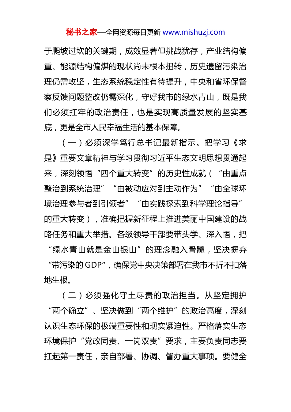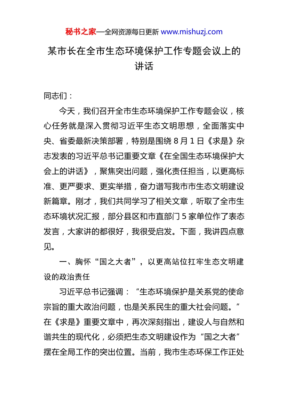 秘书之家—全网资源每日更新 www.mishuzj.com某市长在全市生态环境保护工作专题会议上的讲话 同志们:今天,我们召开全市生态环境保护工作专题会议,核心任务就是深入贯彻习近平生态文明思想,全面落实中央、省委最新决策部署,特别是围绕 8 月 1 日《求是》杂志发表的习近平总书记重要文章《在全国生态环境保护大会上的讲话》,聚焦突出问题,强化责任担当,以更高标准、更严要求、更实举措,奋力谱写我市市生态文明建设新篇章。刚才,我们共同学习了相关文章,听取了全市生态环境状况汇报,部分县区和市直部门 5 家单位作了表态发言,大家讲的都很好,我很受启发。下面,我讲四点意见。一、胸怀“国之大者”,以更高站位扛牢生态文明建设的政治责任习近平总书记强调:“生态环境保护是关系党的使命宗旨的重大政治问题,也是关系民生的重大社会问题。”在《求是》重要文章中,再次深刻指出,建设人与自然和谐共生的现代化,必须把生态文明建设作为“国之大者”摆在全局工作的突出位置。当前,我市生态环保工作正处秘书之家—全网资源每日更新 www.mishuzj.com于爬坡过坎的关键期,成效显著但挑战犹存,产业结构偏重、能源结构偏煤的现状尚未根本扭转,历史遗留污染治理仍需攻坚,生态系统稳定性有待提升,中央和省环保督察反馈问题整改仍需深化,守好我市的绿水青山,既是我们必须扛牢的政治责任,也是实现高质量发展的坚实基底,更是全市人民幸福生活的基本保障。(一)必须深学笃行总书记最新指示。把学习《求是》重要文章精神与学习贯彻习近平生态文明思想贯通起来,深刻领悟“四个重大转变”的历史性成就(“由重点整治到系统治理”“由被动应对到主动作为”“由全球环境治理参与者到引领者”“由实践探索到科学理论指导”的重大转变),准确把握新征程上推进美丽中国建设的战略任务和重大举措。各级领导干部要带头学、深入悟,把“绿水青山就是金山银山”的理念融入骨髓,坚决摒弃“带污染的 GDP”,确保党中央决策部署在我市不折不扣落地生根。(二)必须强化守土尽责的政治担当。从坚定拥护“两个确立”、坚决做到“两个维护”的政治高度,深刻认识生态环保的极端重要性和现实紧迫性。严格落实生态环境保护“党政同责、一岗双责”要求,主要负责同志要扛起第一责任,亲自部署、协调、督办重大事项。要健全秘书之家—全网资源每日更新 www.mishuzj.com从市到村的责任链条,层层传导压力,决不允许责任悬空、落实打折,对失职失责的严肃追责问责。(三)必须坚持人民至上的价值追求。要把解决群众反映强烈的突出环境问题作为民生优先领域,像保护眼睛一样保护生态环境,像对待生命一样对待生态环境。聚焦“呼吸清新空气、喝上干净水、吃上放心食物、享受优美环境”的核心诉求,紧盯空气质量改善、漳泽湖等重点水体治理、土壤安全利用、噪声油烟扰民等痛点难点问题,持续发力,以对历史、对人民、对子孙后代高度负责的态度,把好事办好、实事办实,不断提升群众的生态环境获得感、幸福感、安全感。二、打赢“攻坚之战”,以更实举措推动生态环境质量持续改善习近平总书记指出:“要持续深入打好污染防治攻坚战,坚持精准治污、科学治污、依法治污,保持力度、延伸深度、拓展广度。”我们要坚持问题导向、目标导向、结果导向,聚焦我市突出短板,精准发力、系统施治,推动污染防治攻坚战向纵深发展。(一)向“蓝天白云”要更高颜值。持续深化重点区域大气污染联防联控,要抓结构优化,严控“两高一低”项目准入,稳步推进钢铁、焦化、水泥等行业超低排放改秘书之家—全网资源每日更新 www.mishuzj.com造全覆盖,加快能源结构向绿电、清洁能源转型。要抓精准治理,强化 VOCs(挥发性有机物)深度治理和氨排放控制试点,提升扬尘、餐饮油烟、恶臭污染精细化管控水平,加强柴油货车和非道路移动机械全流程监管,推动港口、重点企业大宗货物清洁运输。要抓协同治理,依法科学管控秸秆禁烧,持续开展“噪声治理”行动,推动解决群众身边的环境“烦心事”。(二)让“碧水清流”成更美常态。水环境治理重在系统、要在长效,要保饮水安全,完成乡镇级水源保护区规范化建...