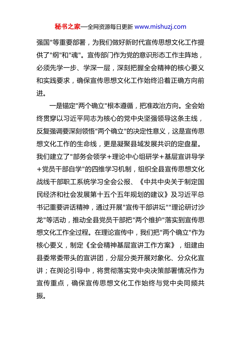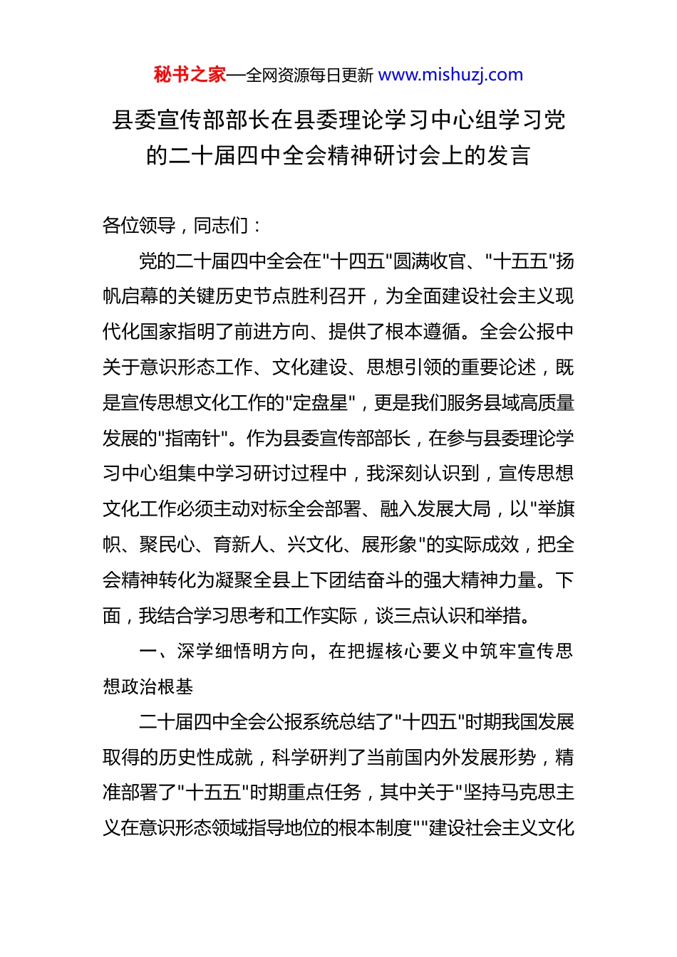 秘书之家—全网资源每日更新 www.mishuzj.com县委宣传部部长在县委理论学习中心组学习党的二十届四中全会精神研讨会上的发言 各位领导,同志们:党的二十届四中全会在"十四五"圆满收官、"十五五"扬帆启幕的关键历史节点胜利召开,为全面建设社会主义现代化国家指明了前进方向、提供了根本遵循。全会公报中关于意识形态工作、文化建设、思想引领的重要论述,既是宣传思想文化工作的"定盘星",更是我们服务县域高质量发展的"指南针"。作为县委宣传部部长,在参与县委理论学习中心组集中学习研讨过程中,我深刻认识到,宣传思想文化工作必须主动对标全会部署、融入发展大局,以"举旗帜、聚民心、育新人、兴文化、展形象"的实际成效,把全会精神转化为凝聚全县上下团结奋斗的强大精神力量。下面,我结合学习思考和工作实际,谈三点认识和举措。一、深学细悟明方向,在把握核心要义中筑牢宣传思想政治根基二十届四中全会公报系统总结了"十四五"时期我国发展取得的历史性成就,科学研判了当前国内外发展形势,精准部署了"十五五"时期重点任务,其中关于"坚持马克思主义在意识形态领域指导地位的根本制度""建设社会主义文化秘书之家—全网资源每日更新 www.mishuzj.com强国"等重要部署,为我们做好新时代宣传思想文化工作提供了"纲"和"魂"。宣传部门作为党的意识形态工作主阵地,必须先学一步、学深一层,深刻把握全会精神的核心要义和实践要求,确保宣传思想文化工作始终沿着正确方向前进。一是锚定"两个确立"根本遵循,把准政治方向。全会始终贯穿以习近平同志为核心的党中央坚强领导这条主线,反复强调要深刻领悟"两个确立"的决定性意义,这是宣传思想文化工作的生命线,更是凝聚县域发展共识的定盘星。我们建立了"部务会领学+理论中心组研学+基层宣讲导学+党员干部自学"的四维学习机制,组织全县宣传思想文化战线干部职工系统学习全会公报、《中共中央关于制定国民经济和社会发展第十五个五年规划的建议》及习近平总书记重要讲话精神,通过开展"宣传干部讲坛""理论研讨沙龙"等活动,推动全县党员干部把"两个维护"落实到宣传思想文化工作全过程。在理论宣传中,我们把"两个确立"作为核心要义,制定《全会精神基层宣讲工作方案》,组建由县委常委带头的宣讲团,分层分类开展对象化、分众化宣讲;在舆论引导中,将贯彻落实党中央决策部署情况作为宣传重点,确保宣传思想文化工作始终与党中央同频共振。秘书之家—全网资源每日更新 www.mishuzj.com二是紧扣"高质量发展"首要任务,找准服务定位。全会明确提出"十五五"时期经济社会发展必须坚持高质量发展主题,这与我县实施的工业强县、农业稳县、文旅兴县"三大强县战略"高度契合。作为意识形态工作主管部门,我们深刻认识到,宣传思想文化工作服务高质量发展,关键要实现"三个聚焦":聚焦现代化产业体系建设,重点宣传工业转型、农业升级的创新举措和成效;聚焦农业农村现代化,深入解读乡村振兴政策,讲好农村发展故事;聚焦共同富裕目标,大力宣传民生改善成果,增强群众获得感。我们已牵头开展"宣传思想文化工作服务高质量发展"专题调研,梳理出舆论引导针对性不强、文化产业发展滞后、基层宣讲效能不足等 5 类 16 项问题,形成问题清单、责任清单和整改台账,为精准施策奠定坚实基础。三是把握"自我革命"战略要求,夯实工作根基。全会鲜明提出"坚持以党的自我革命引领社会革命,持之以恒推进全面从严治党",这对宣传思想文化工作提出了更高标准。我们深刻认识到,县域宣传思想文化领域的自我革命,关键要解决阵地管理不严格、队伍能力不适应、工作机制不健全等问题。为此,我们将开展"宣传思想文化工作提质增效年"活动,重点整治媒体融合发展不深入、新兴领域宣传覆盖不到位、基层文化设施利用率不高等问题,以自我革秘书之家—全网资源每日更新 www.mishuzj.com命精神推动宣传思想文化工作守正创新,为高质量发展提供坚强思想保证和精神支撑。二、守正创新强作为,在服务发展大局中彰显宣传思想文化价值全会强调,要"坚持和加强党中央集中统一领导,巩固壮大奋进新时代的主流思想舆论,培育和践行社会主义核心价值观"。宣传...